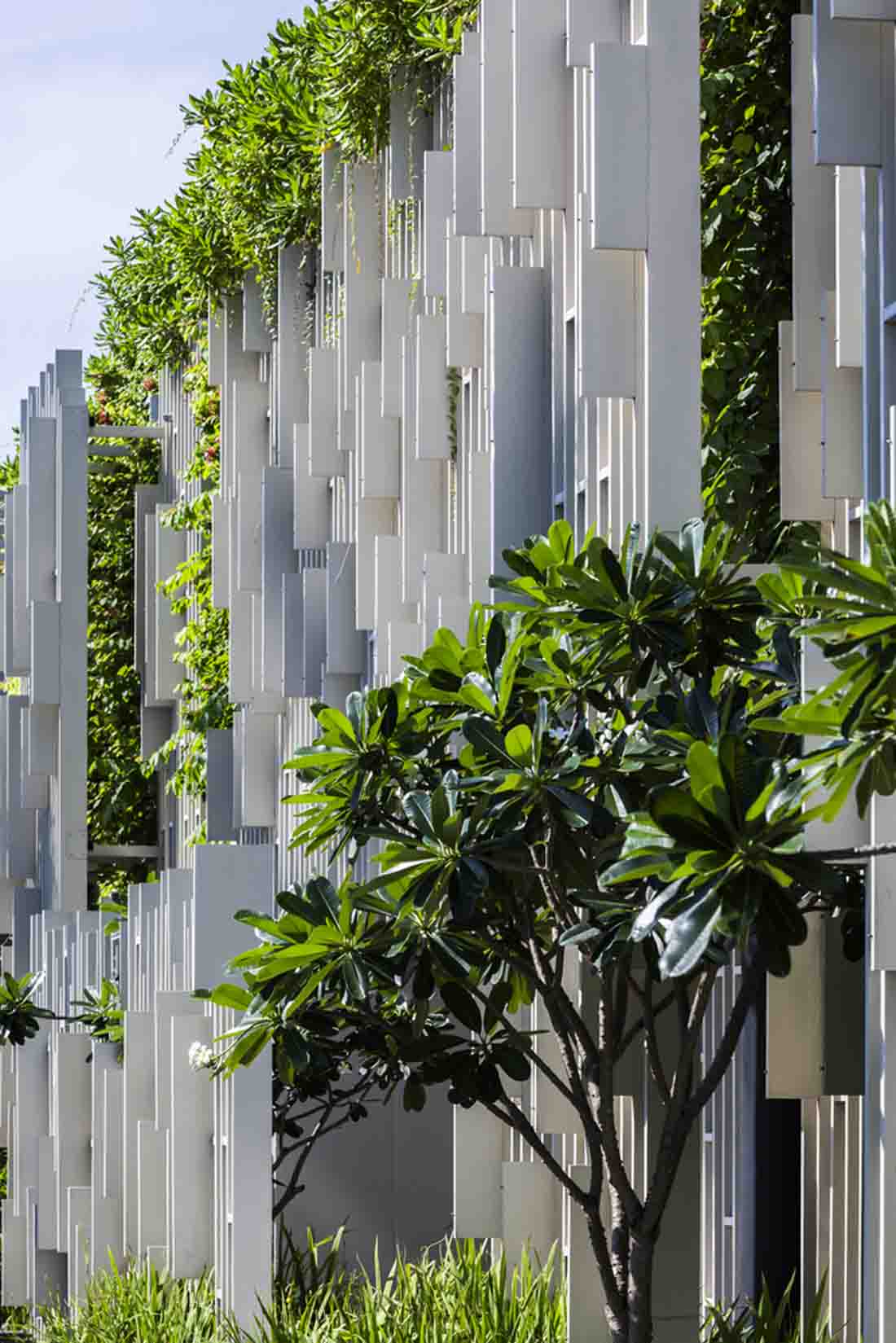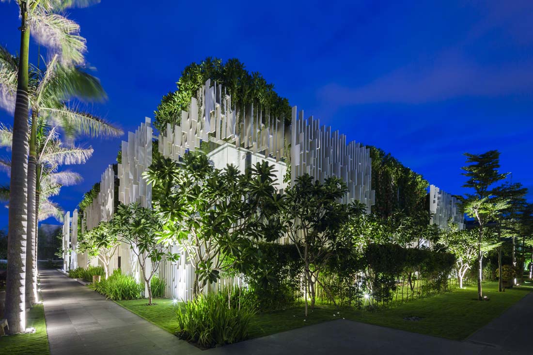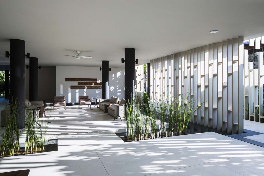 不同区域的水流彼此顺畅地流淌,美丽的风景创造了通往梦幻般体验的奇妙旅程。外墙由格子图案和垂直景观组成,这些垂直景观将强烈的热带阳光过滤成斑驳的墙壁上令人愉悦的光影。精心布置了各种植物,并成为建筑屏风的一部分。