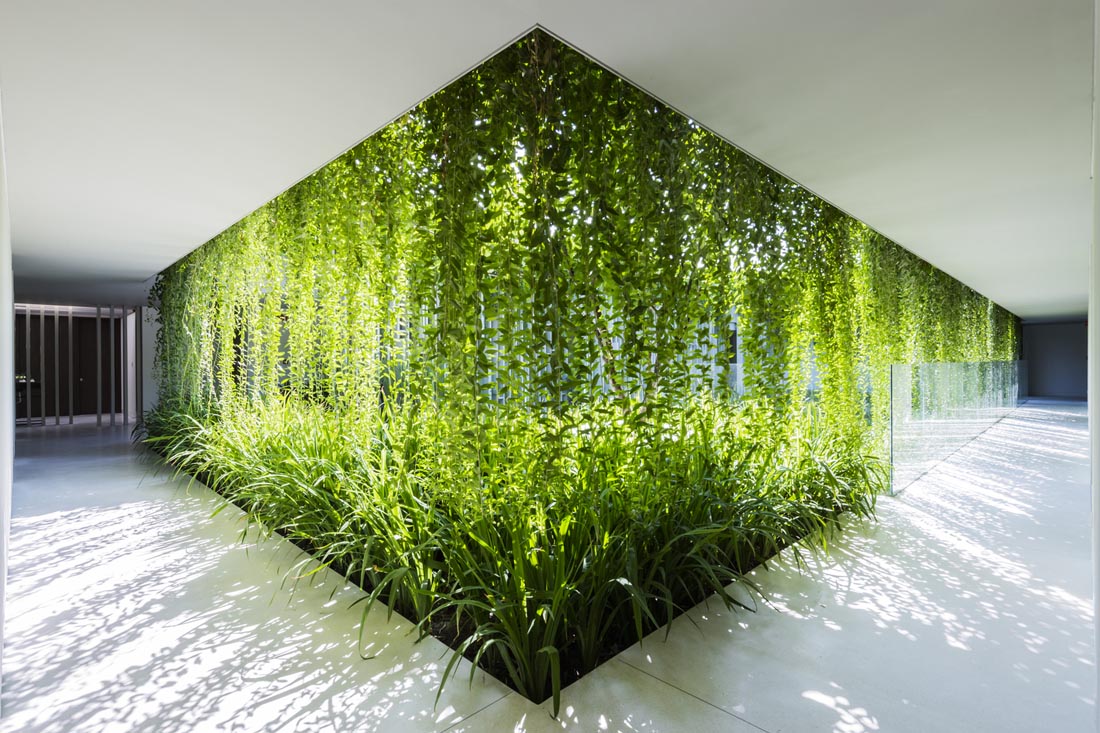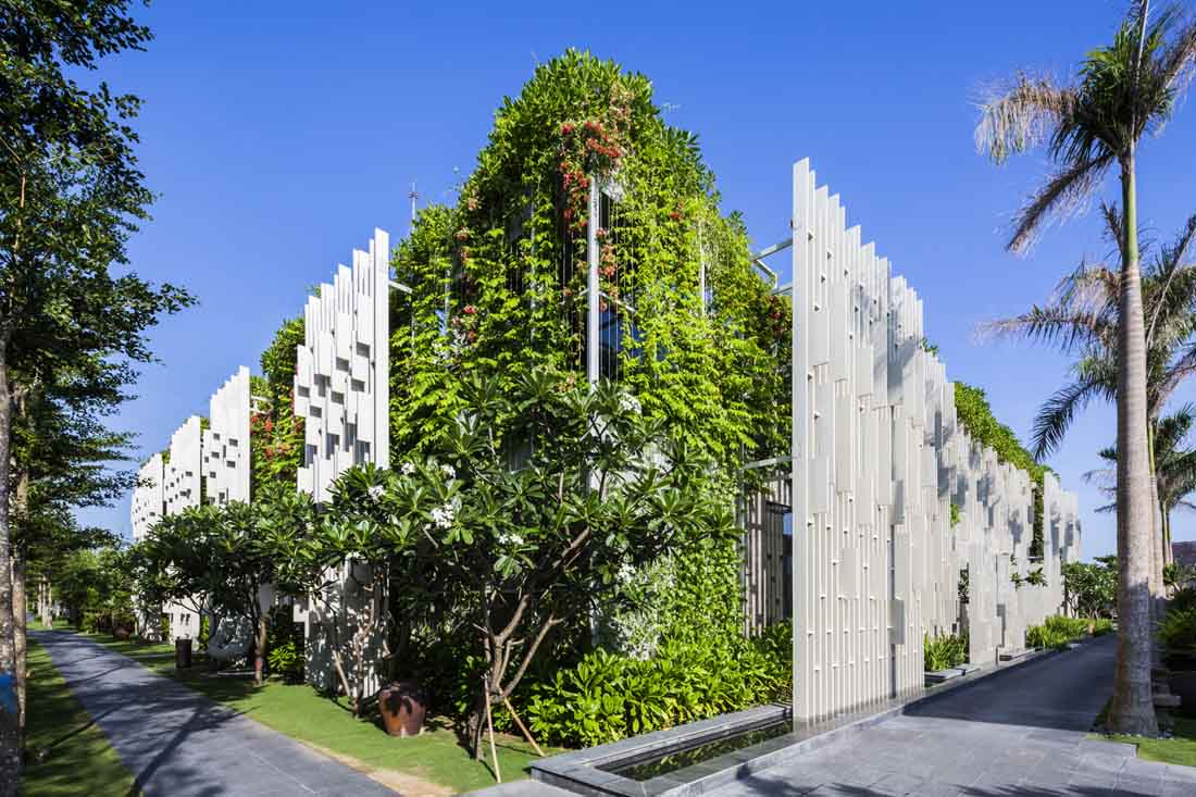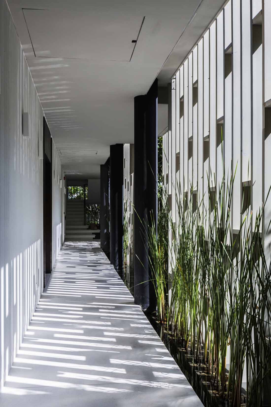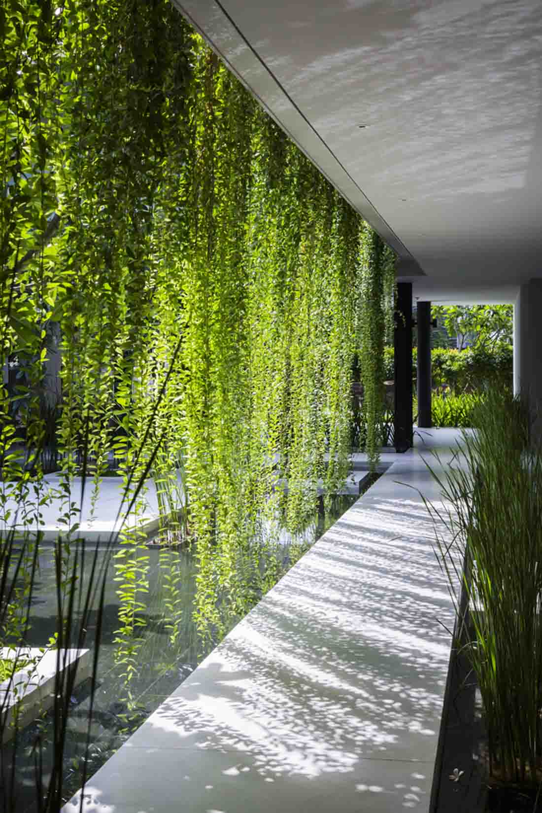 不同区域的水流彼此顺畅地流淌,美丽的风景创造了通往梦幻般体验的奇妙旅程。外墙由格子图案和垂直景观组成,这些垂直景观将强烈的热带阳光过滤成斑驳的墙壁上令人愉悦的光影。精心布置了各种植物,并成为建筑屏风的一部分。