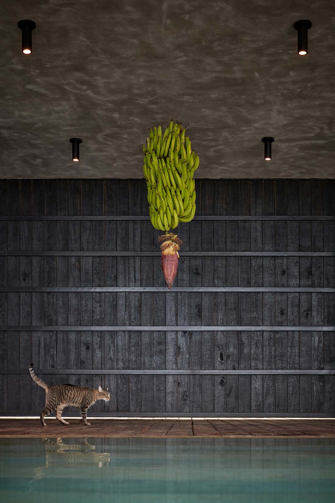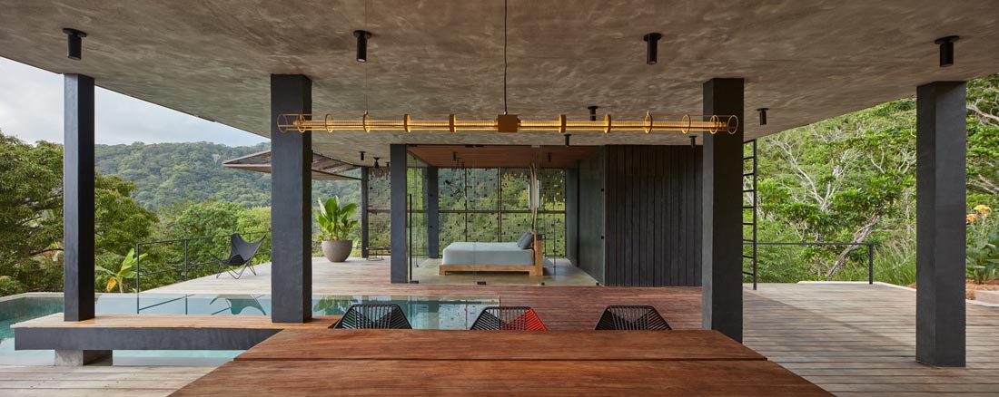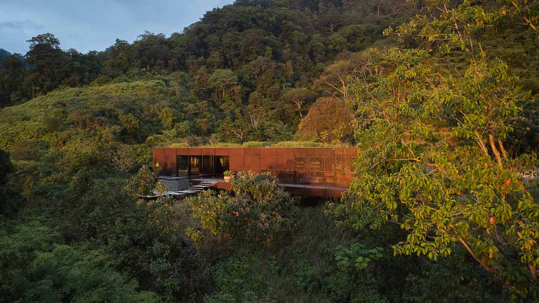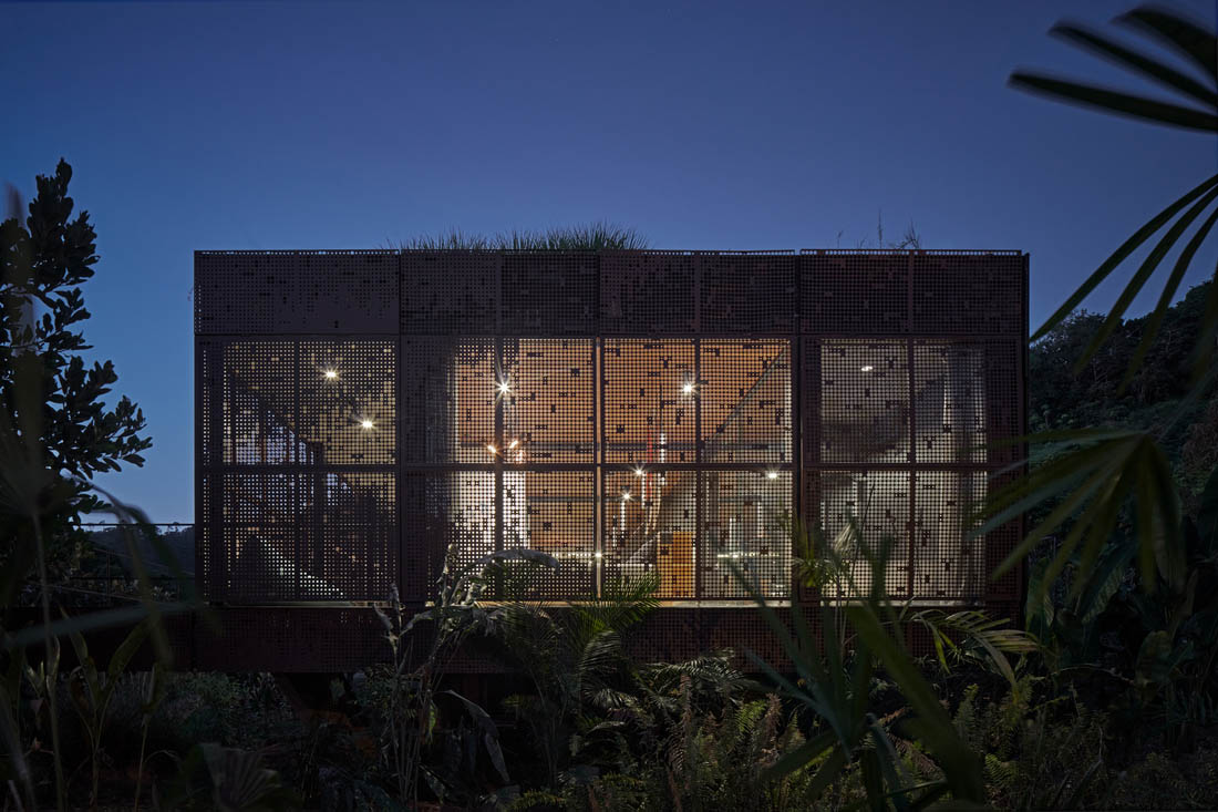 作室别墅被设计为投资者及其家人的私人住宅,这个26米长的棱柱形物体坐落在陡峭的斜坡上,部分悬浮在茂密的热带植被上。从外面看,只有远处的海洋或绿色的山丘可以看到。面向车道的后墙和相邻的别墅无窗设计以保护隐私。