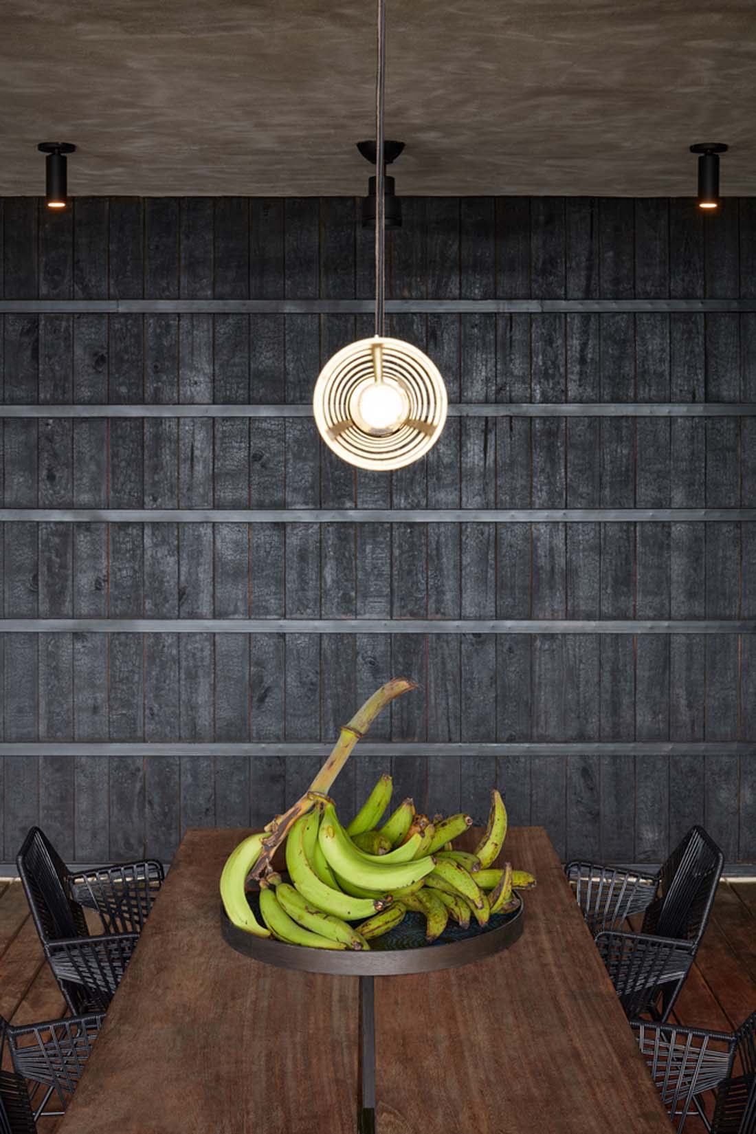 墙面色彩与绿色屋顶相结合,使别墅能够与周围环境真正融合。面向海洋和丛林的立面配有大尺寸的铝制穿孔区域。如果将其拉起,则它们可以兼作檐篷。在每个部分中,穿孔的规模和样式都不同,从而在内部产生令人兴奋的光影过渡。