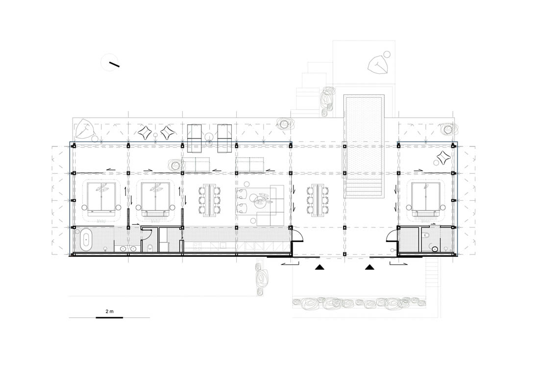 房子其余部分的布局非常开放。内部和外部世界之间的界限已经消失,整个空间就像是一个屋顶露台。轻巧的滑动隔墙可作为创建私人区域并根据需要动摇空间的工具。露台上有一个无边泳池,部分屋顶,因此免受烈日的侵蚀。