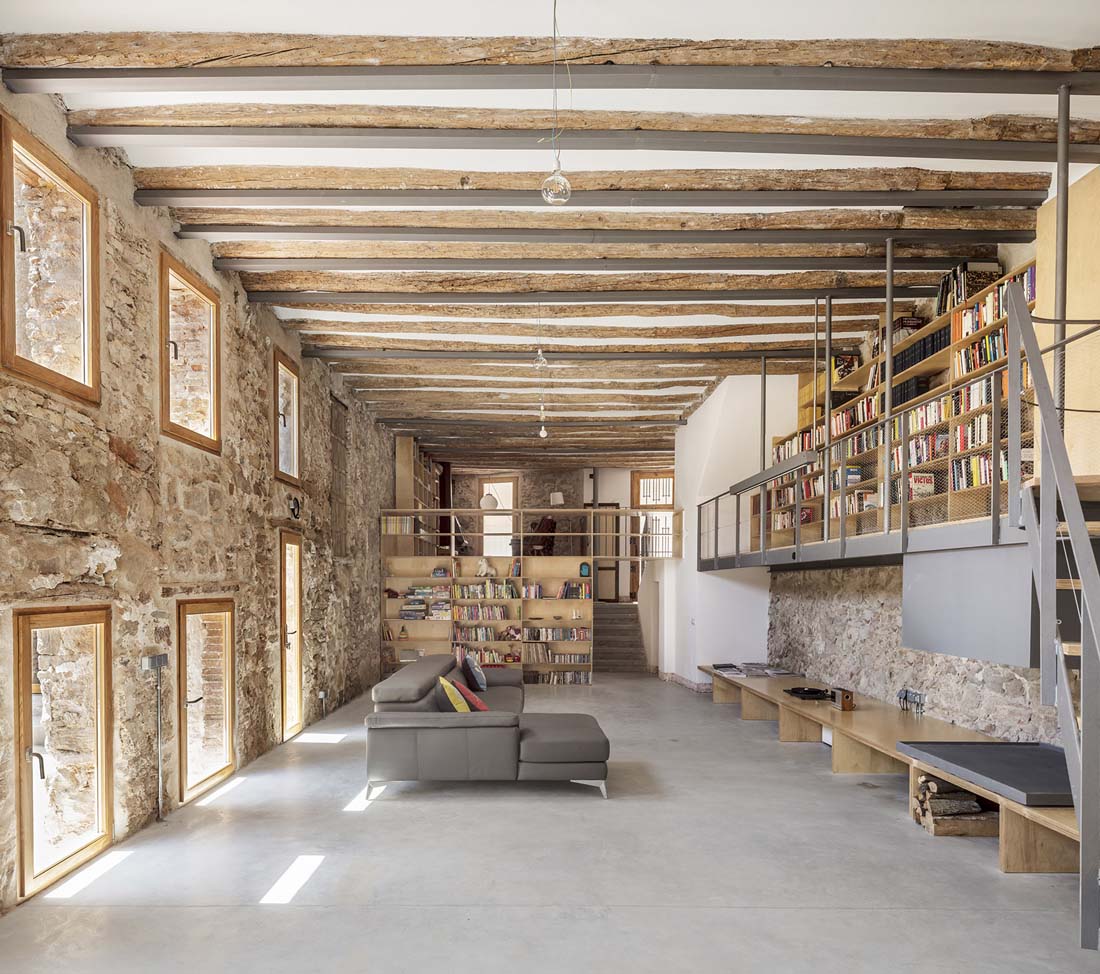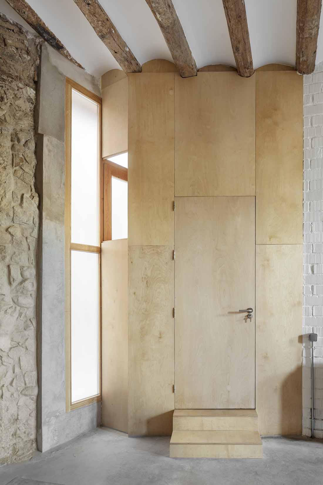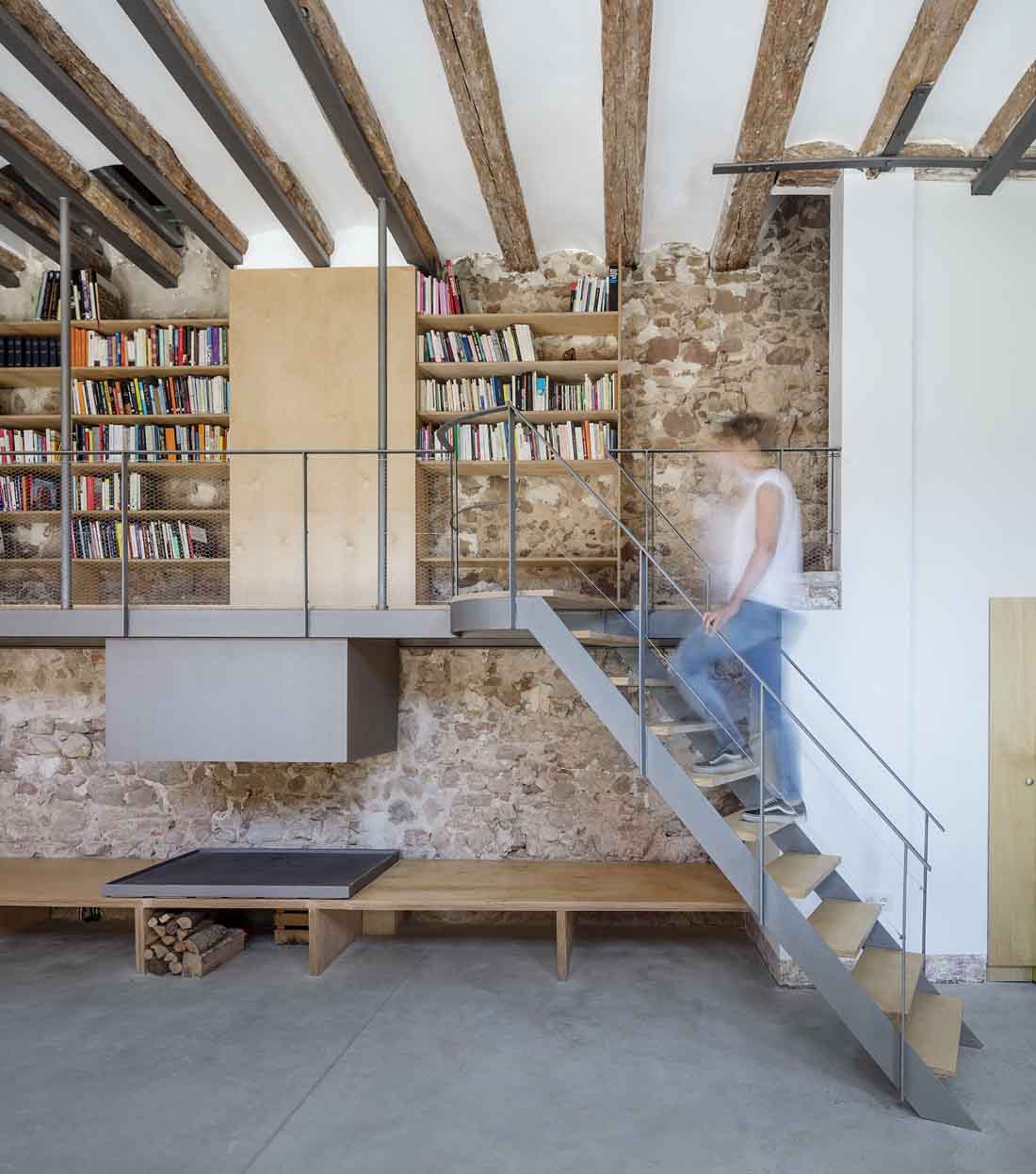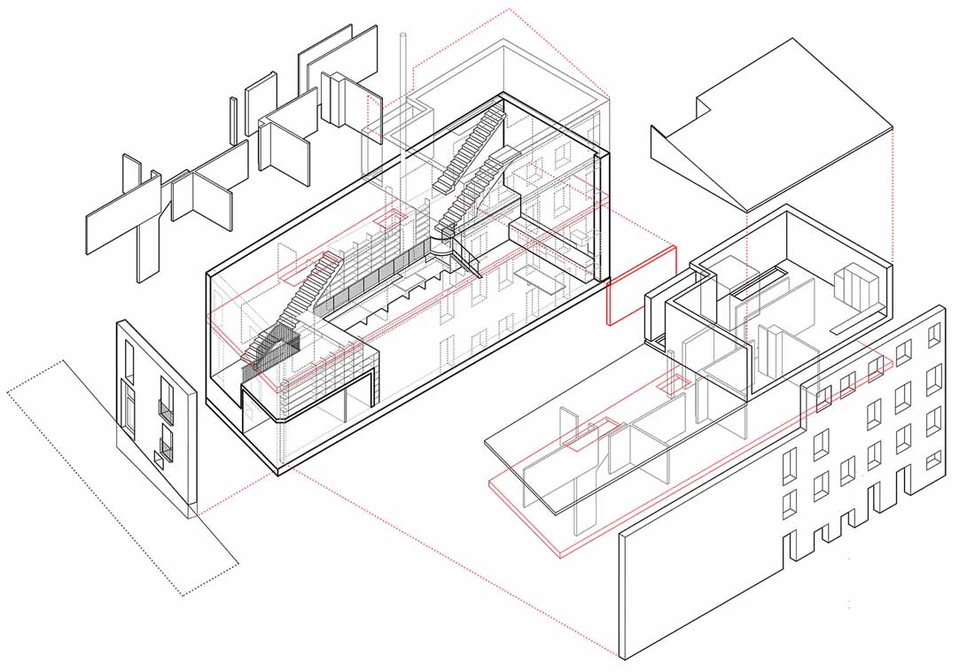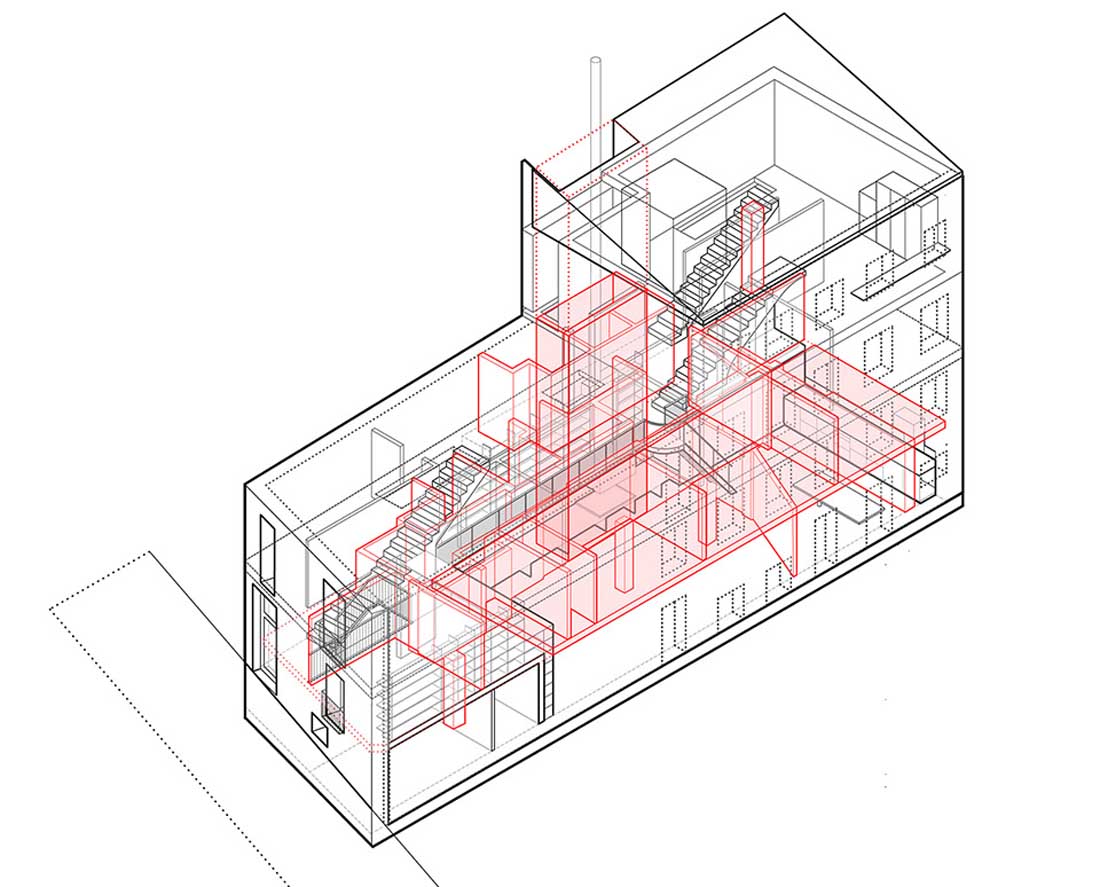 在该项目中,建筑师清空了既有建筑中的楼板、天井、墙壁和立柱,以便腾出居住和办公的空间。因此,工作的基本内容是对原先简单而普通的建筑进行拆除、加固、回收和评估。