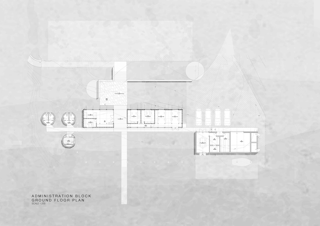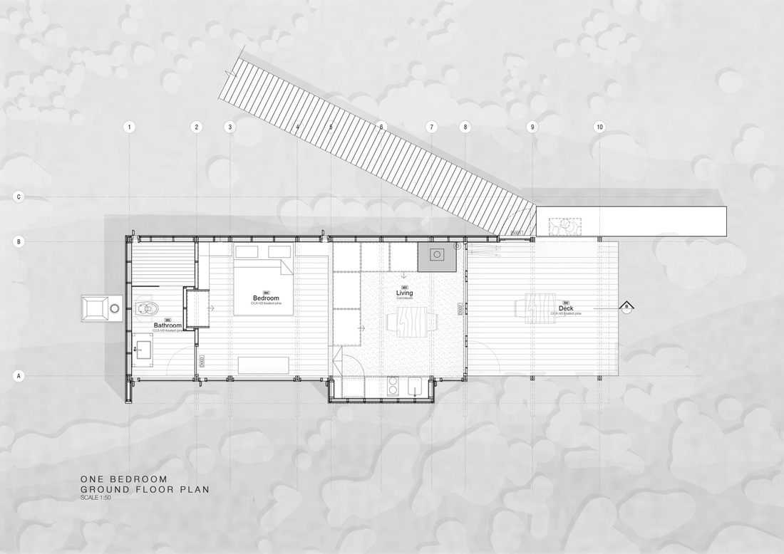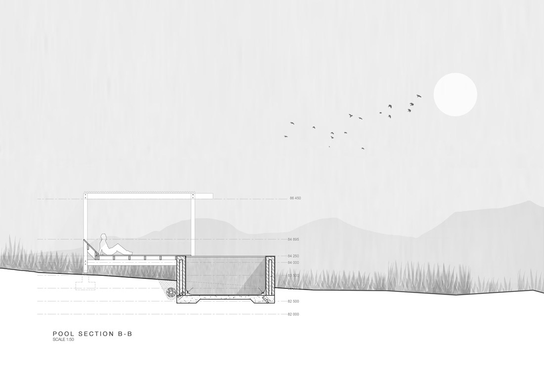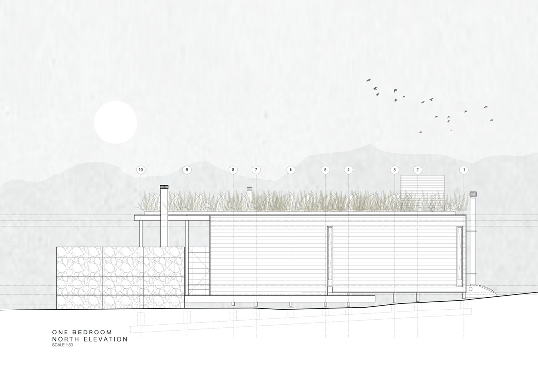 松树被选为最合适的建筑材料,因为它重量轻,易于获得,并且随着时间的推移会逐渐褪色为灰色并融入自然景观。木材建造方法使客舱可以在浮标上方“漂浮”。基础仅限于小型混凝土垫层基础,这会限制对地面和环境的影响。高起的客栈允许地下水、客栈下的当地动物、昆虫和蛇类行走通过。