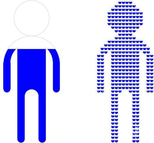 这两张图一个是完整个体的人,但是我们如果从解剖来说,人并不是看上去这样的,他会有眼睛、有嘴巴、有器官、有肺、有肠子、有心脏,然后我们在把这些物质再肢解来说,包括我们的眼睛、肠子,它都是有更小的零件和更小的细胞组成的,其实我们看上去是个完整的个体,但事实上我们又是用各种各样的物质包裹出来,所组合出来的一个物质,说到我们跟水的关系,我们含70%以上的水源,但事实上看上去是这样的,同时也是这样的,我们每一部分水是集中在各个细胞里面,细胞也是含水的,各个物质里面都含水,它是平均分散出去的。