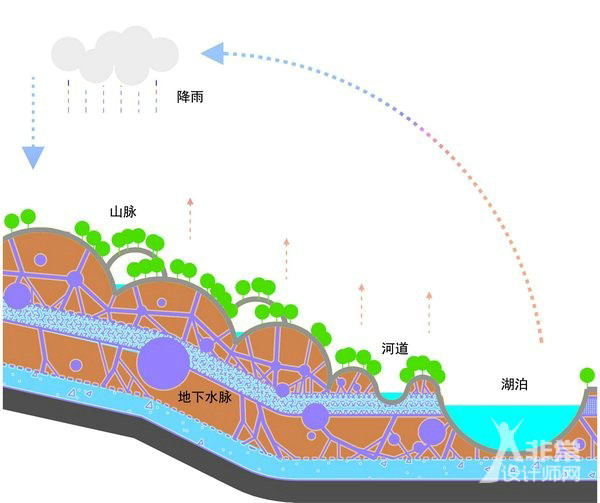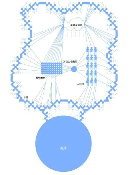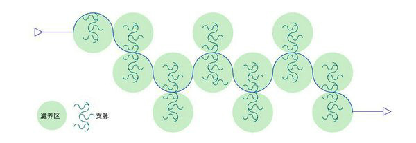 这是水在自然界中的一个状态,我做了总结,第一个是水在自然界中有一个蜿蜒的状态,它经过的地方会形成一个汇水区,第二个是水在自然界中形成的状态基本上是蜿蜒的,它尽可能的蜿蜒,给人的感觉是尽可能的到达每一处到达不了的地方,第三个状态就是,在我们区域他的分支像毛细血管一样,渗透到每一个环节,我们可能看到的是一个主支,但是主支下面有很多小的汇集点,这个例子就像毛线血管,我们身体有个动脉,静脉,但是这个动脉,静脉不直接接触我们每个细胞,细胞总会有一些跟他相连的东西,把它串联在我们组织里面,这个例子就像循环系统一样。