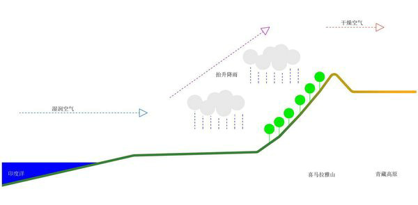 这是一个硬度的断面图,一般来说空气是从这面吹过来的,把印度洋温暖的湿气往这边吹,经过喜马拉雅山抬升的状态,水都留在喜马拉雅山的一边,所以他会形成一个绿油油的区域,然后剩下干燥的空气,过到青藏高原的部分,所以青藏高原呈现黄色,我认为是生物量比较少的部分,所以我画了一条绿线到黄线的过度线,很明显看到他是如何影响植被关系的,我们知道,特别是液体的水,它有唯一一个原则,是水往低处走,所以说自然界中有水脉的地方通常都是一个从高处和低处汇集的一个过程。