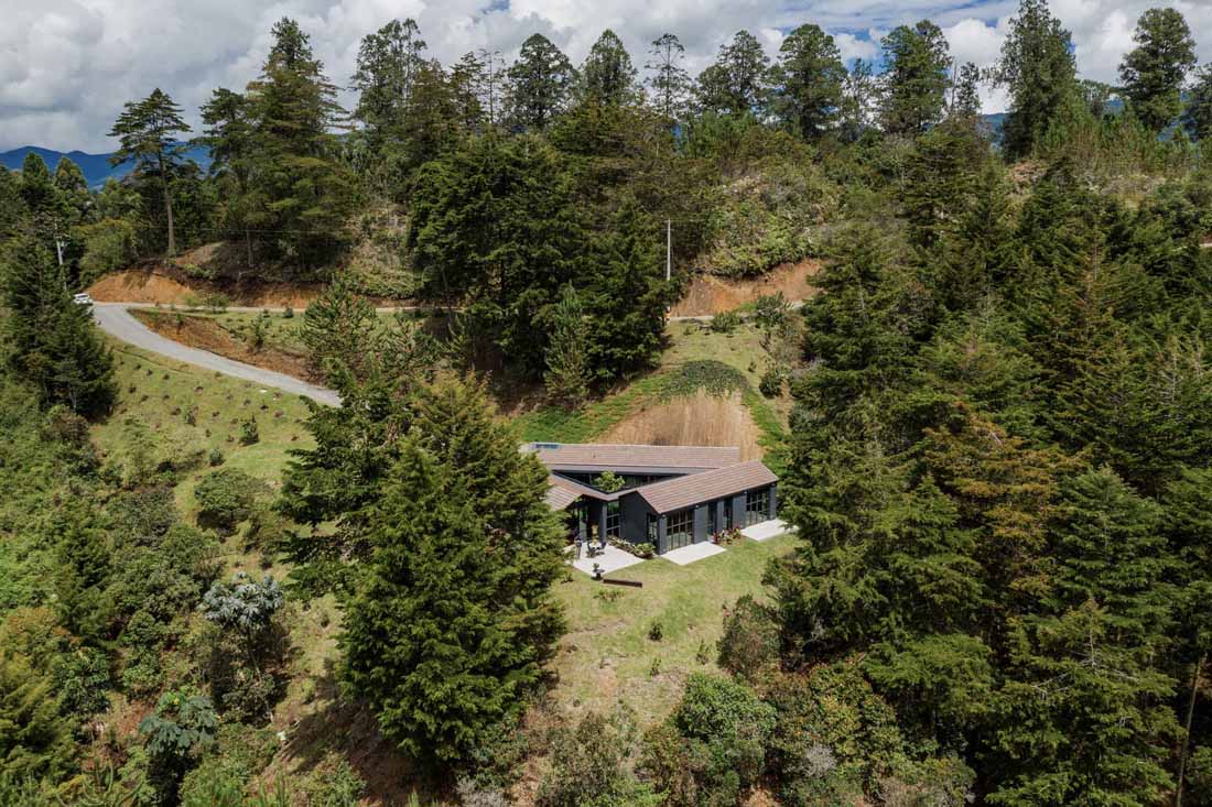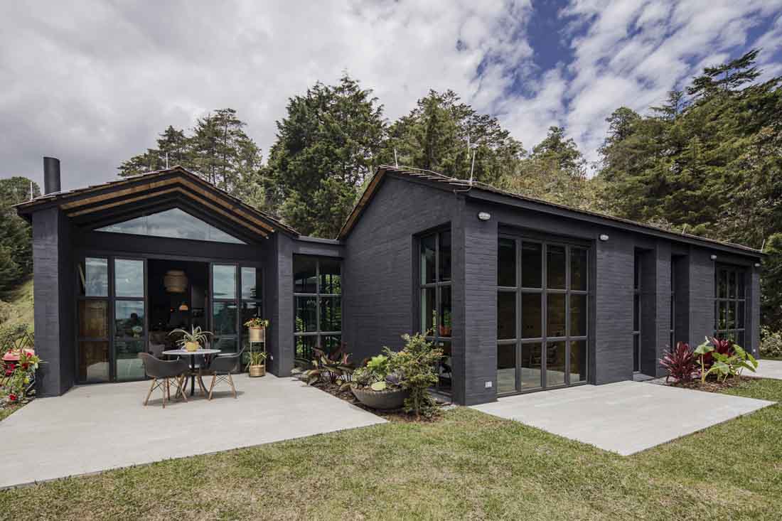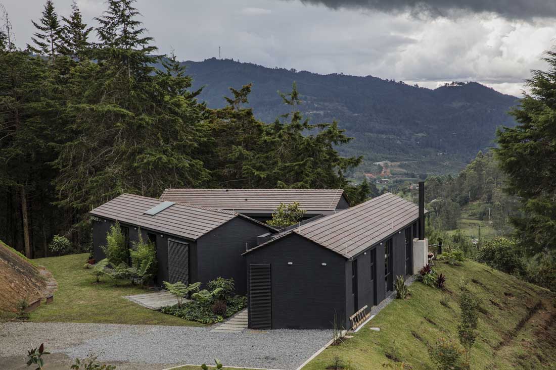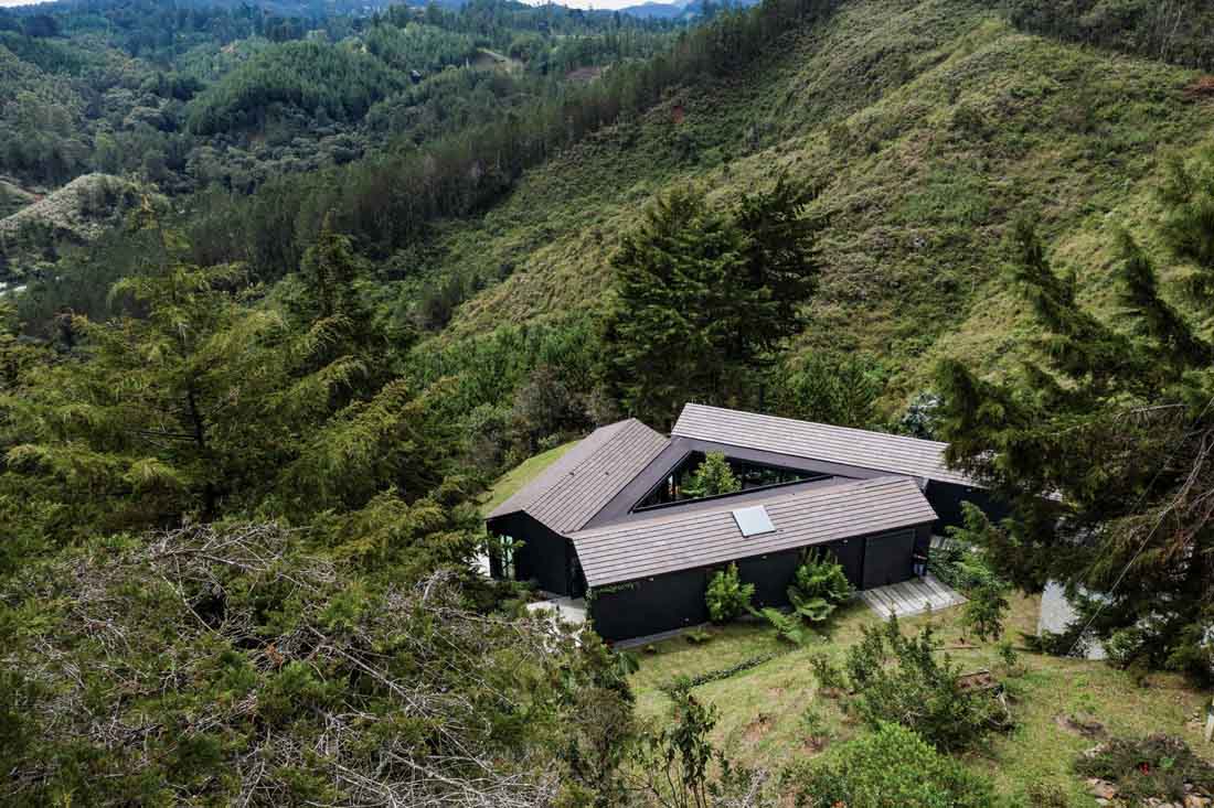 黑色和三角形的房屋,位于山的边缘,有雾和露台;遥远的自然,接近自然。山脉边缘的小地带,有小树林,可以欣赏遥远的山脉,其几何形状暗示了这一占领。