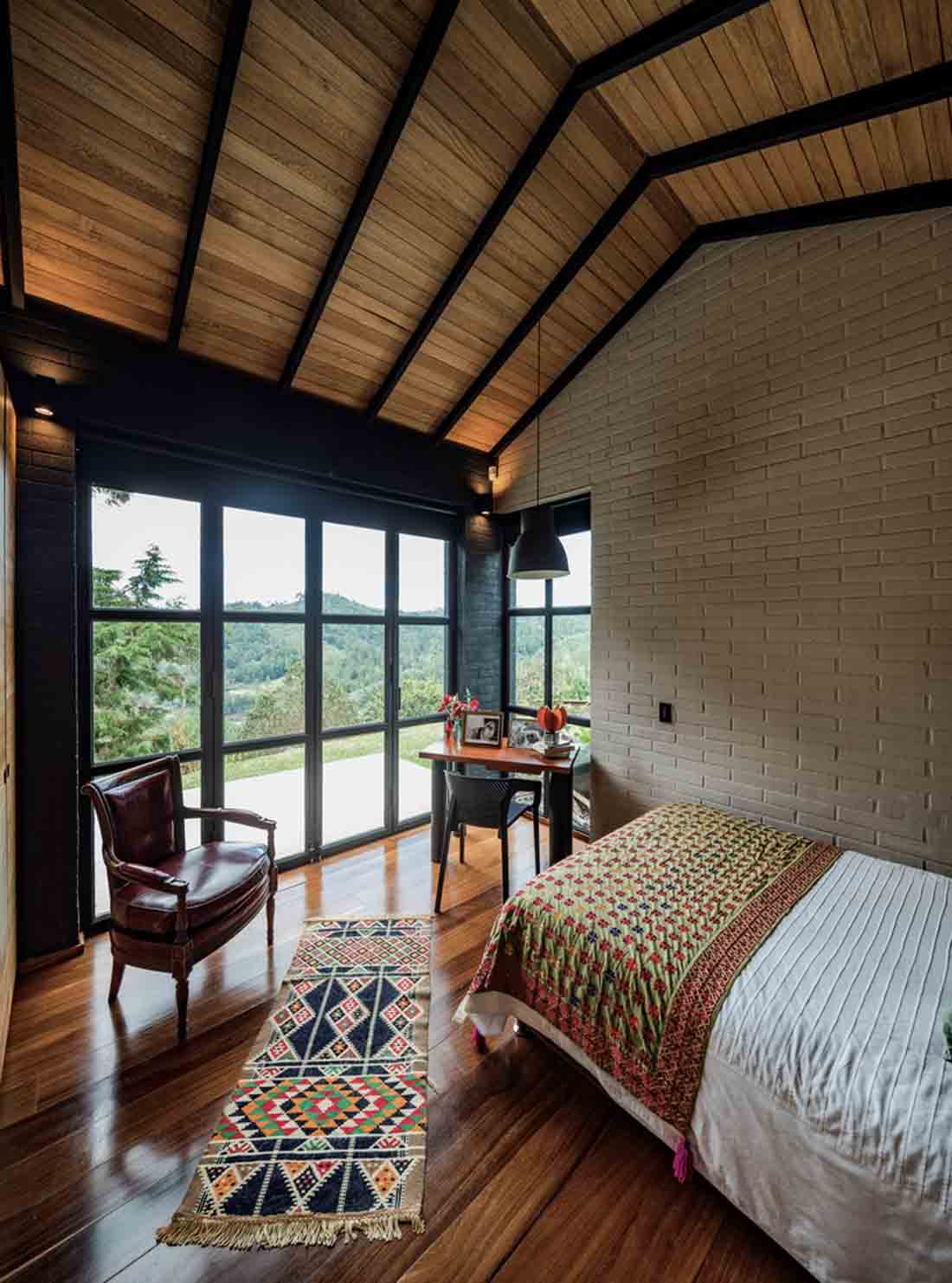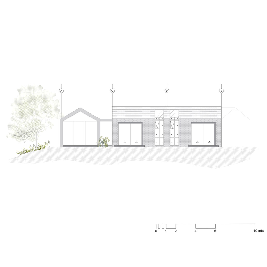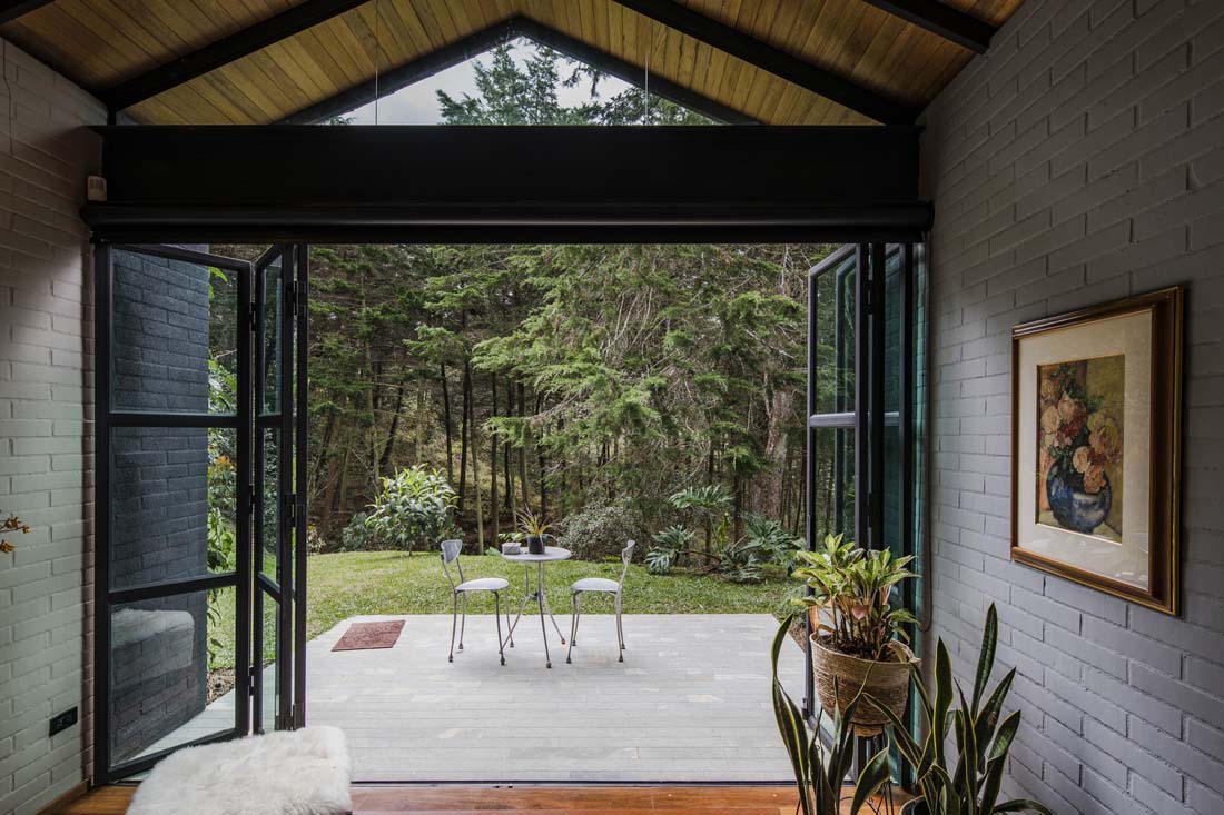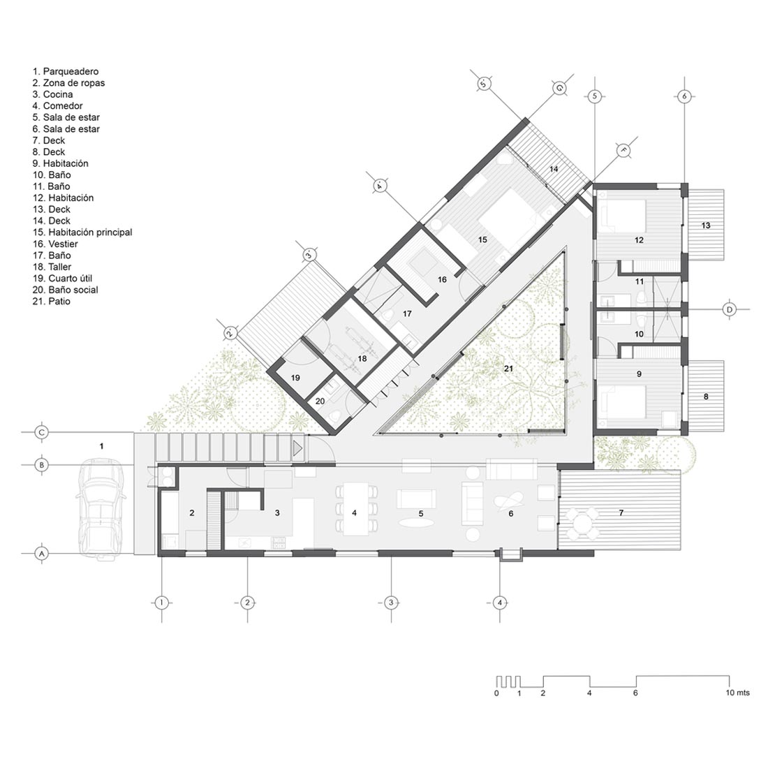 第三栋房屋体积与其他两个相交,并与山的边缘平行,栖息在非常靠近森林的地方,其中包含儿童房及其服务区域。三栋房屋之间的空隙是内部庭院,通道位于三角形的顶点之一中。