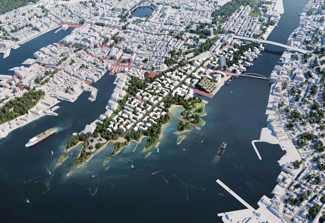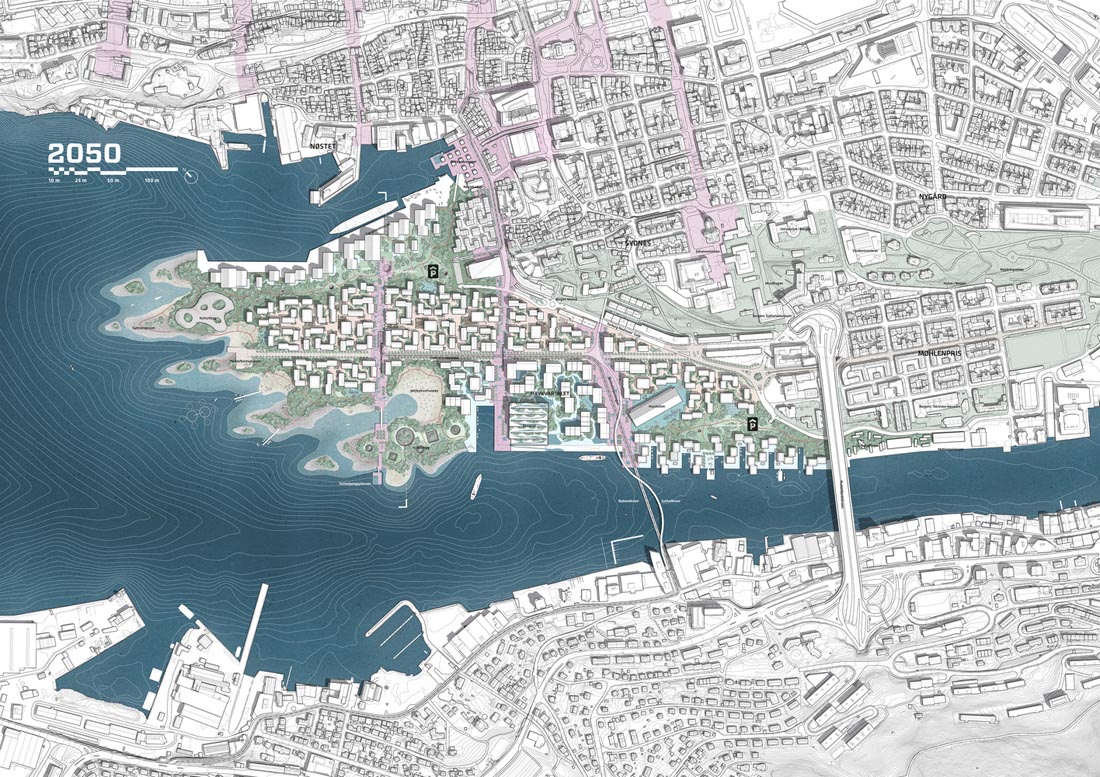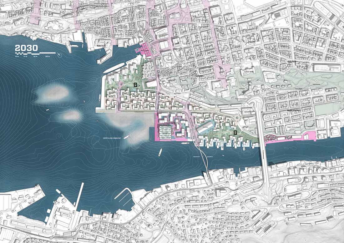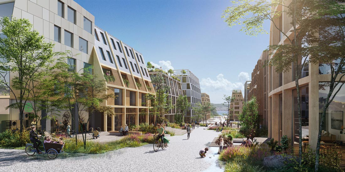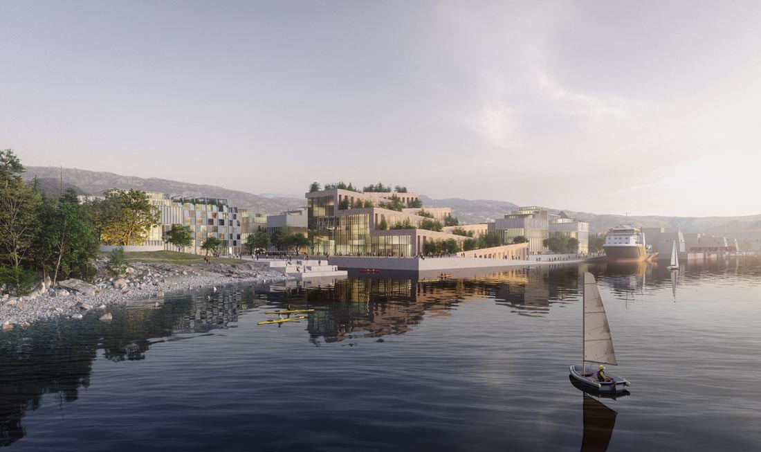 设计师为挪威卑尔根设计了一个新的40公顷的再生总体规划。旨在为旧的物流港口和轮渡码头带来新的生活。该计划概述了一个零排放区,其重点是基于社区的共享经济,可再生建筑材料和气候适应战略。