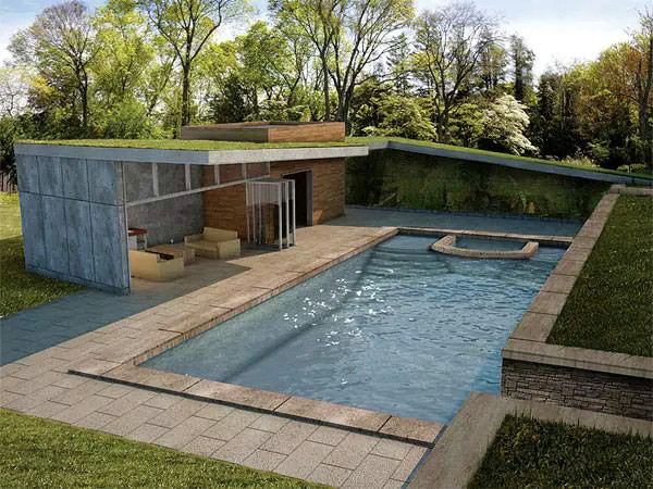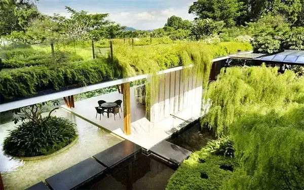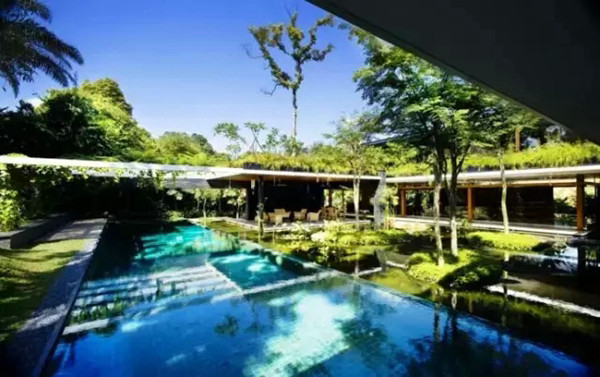 13. 最好的景观设计永远不能没有池塘或水的设计, 设计师设计这套建在经过园艺美化的场地上的重叠式结构的豪宅,波光麟麟的水池的庭院,屋顶上“溢出”到花园中的植物,心醉。