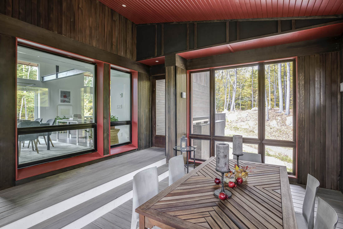 朝南的墙的宽敞窗户使自然光线和冬季热量充斥着室内。夏季,深层的屋顶悬挑遮蔽了内部空间,防止其过度暴露和过热。露天平面图和高高的天花板使整个房屋内都能流通,从而提供自然通风。在冬天,三层玻璃窗,隔热墙和低渗透的细节优化了房屋的日光温暖度。在开阔的食堂厨房空间中安装了一个木炉,用于在极冷的日子补充热量。