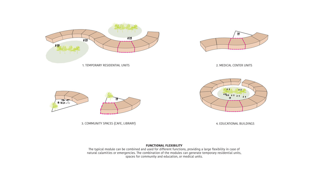 提供一个模块化的教育中心,所有必需的空间都被装配成两个环,两个环带两个庭院和一个额外的可用屋顶。由交叉层压木材制成,每个55平方米的模块放置在理想的教室中,可容纳20——25名学生。该营地项目被设计为树屋,具有很高的灵活性,并产生了一所悬浮在自然中的学校。