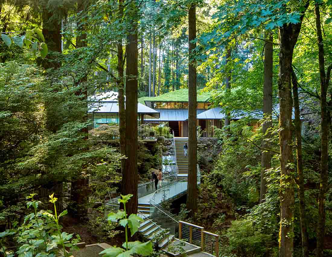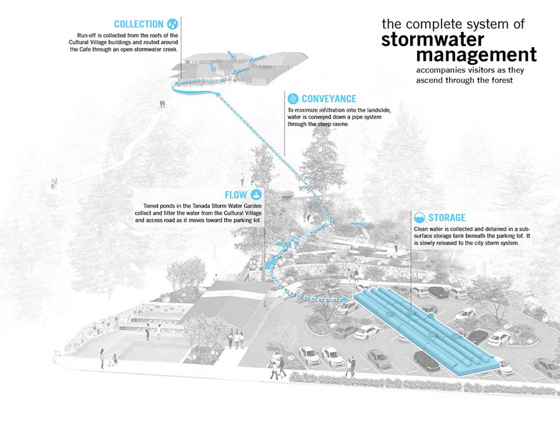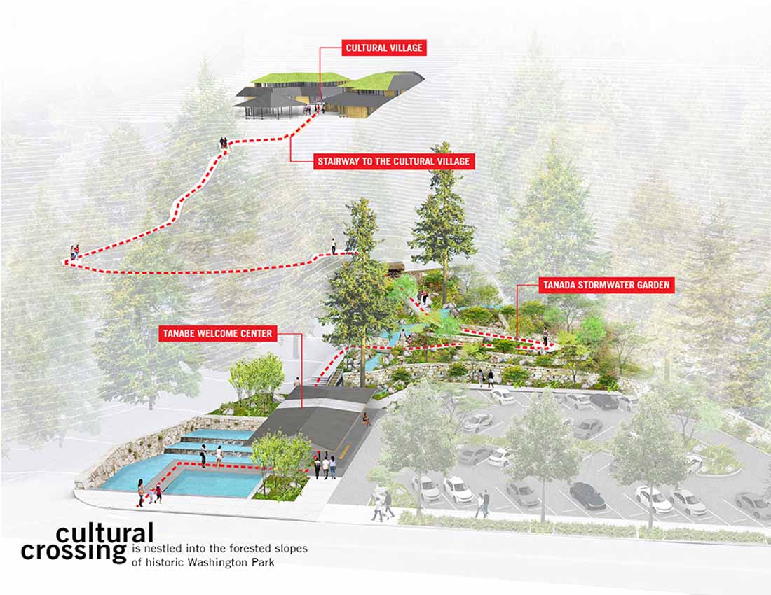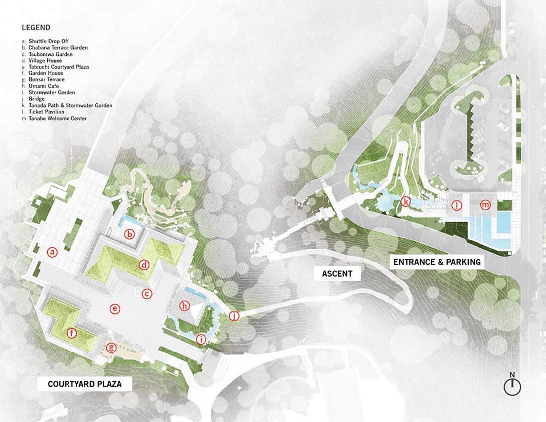 改造的首要内容是建立明确的到达次序。在原来,游客需要穿越停车场、马路和服务庭院进入场地。在重新设计之后,客人们从旅程的一开始便能够收获到丰富的体验,并随着空间的序列逐步深入场地。在山脚下,新建立的Tanabe欢迎中心(Tanabe Welcome Center)提供了更加正式和吸引人的入口。游客们可以经由人行道穿越森林峡谷和跌落式的雨水花园,最终到达顶部的文化村(Cultural Village)。