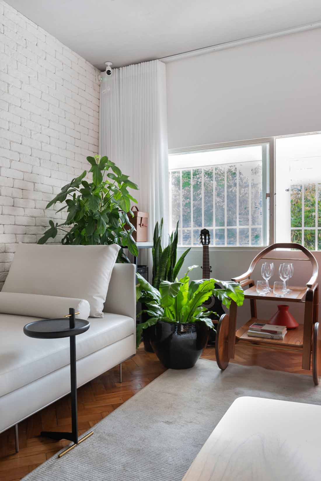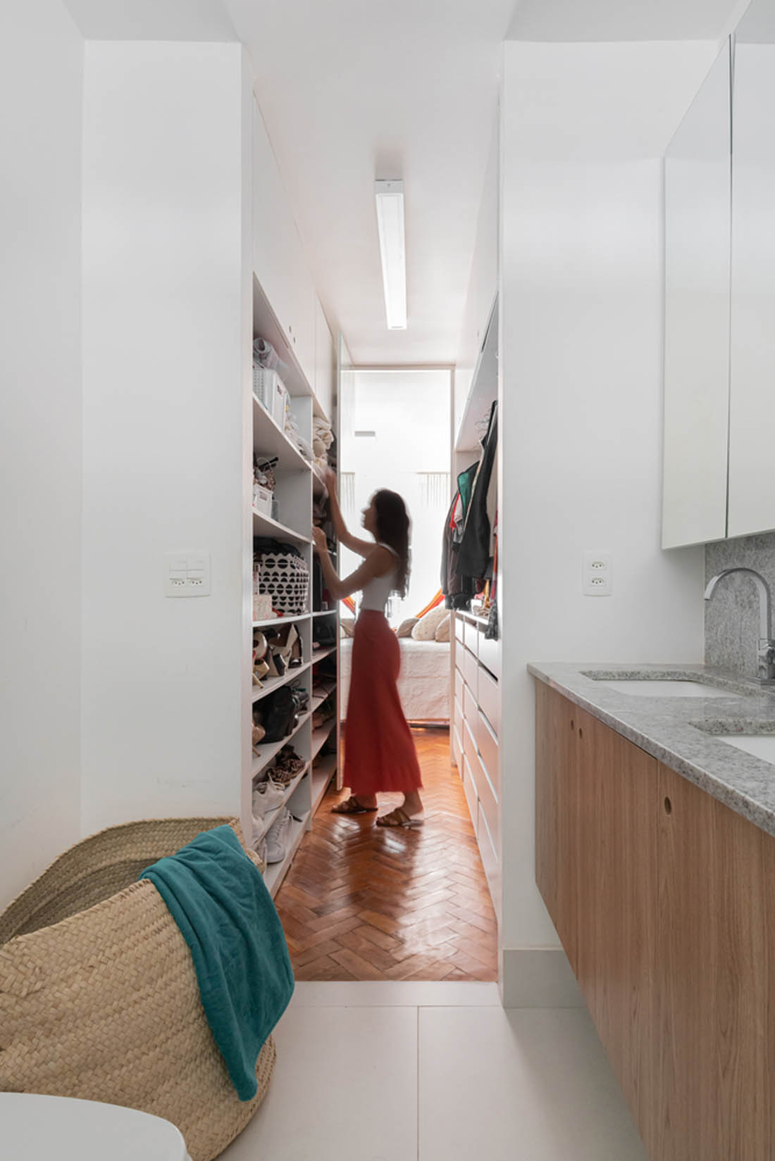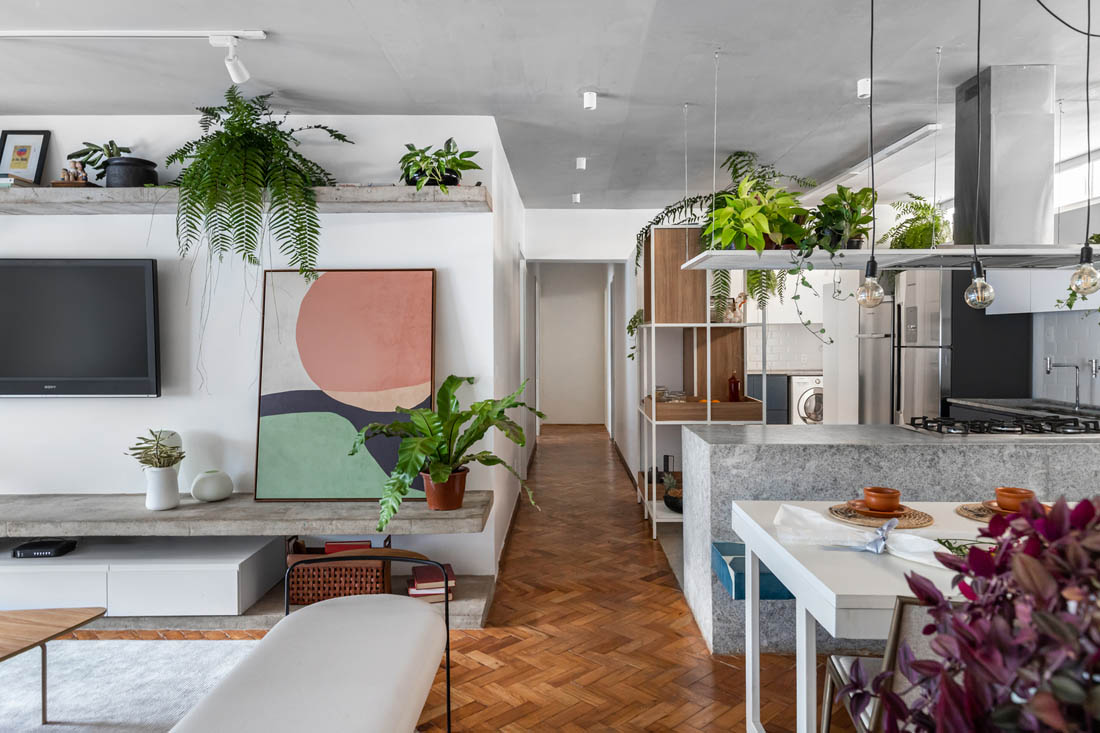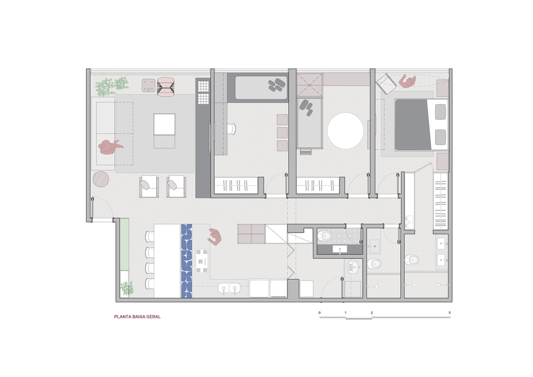 “塔奎尼奥公寓”(Taquinho Apartment)的主人很喜欢巴西利亚,并在现代主义城市建造的第一批超级街区之一中找到了一个极好的公寓。公寓拥有原始的木制镶木地板,大窗户和宽敞的天花板,具有无限的发展潜力,但需要进行良好的翻新,并重新安排客流和房间划分,以适应新的家庭需求。居民需要一个宽敞的社交区,以使家人和朋友在一起。通过拆除主墙将客厅与餐厅和厨房整合在一起,将整个区域转变为一个空间。