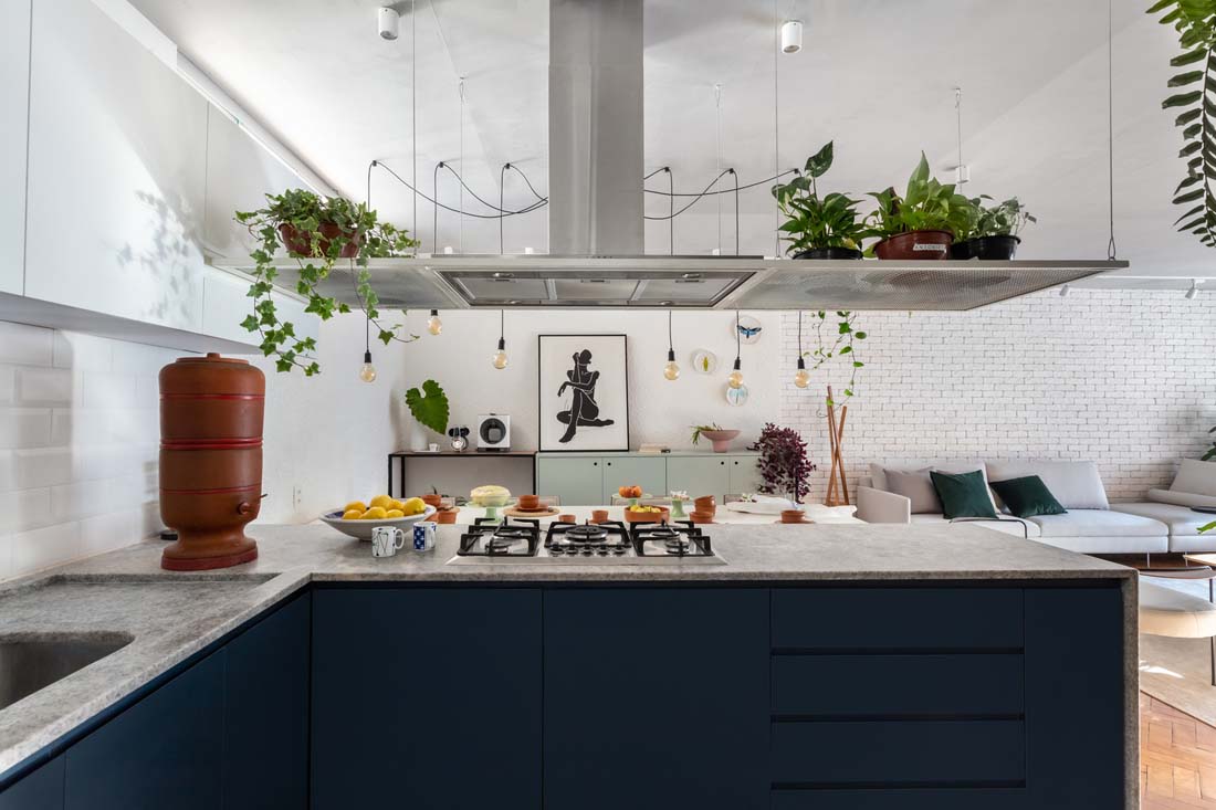 花岗岩台面允许房间之间的交流,并满足家庭的动态。中央台面支撑着悬挂的长凳,长凳上铺有蓝色液压瓷砖,可作为餐桌的座位,最多可容纳12人。洗衣房也被重新安置,使厨房变得更大。