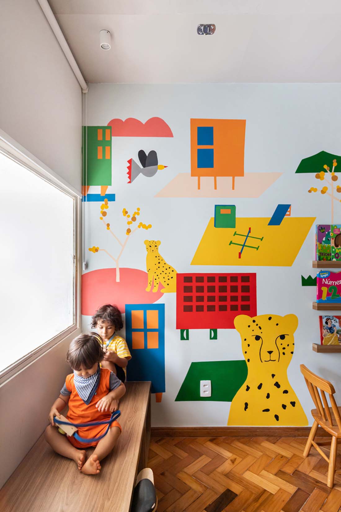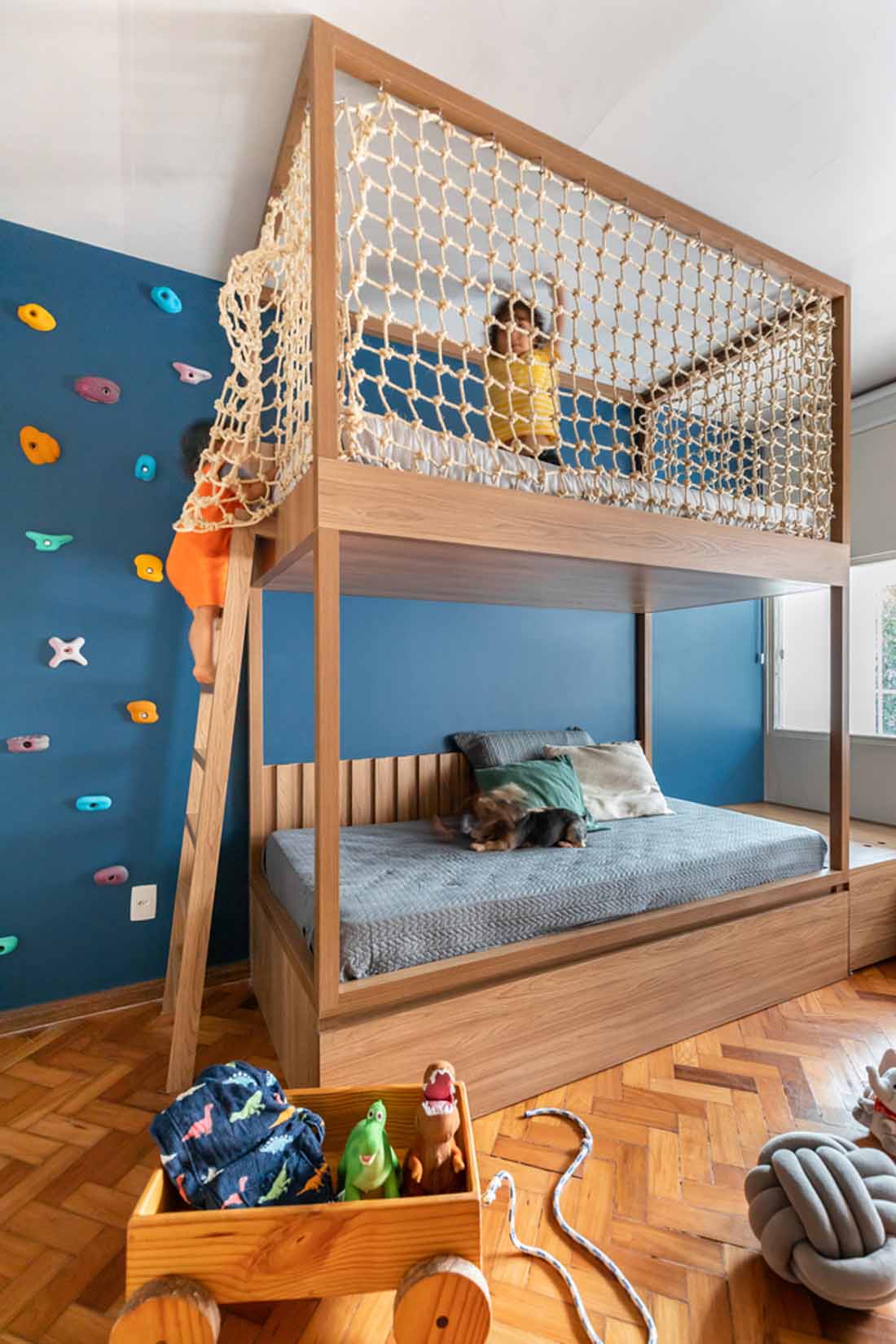 儿童房的设计具有多种功能。设计师设计的双层床可以通过楼梯或攀岩墙横向进入。上盖采用手工编织绳制成。床旁边是放玩具的箱子和茧荡的秋千。彩色壁画讲述了一个故事,并以一种有趣而有趣的方式带来了这座城市的主题。