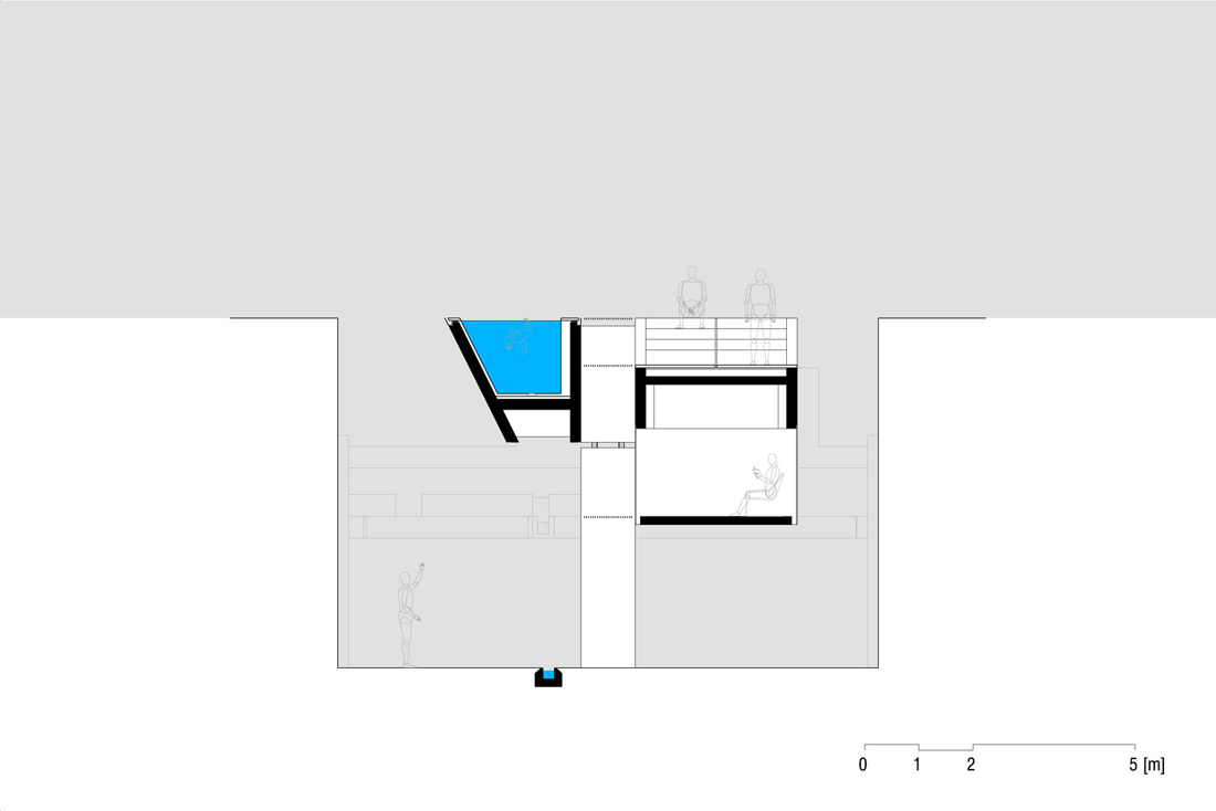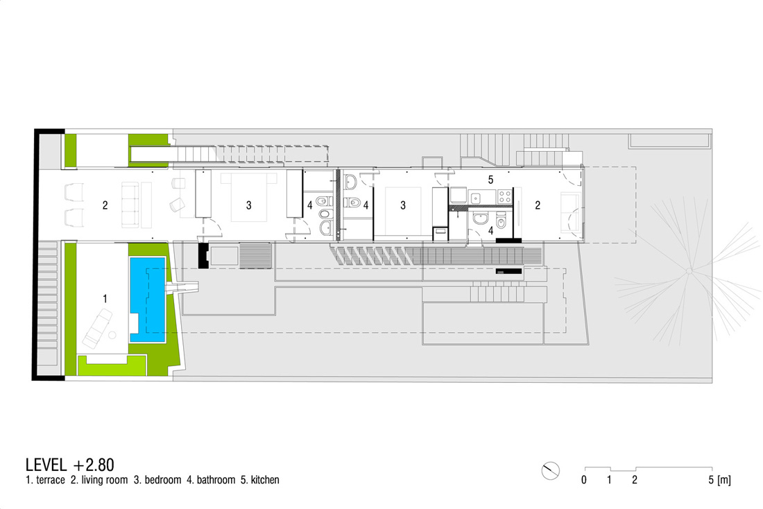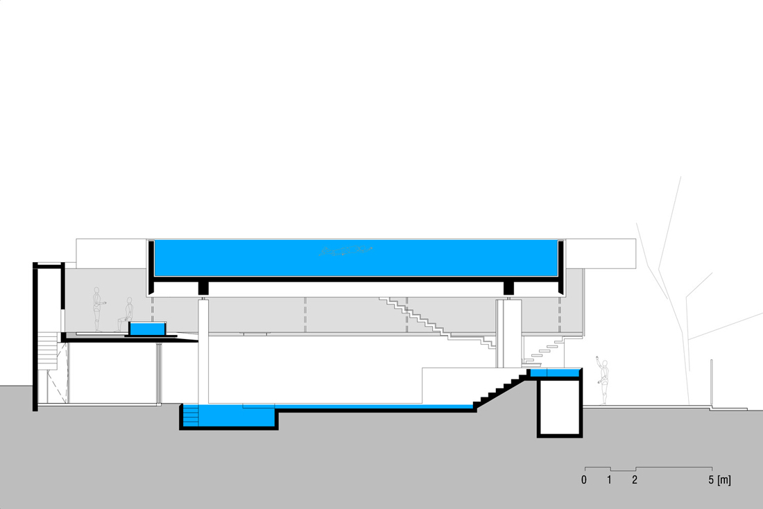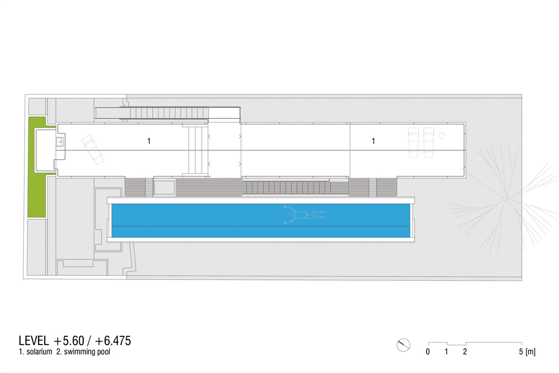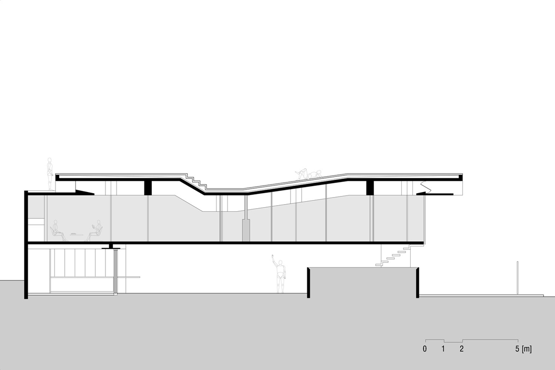 为了达到最大的花园面积比,地面没有任何建筑。因此,建筑存在三个不同的层次或三个层次:地面层次[花园–内省或场地限制所涵盖的范围],公寓层次[唯一漂浮在地面上方和泳池下方的室内空间]和屋顶[游泳池和日光浴室,外向或全景空间]。