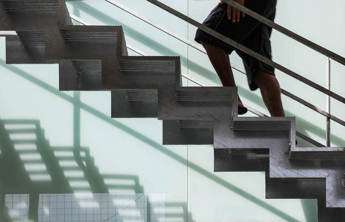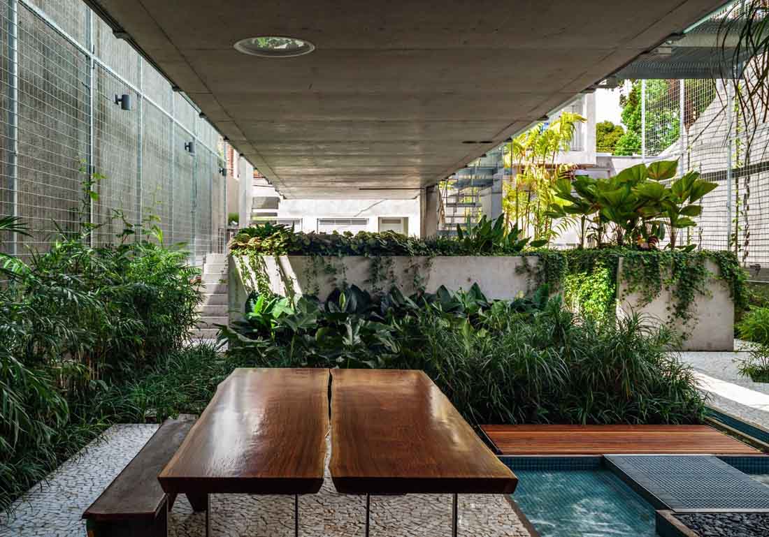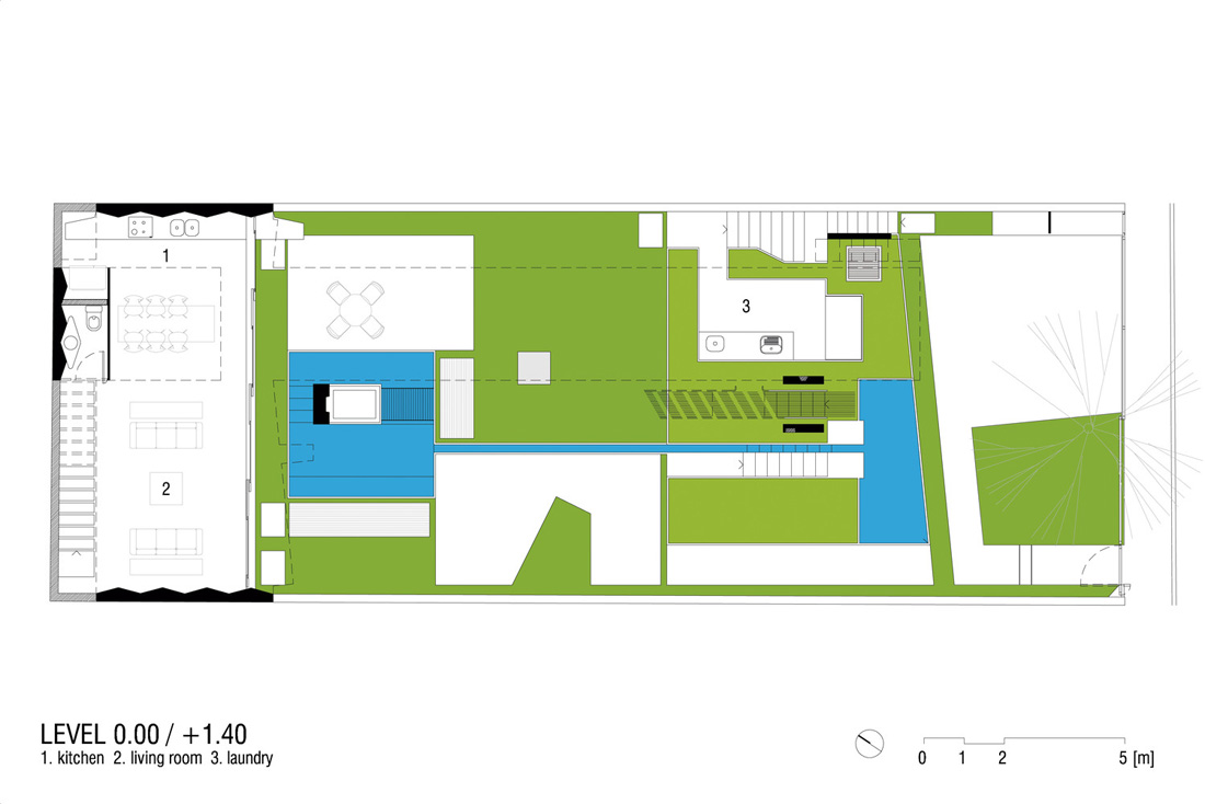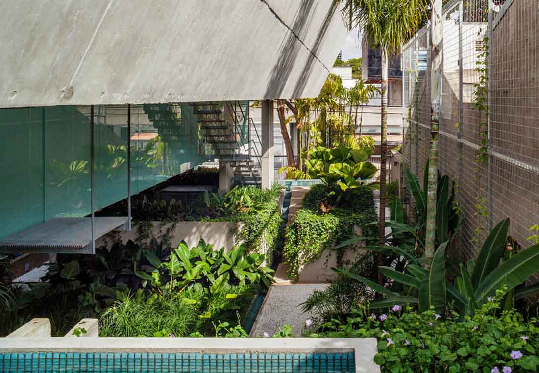 为了达到最大的花园面积比,地面没有任何建筑。因此,建筑存在三个不同的层次或三个层次:地面层次[花园–内省或场地限制所涵盖的范围],公寓层次[唯一漂浮在地面上方和泳池下方的室内空间]和屋顶[游泳池和日光浴室,外向或全景空间]。