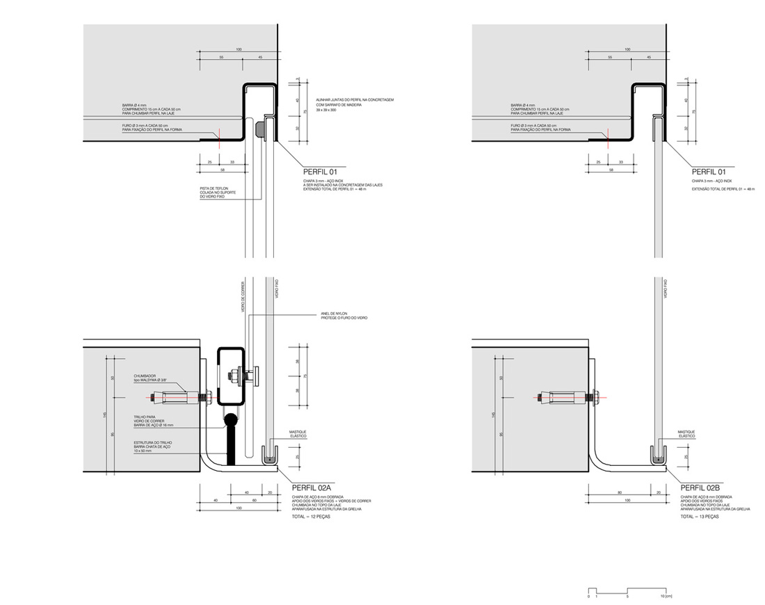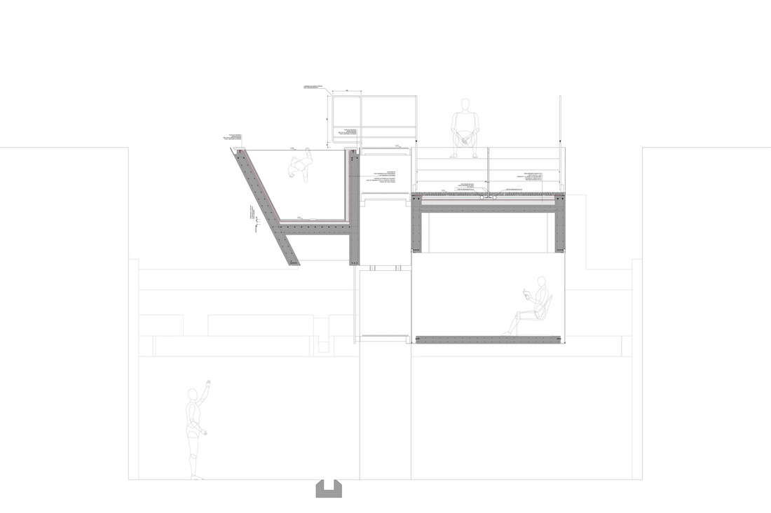 游泳池和日光浴室显示为平行体积。两列位于它们之间1 m宽的间隙中。12 m跨度的一侧朝向支撑游泳池的横梁,另一侧朝向支撑日光浴室的横梁,也将地板悬挂在下方。