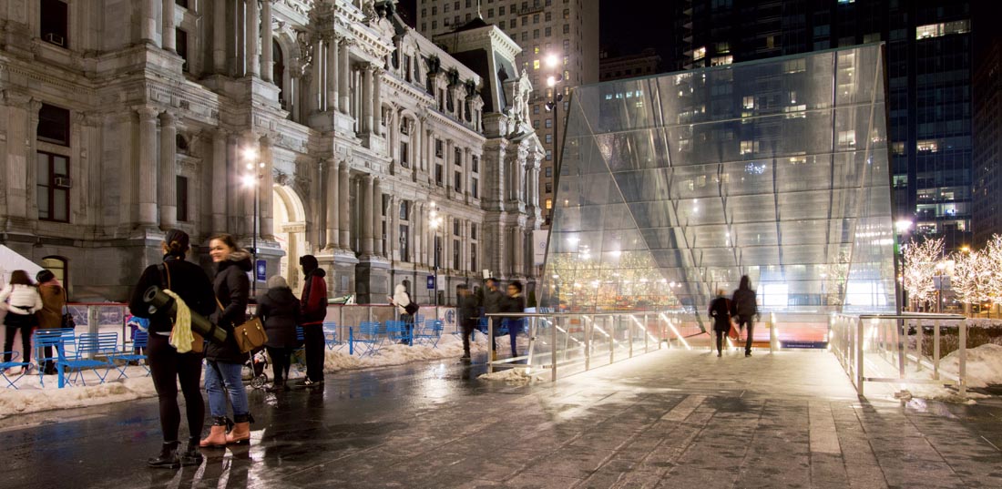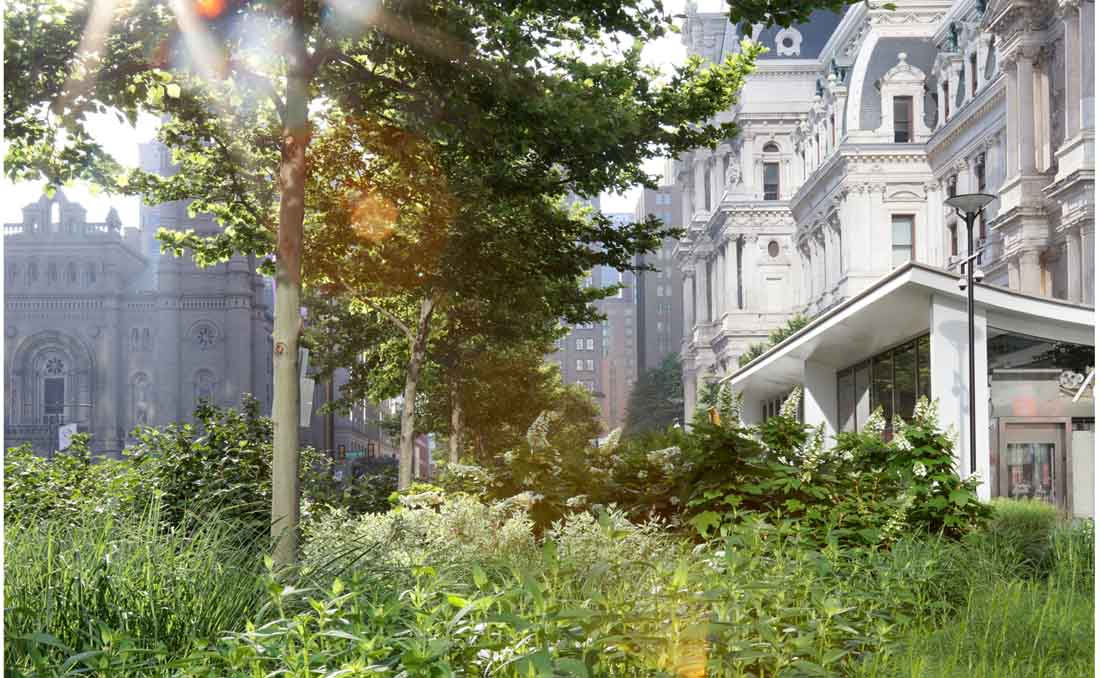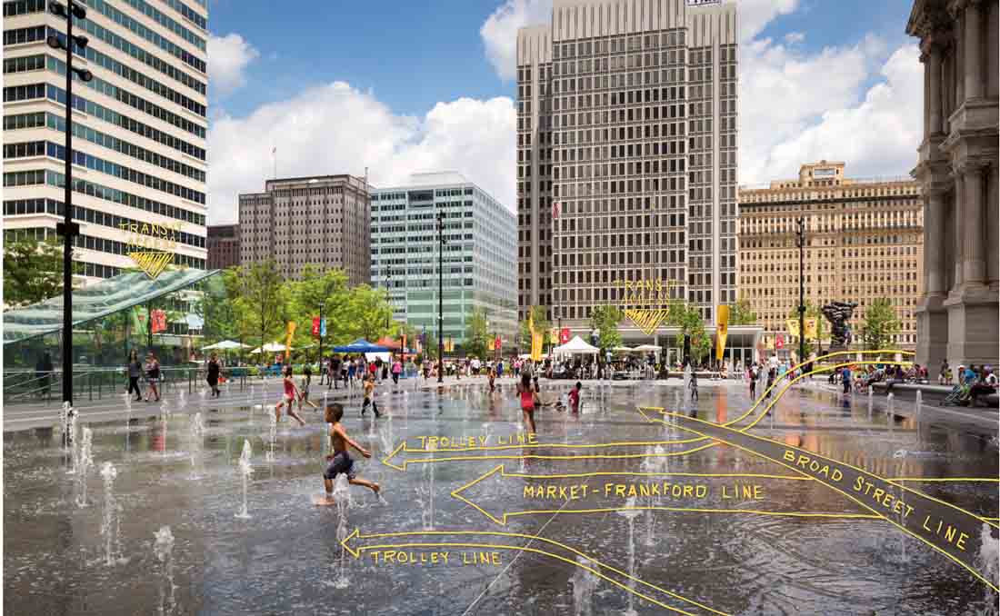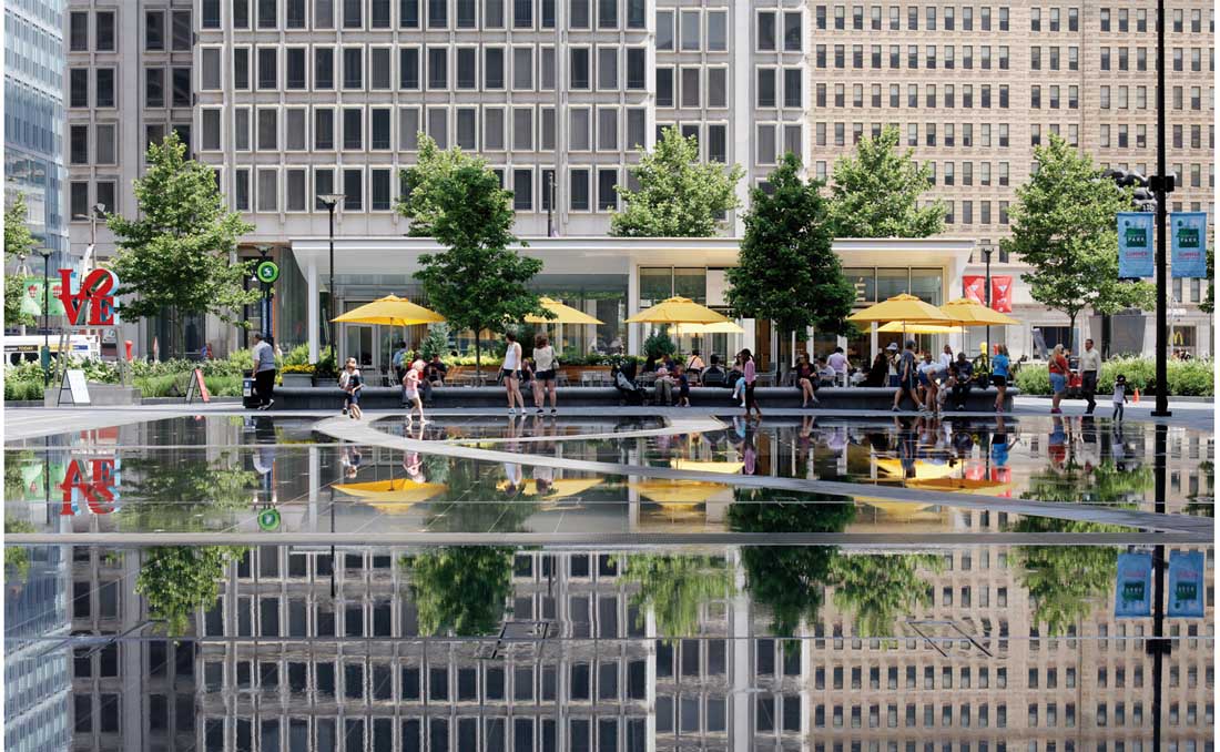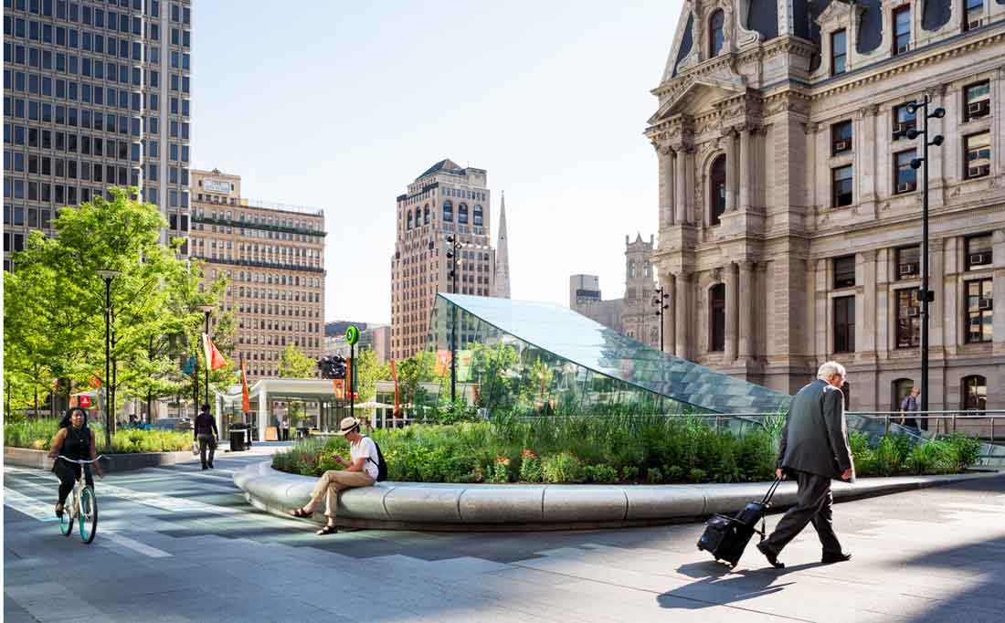 广场的恢复和振新势在必行。既有的场地不仅应当重新发挥其作为交通枢纽的功能,每天为7万名用户提供安全便利的交通设施,同时还应充分发挥其位置上的优势,被重塑为一个活跃的公共空间,成为城市真正的心脏。事实上,威廉·潘恩在最初规划费城的时候便提出了类似的设想:在城市各处设置五个主要的公共广场。该项目场地即是当时的“中央广场”,亦是城市中第一座蒸汽驱动的供水厂以及第一座公共喷泉所在的位置。承载着过去的一系列愿景,广场在今天以Dilworth公园的身份重获新生,它标志着城市在经济、生活和交通上的积极转变,成为了一个向所有人开放的亲切场地。