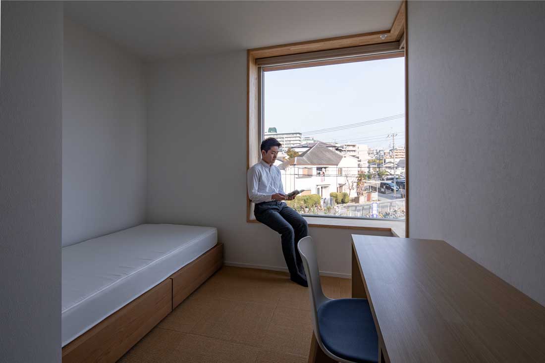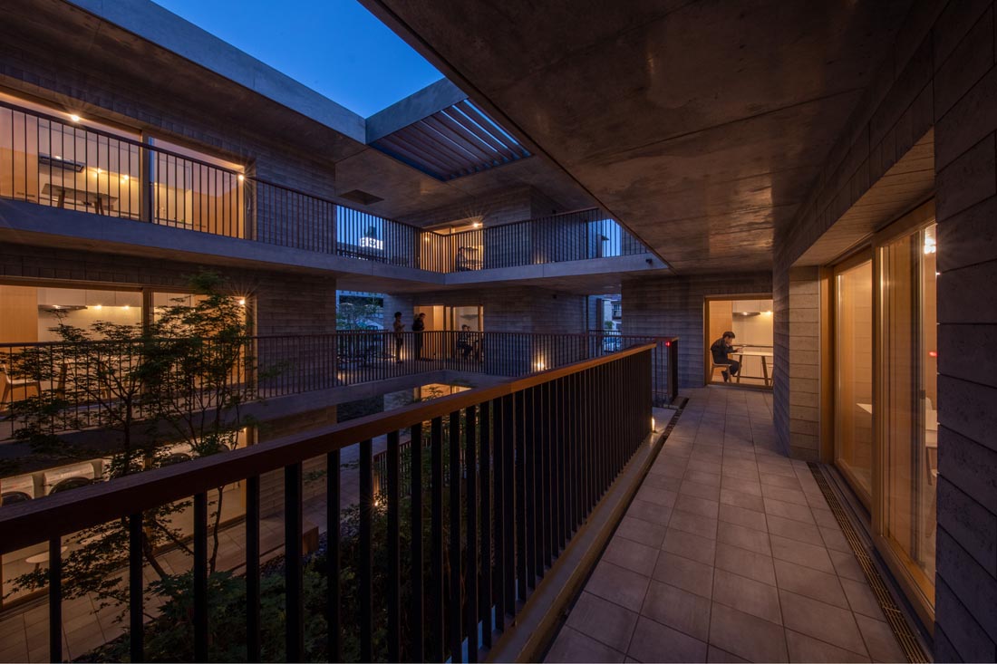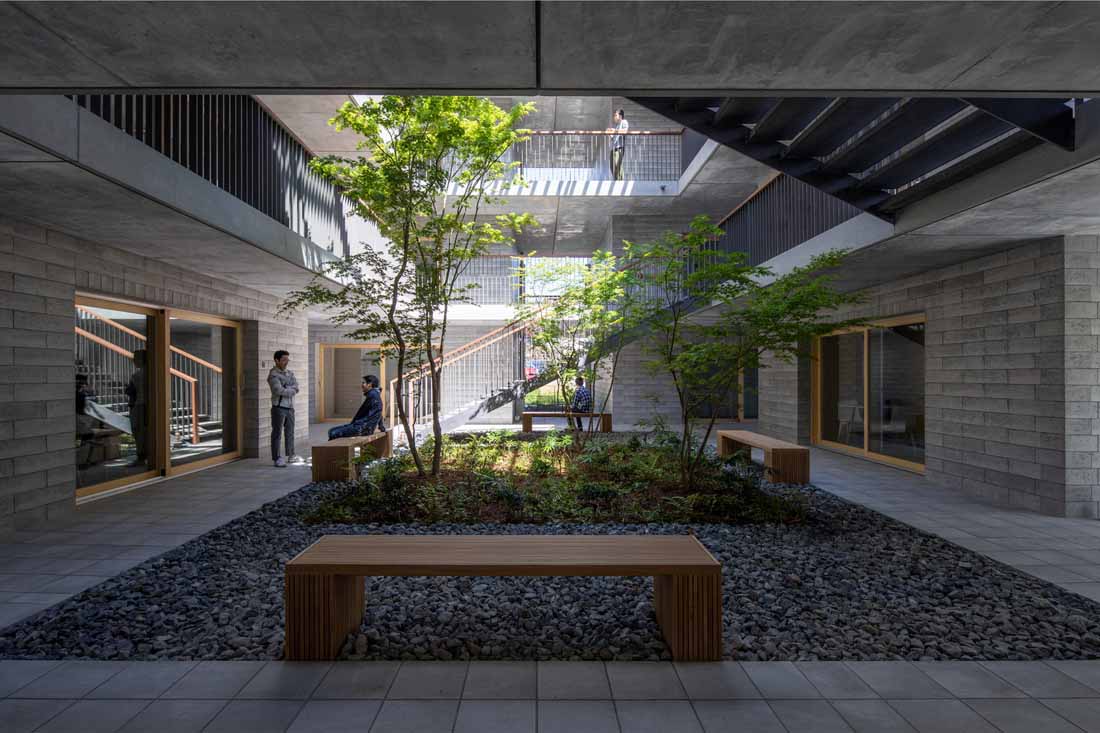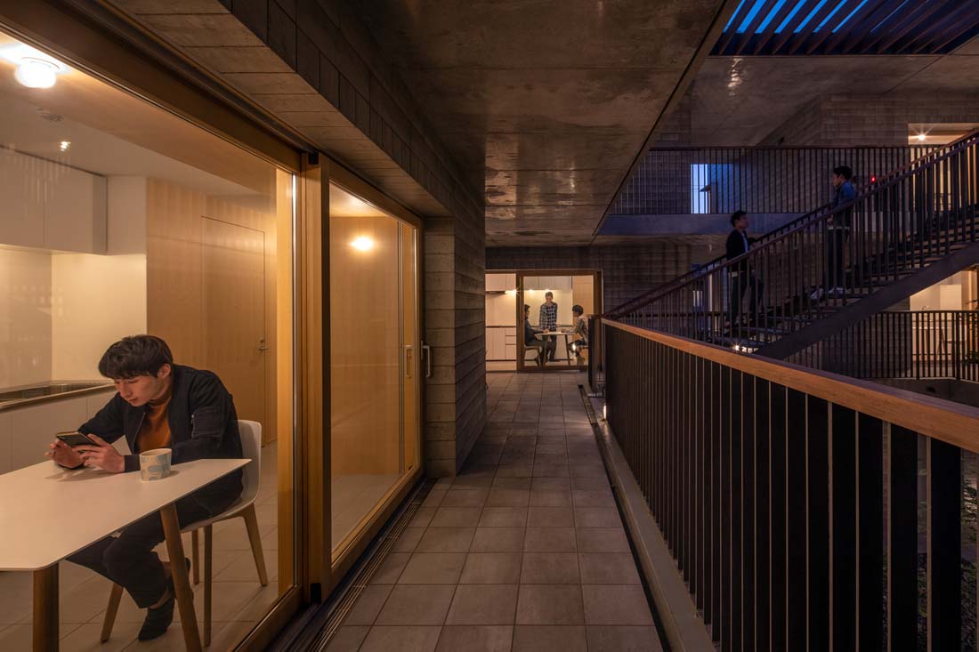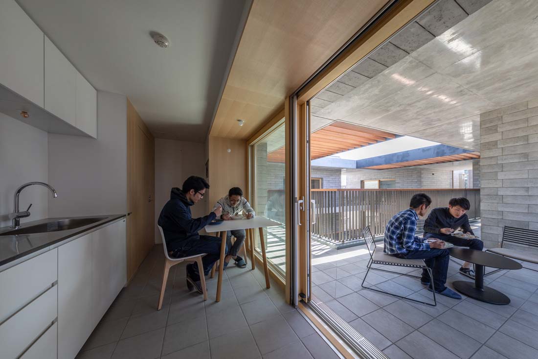 设计师在院子周围布置了建筑物,并在它们之间建立了一个称为“公共点”的开放空间。它将光和风传递到公共空间,并将成为居民第二居室的交流场所。还将单位划分为两个紧凑的私人房间和一个共用厨房,供他们烹饪和用餐。共用厨房可通过大型木质推拉门向公共空间敞开。