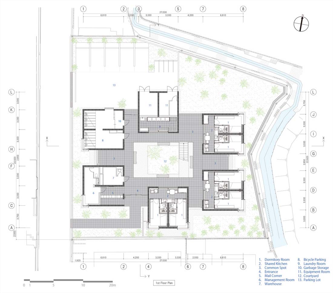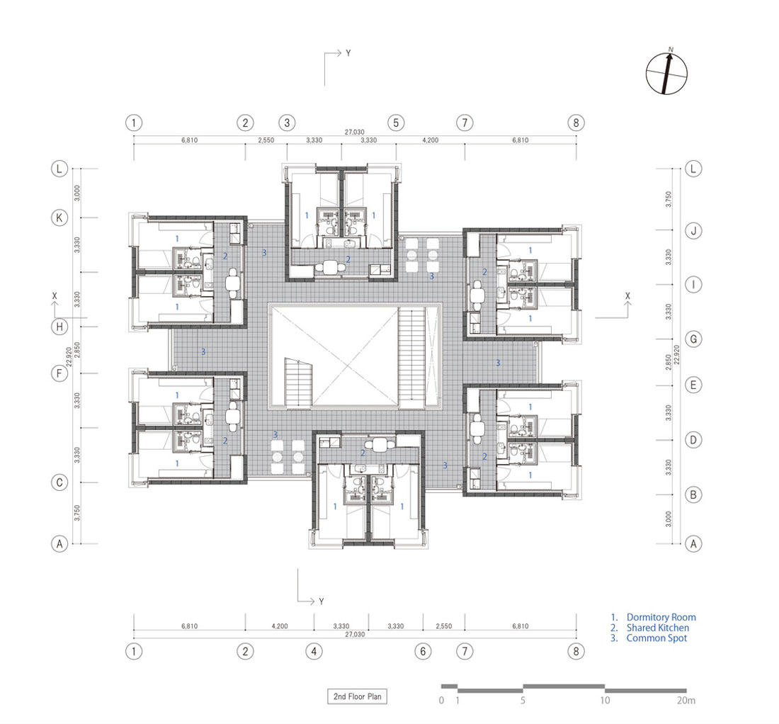他们可以在公共场所与朋友分享在共用厨房里做的菜。共享厨房将与他人建立关系,社区将在宿舍中成长。宿舍有各种空间,从独立的宿舍室到开放的公共空间。
