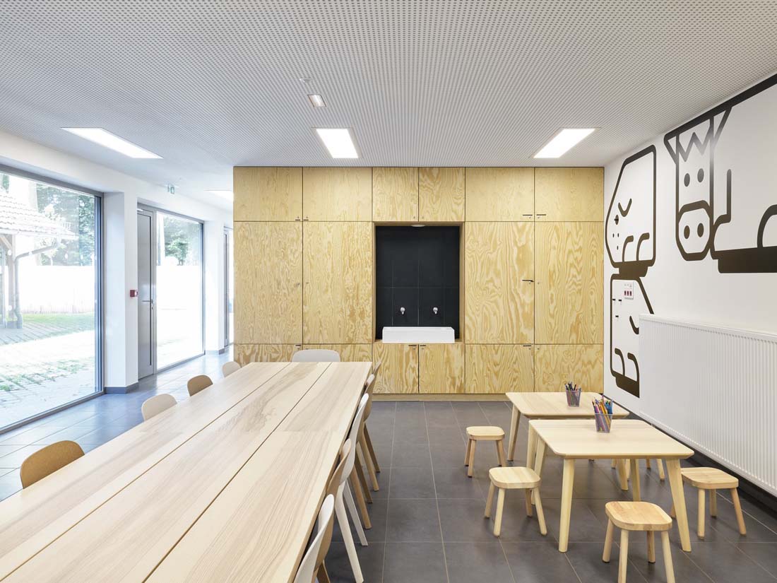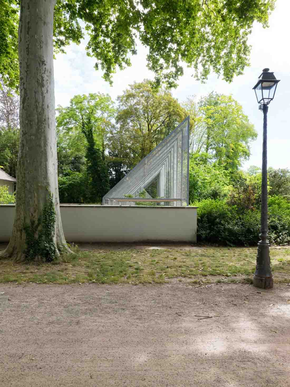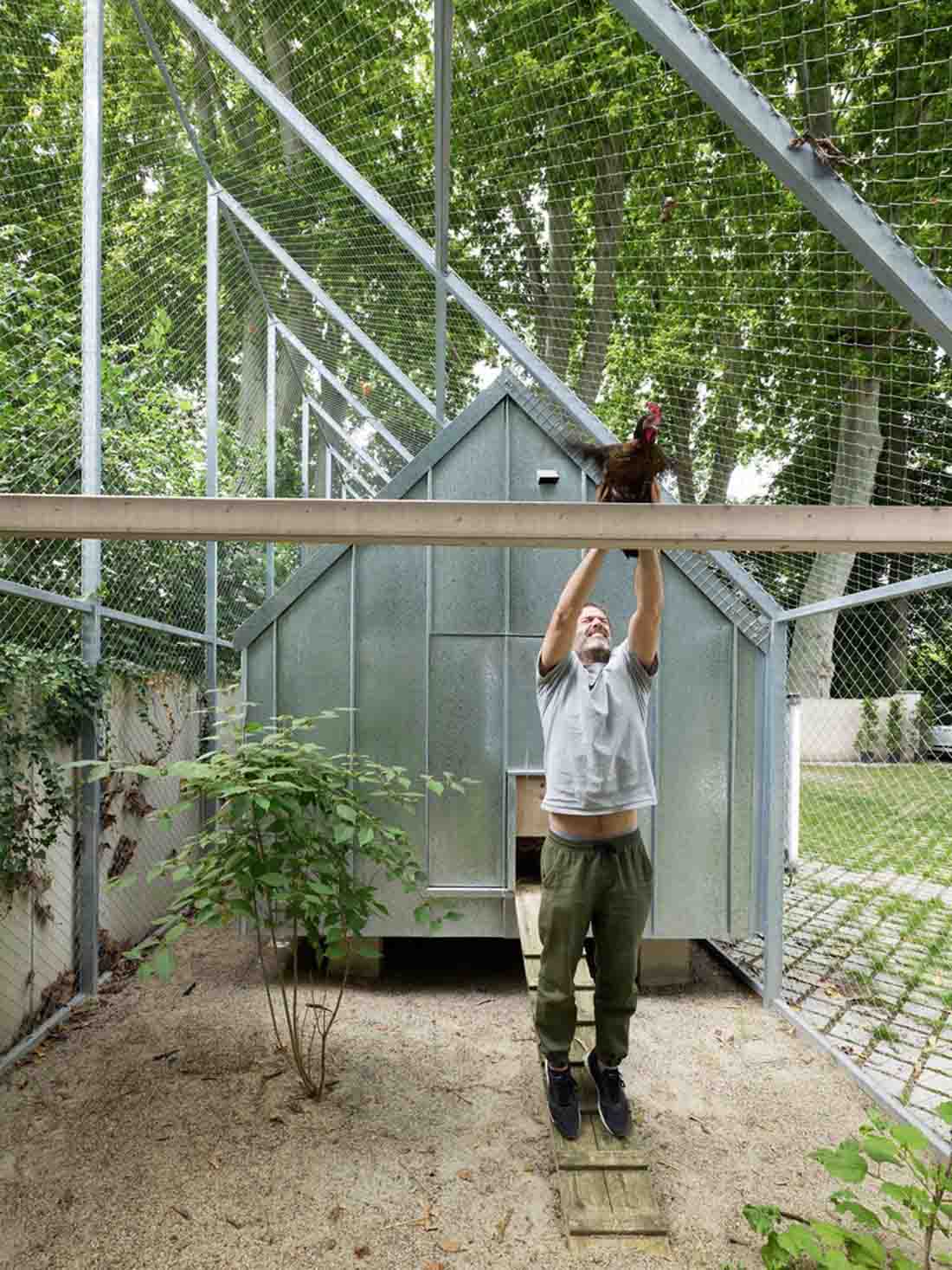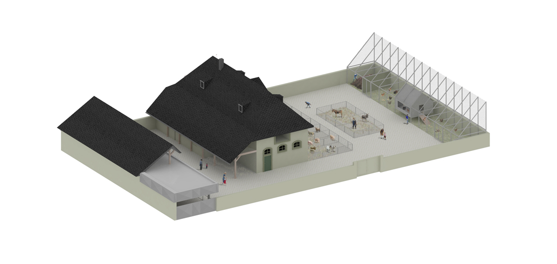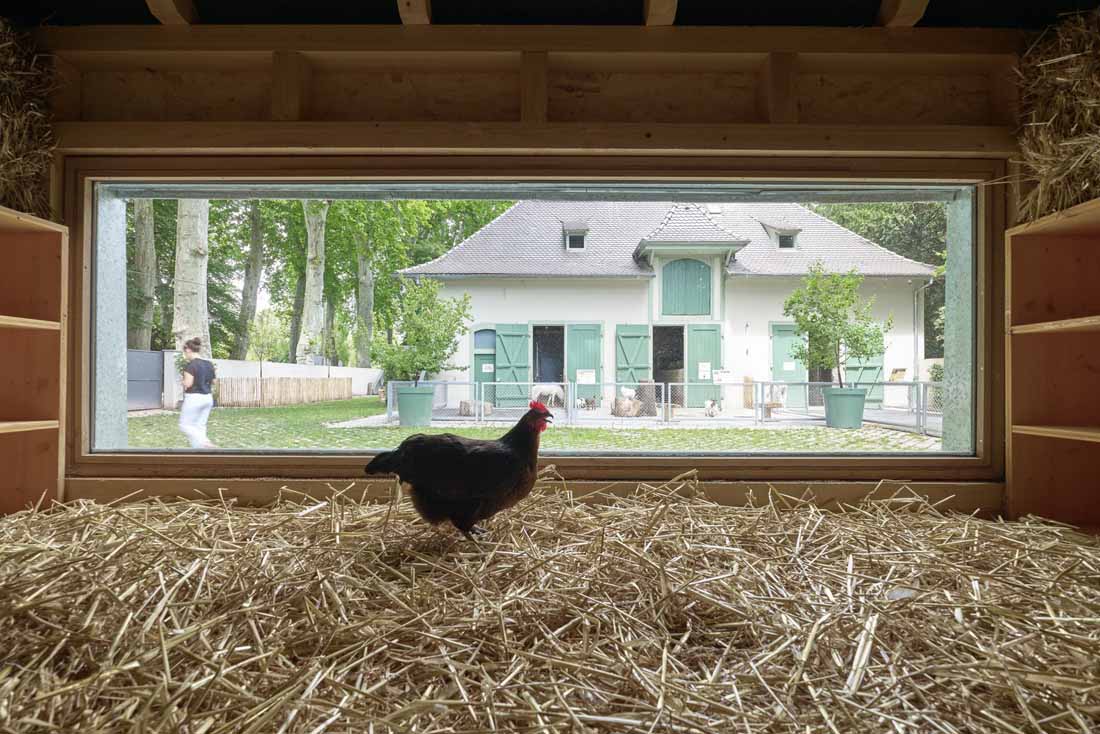 为了完成该项目,在场地边缘增加了一个新的大型鸟舍,在公园景观中扮演着地标的角色。它占据了整个宽度并达到6米高。带有大玻璃窗(加倍阴影)的鸡舍已纳入其体积。