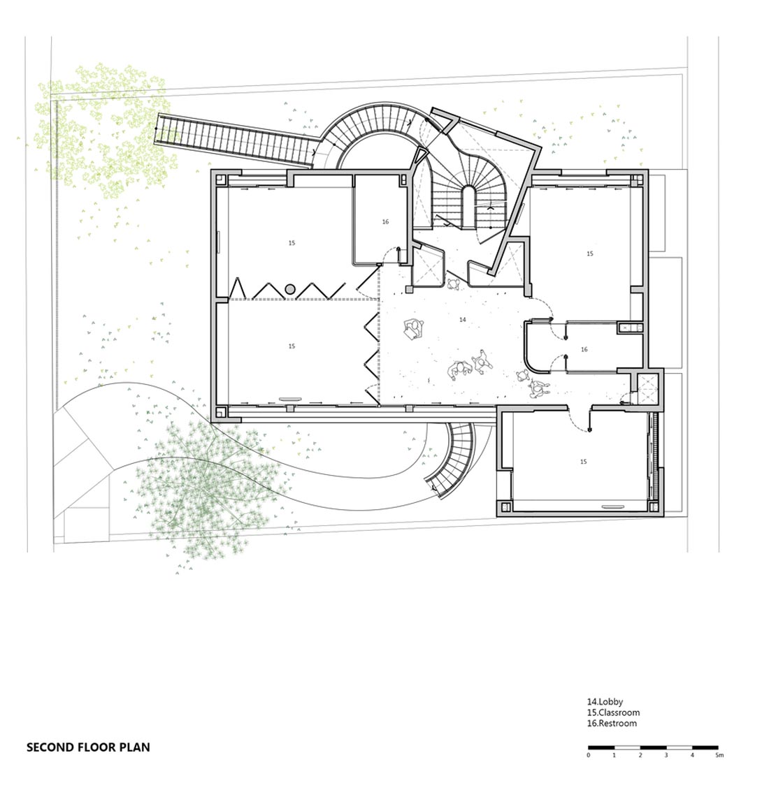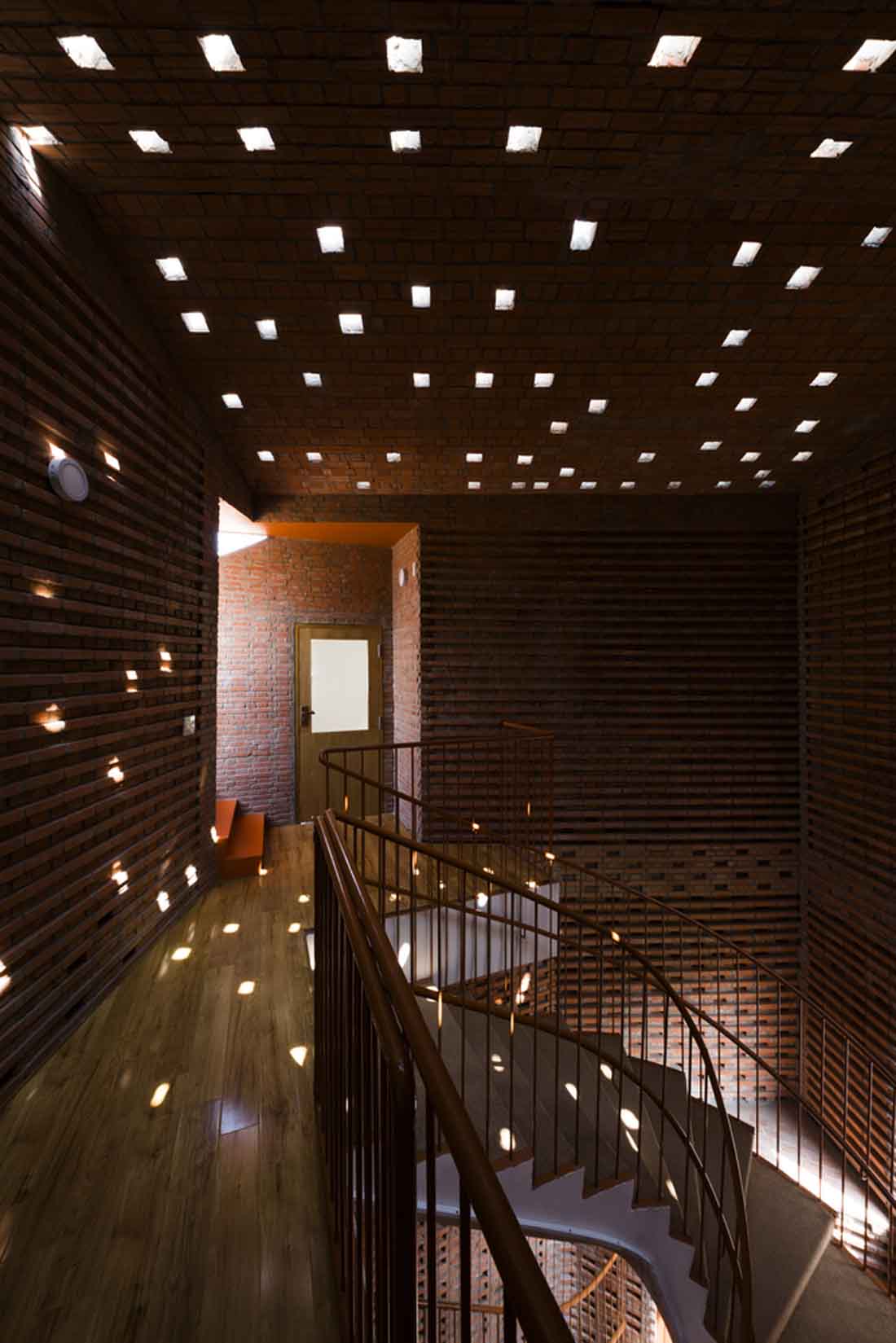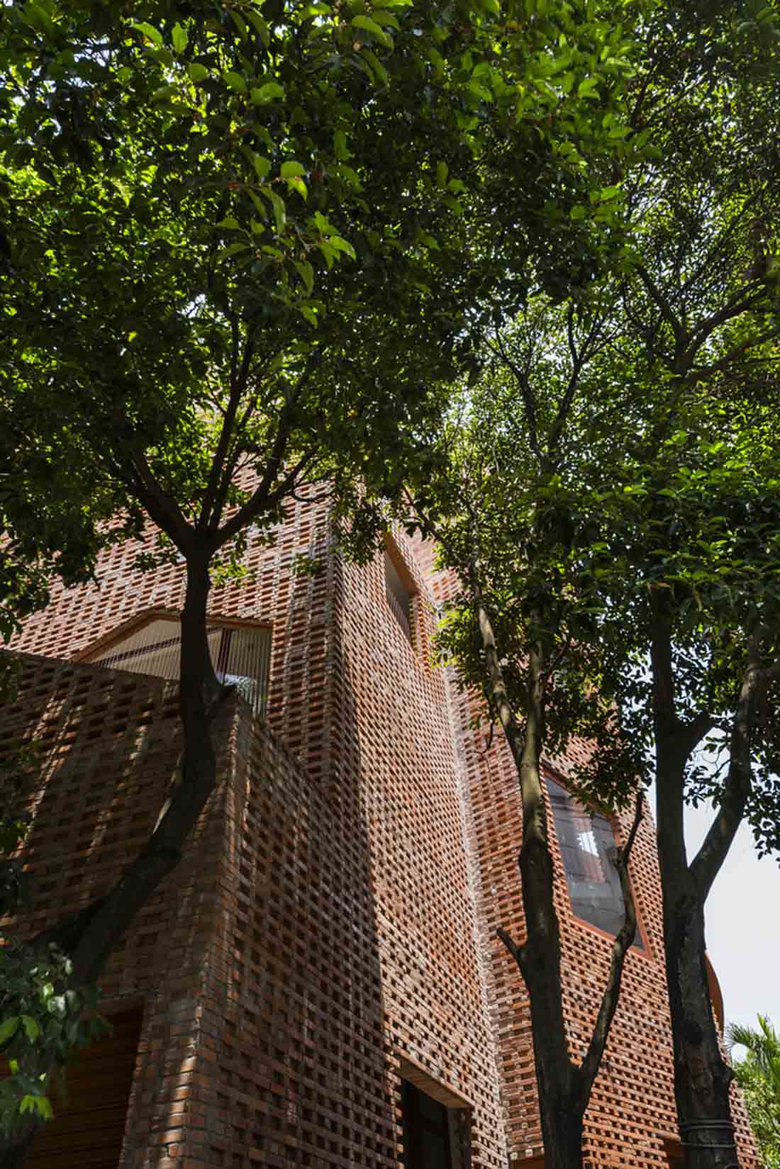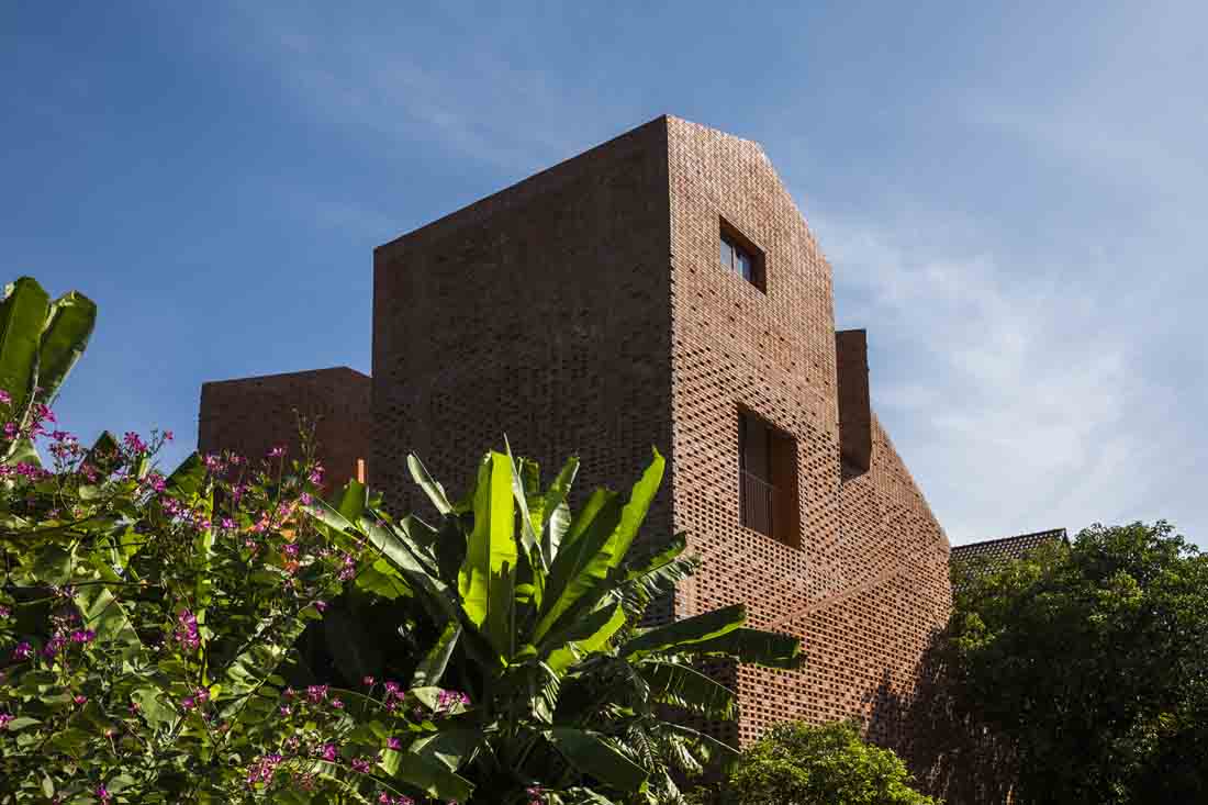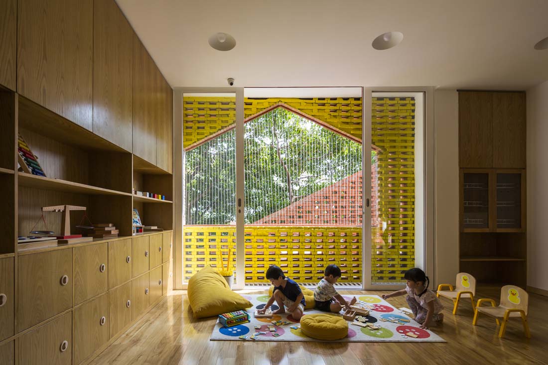 就像一座巨大的乐高建筑一样,这所幼儿园完全是用裸砖成型的图案和开口构成的,这些图案和开口让人眼前一亮,传达了独特的美学价值并促进了自然通风。教室和杂物间围绕一个有趣的核心组织。每层楼都以交替的方式排列,以增强垂直互动,鼓励儿童更容易接受周围的环境,并激发他们的内在创造力。