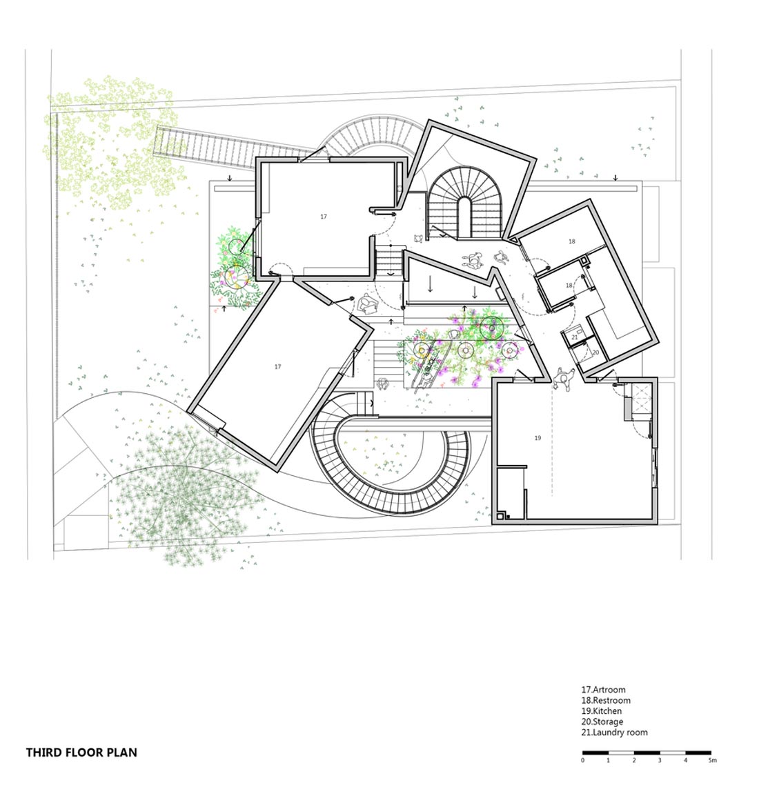 与教室的平静氛围并列,核心是充足且充满动感。从一楼的花园开始,这些空间形成了一个小孔,从外部可以看到从内向外看到的连续视角。内部空间不断向上,连接到开放的屋顶花园,等待着西贡河无限远景的丰富体验。