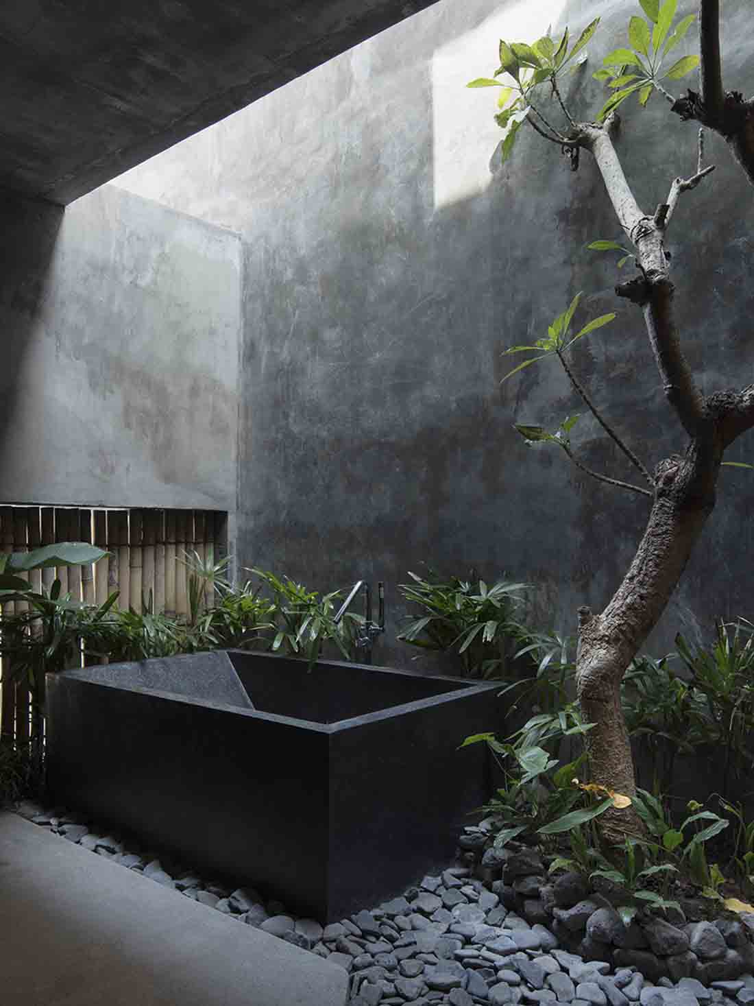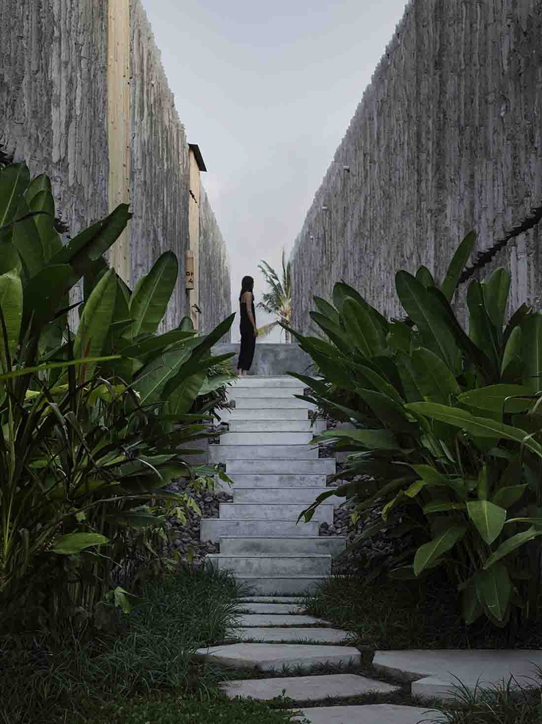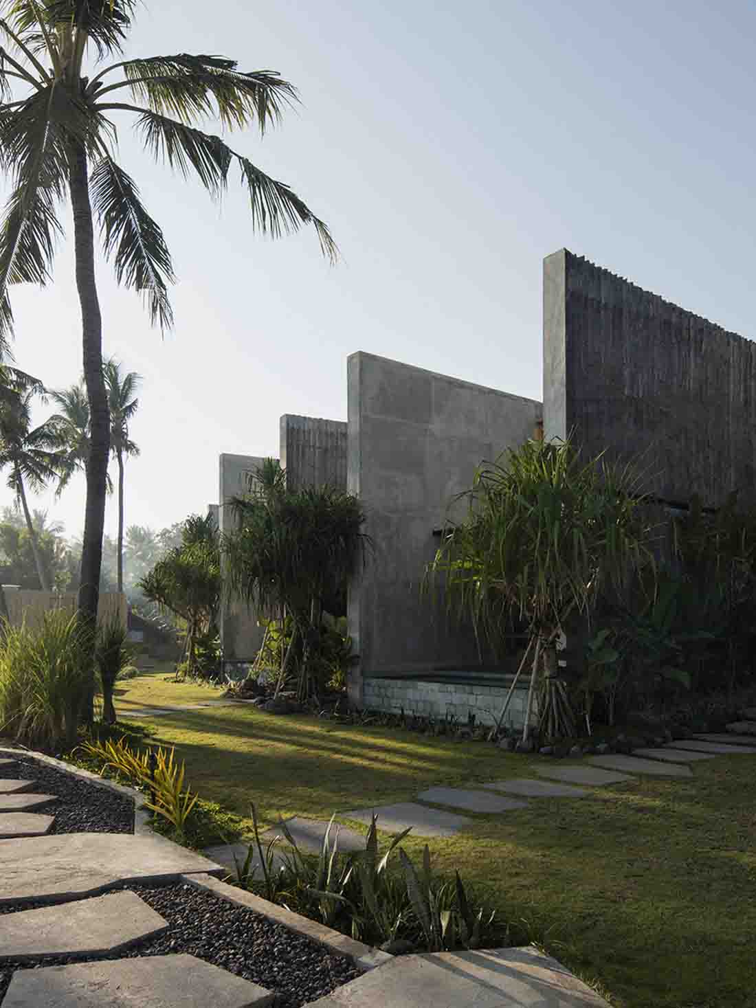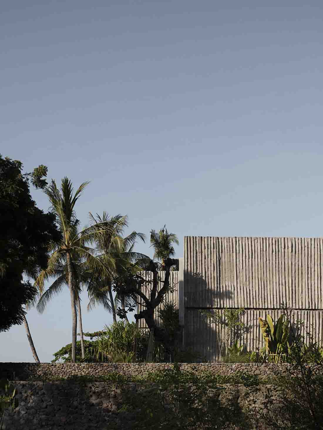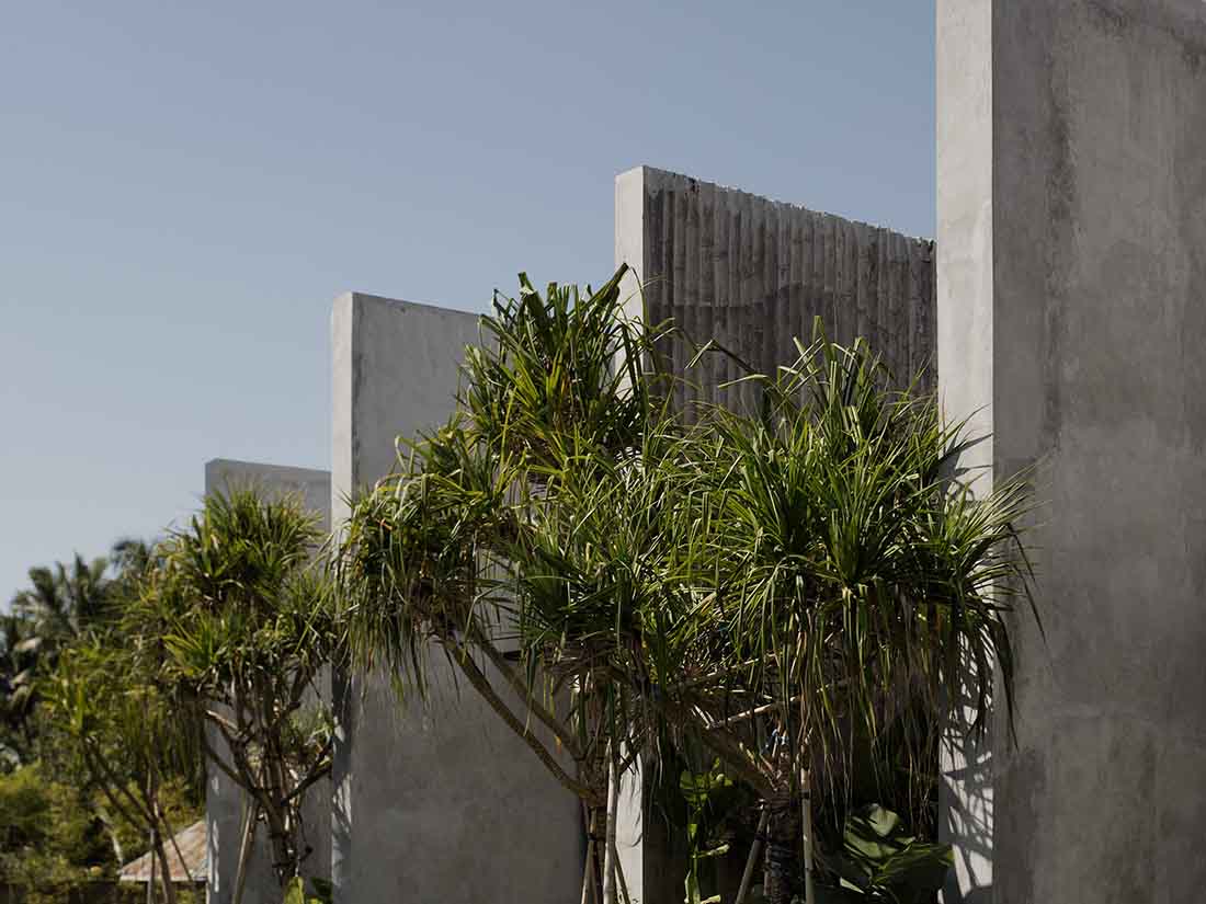 建筑坐落在岛上一个偏僻的位置,因而有意地采用了传统的材料和建造技术,构建出一个粗犷而厚重的概念性框架。考虑到巴厘岛的建筑以混凝土为主,且当地盛产竹子,建筑师为酒店打造了一系列由竹子和混凝土构成的墙壁,在形成内外过渡的同时框选出山峦与大海的景致。