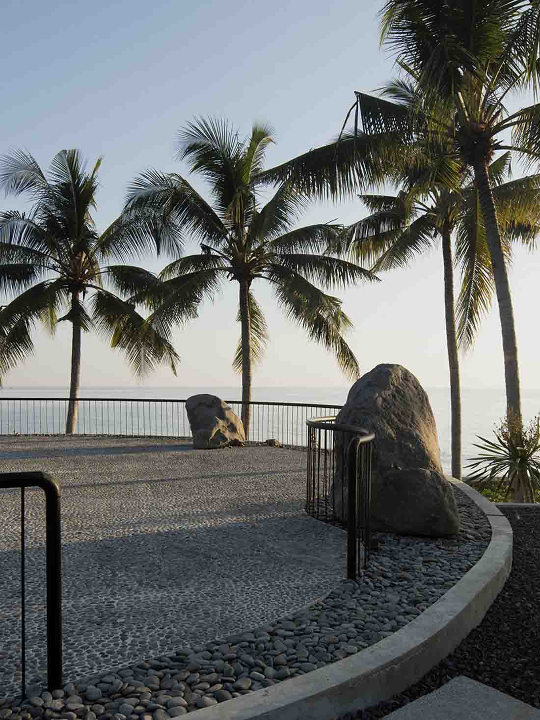 建筑的每一侧墙面都进行了切断处理,回应了巴厘岛上特有的门形结构。这些装饰以图腾的大门分布在旅行路线上,将游客的视线和精神引向前方的道路。从建筑形态上看,这些墙壁起到了汇聚性的作用,将山景和海景平均地带入每个房间,使客人时刻置身于最真实的自然环境。建筑师认为,引入双重性的景观对于旅行体验而言有着极其重要的意义。