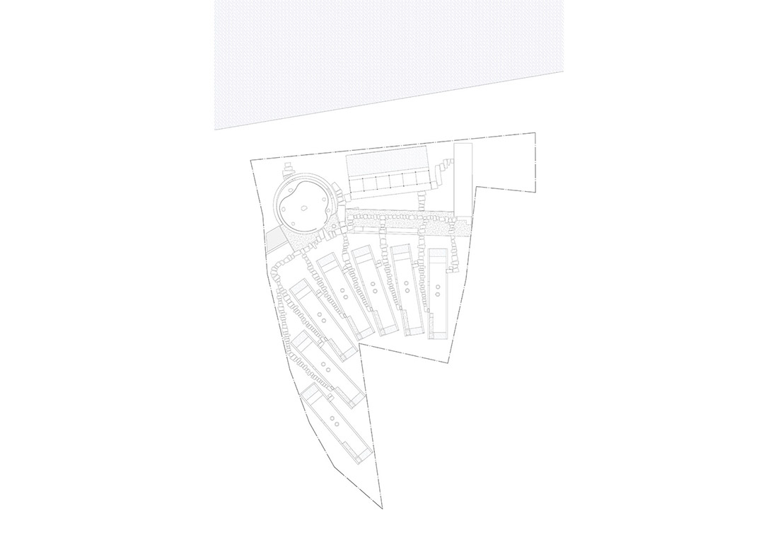 清洗空间位于场地中心,是朴素环境中一处难得的经过精心打磨的空间。每个空间都设有一个光井,将幽暗而孤绝的空间与天空相连。该空间在周围环境的保护和掩映下成为了一处放松身心的庇护所,为人们创造了接触和享受自然的机会。