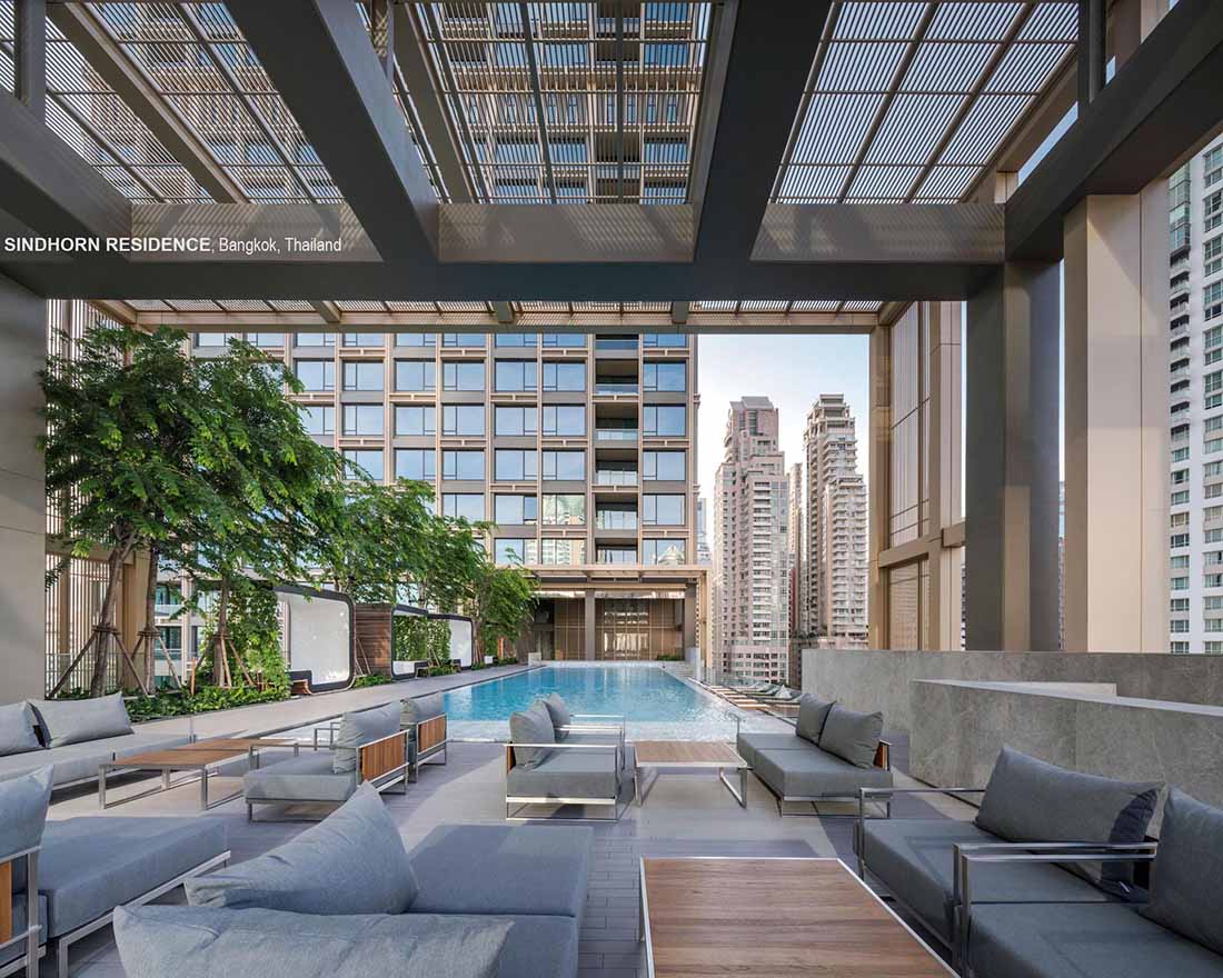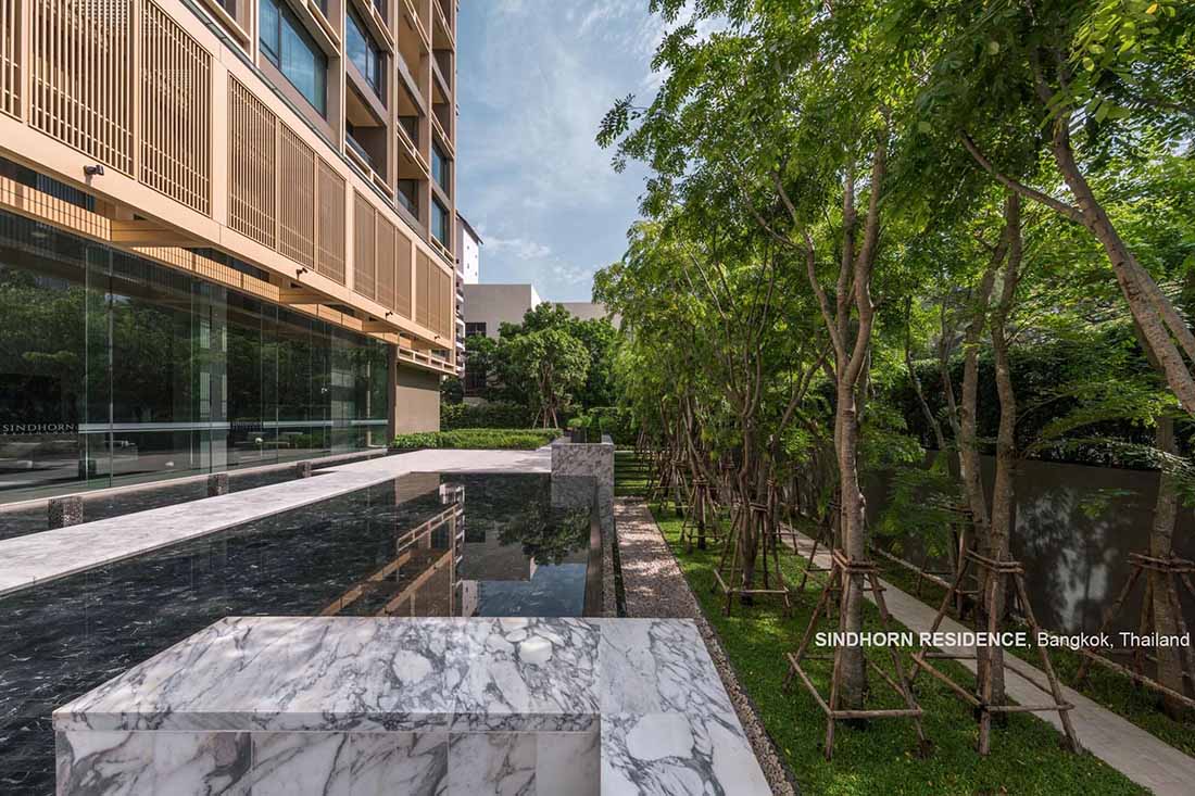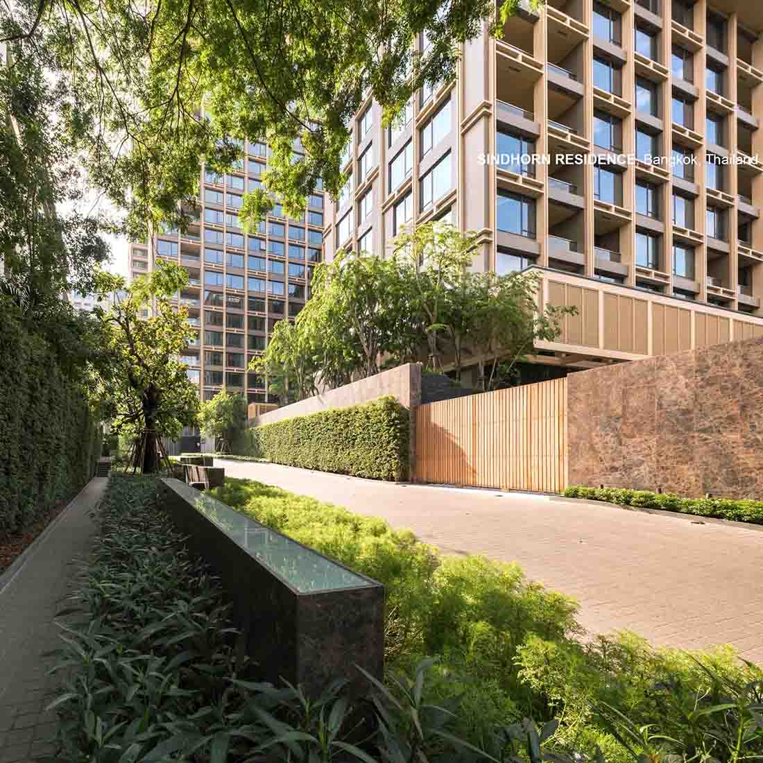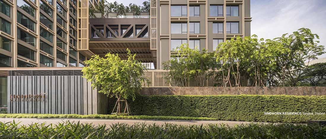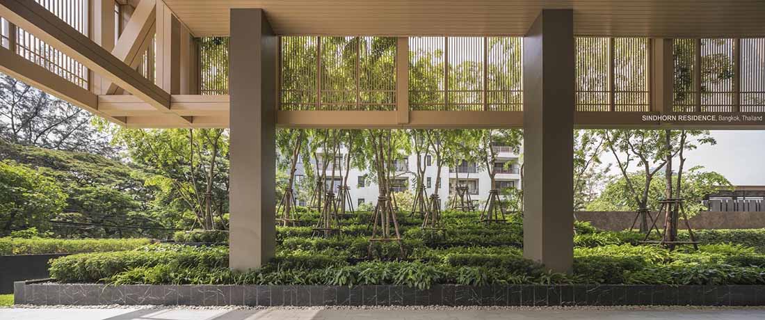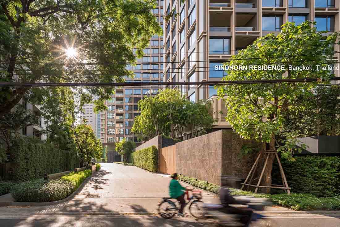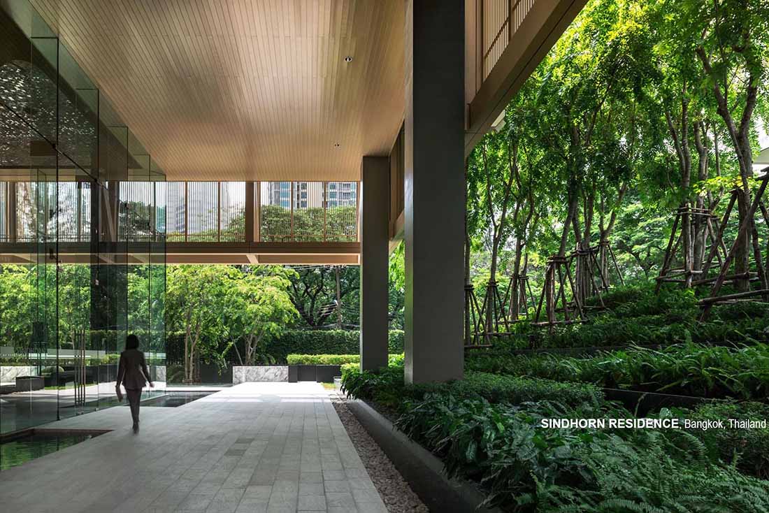 Sindhorn Residence是位于曼谷核心腹地区的住宅项目。虽然地处绿化茂密的荷兰大使馆对面,场地本身却很有限,只有A B两栋塔楼,再加上消防上的限制,项目团队需要良好地利用剩余不多的空间营造绿化效果。