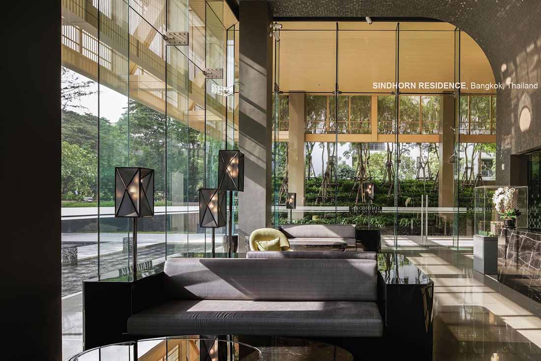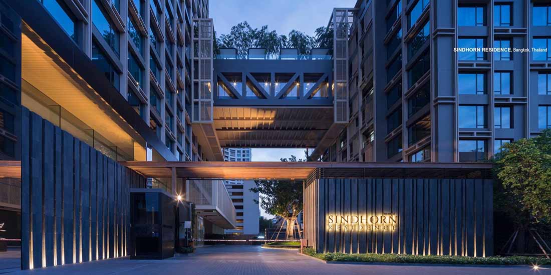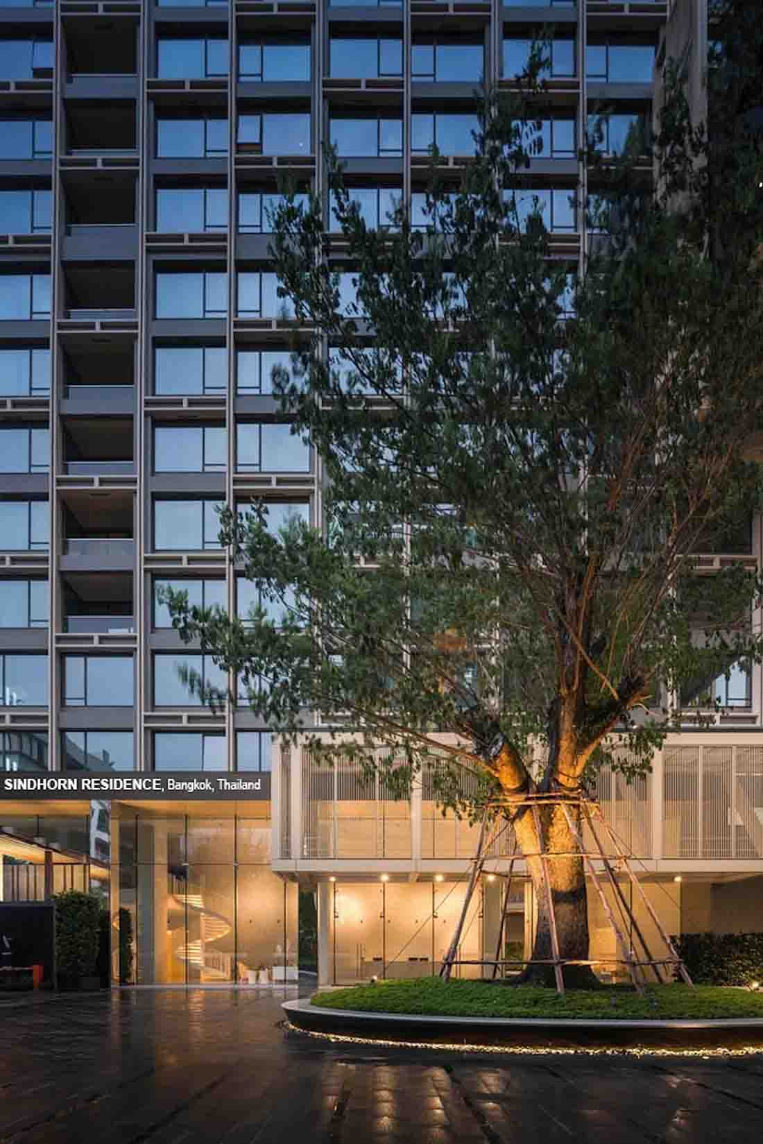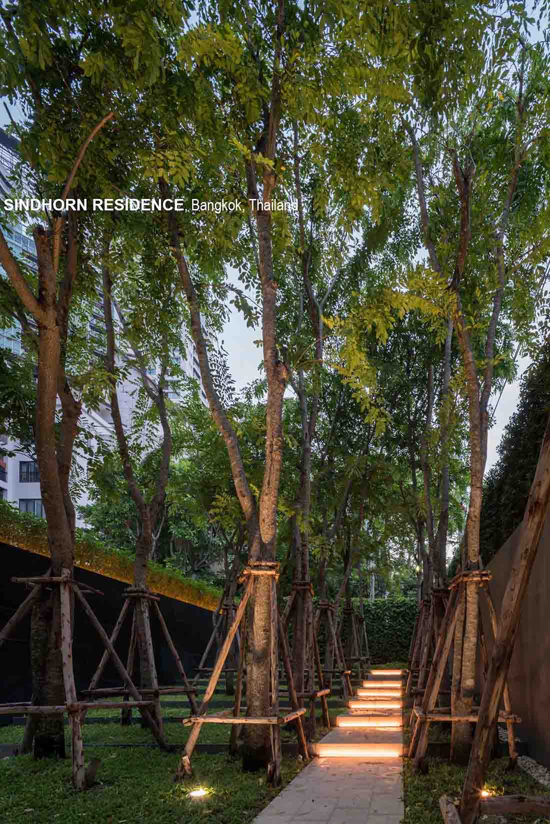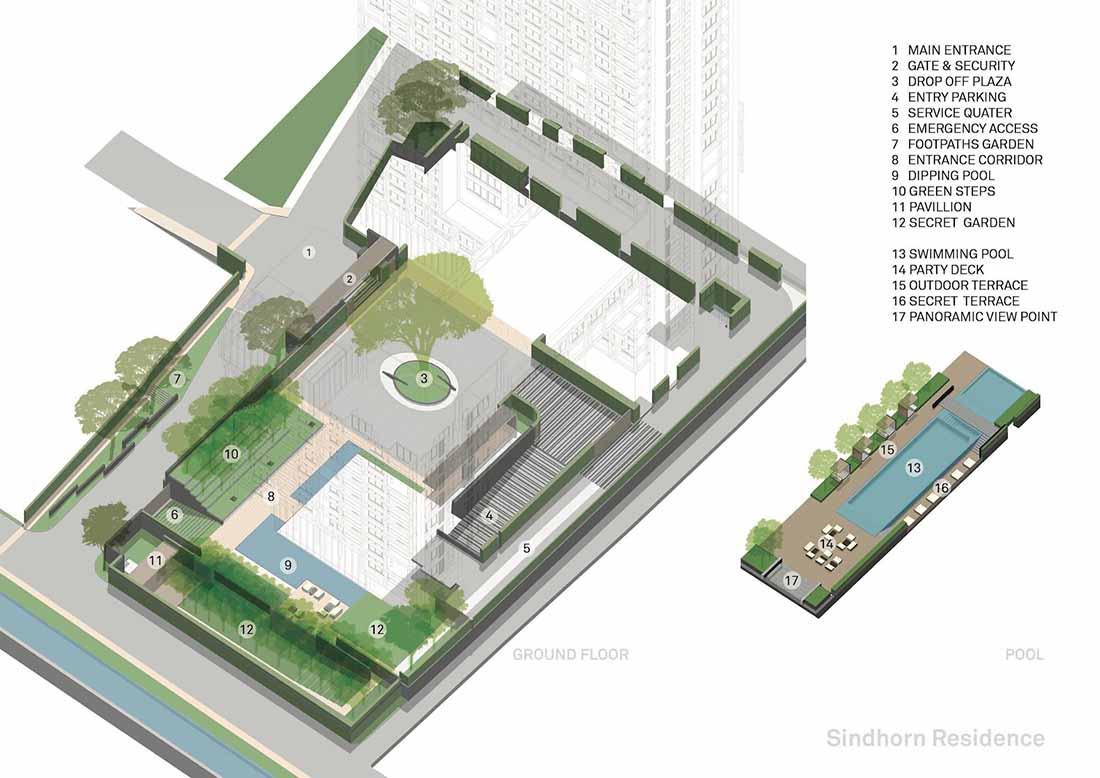 Sindhorn Residence是位于曼谷核心腹地区的住宅项目。虽然地处绿化茂密的荷兰大使馆对面,场地本身却很有限,只有A B两栋塔楼,再加上消防上的限制,项目团队需要良好地利用剩余不多的空间营造绿化效果。