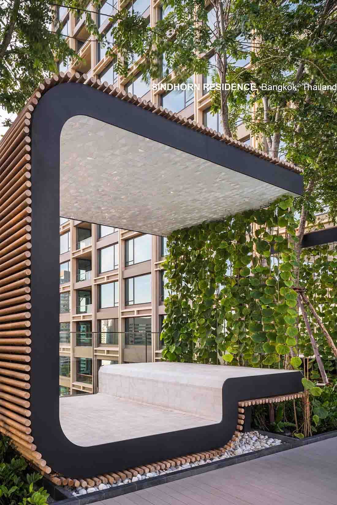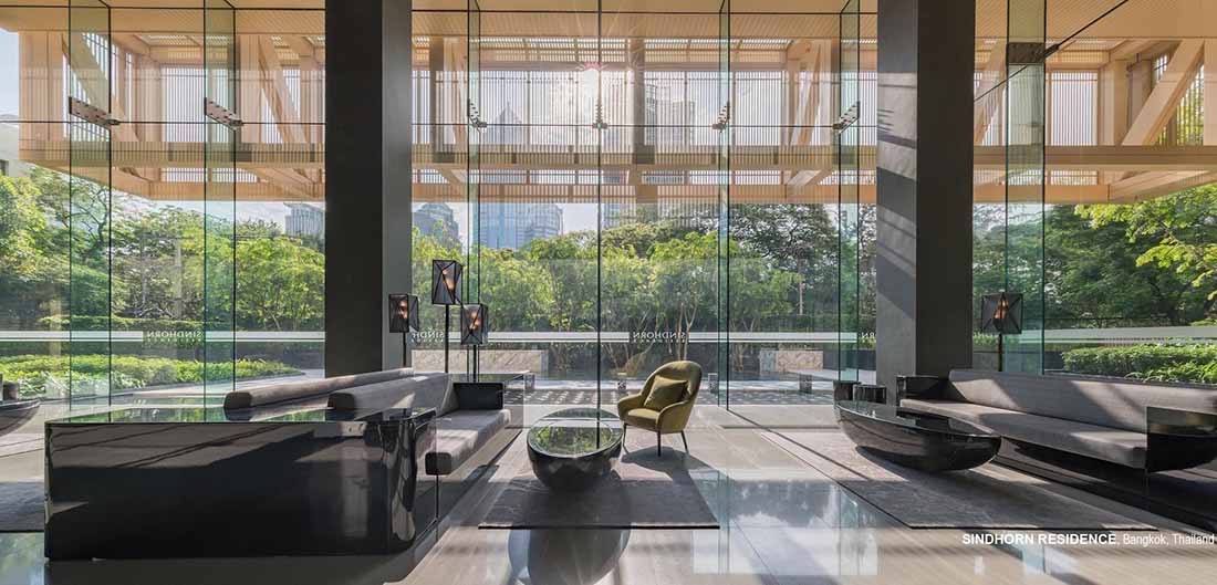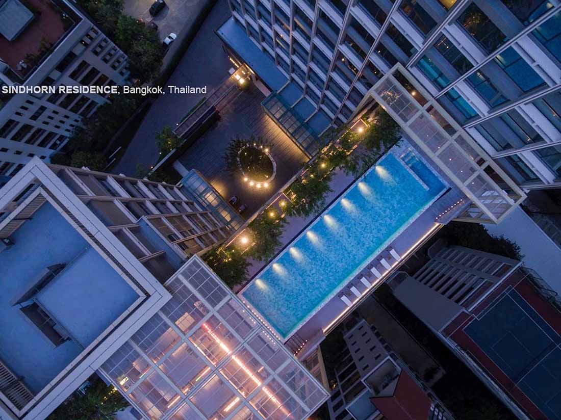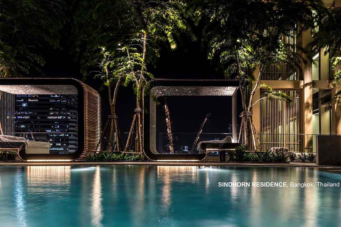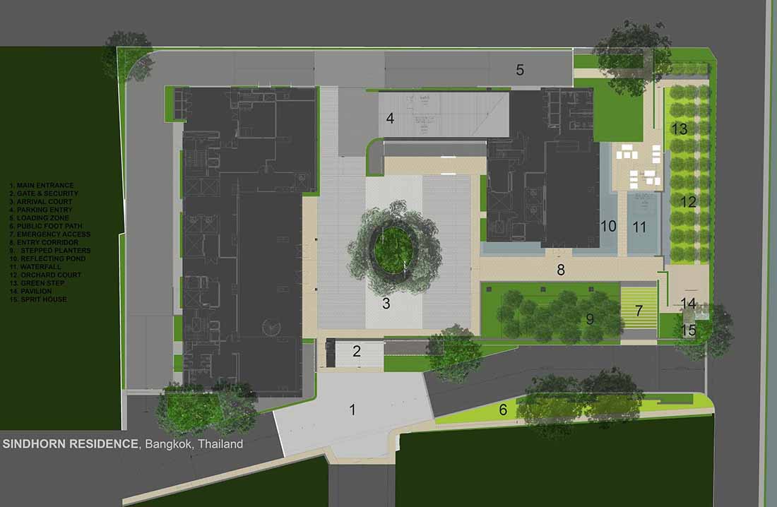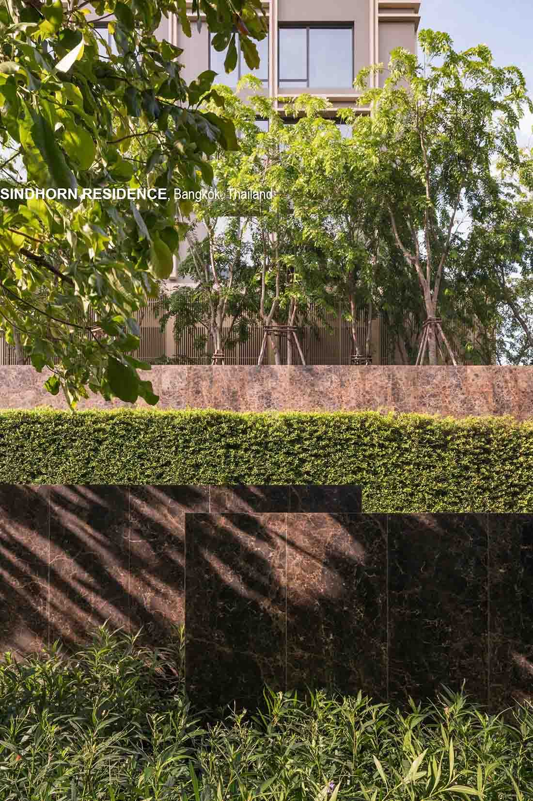 Sindhorn Residence是位于曼谷核心腹地区的住宅项目。虽然地处绿化茂密的荷兰大使馆对面,场地本身却很有限,只有A B两栋塔楼,再加上消防上的限制,项目团队需要良好地利用剩余不多的空间营造绿化效果。