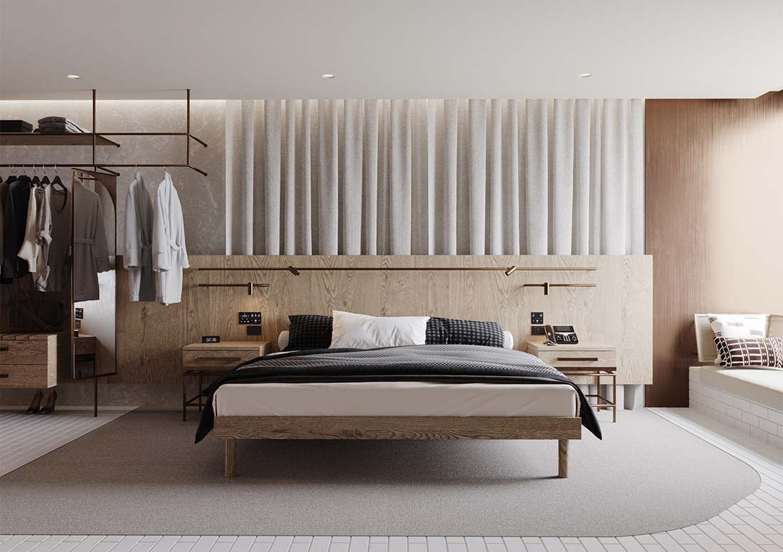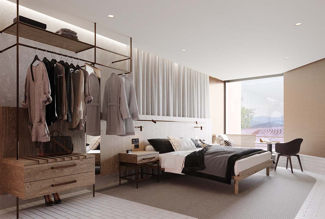 该开发项目包括196间客房,精品酒厂,餐厅,会议空间和水疗中心。出乎意料的形状和角度是内部造型的标志,大厅,客房,娱乐场所和走廊都设有隐蔽的通道和舒适的凹槽。皮革,天然混凝土,金镶板和风化木材将用作固定装置和家具,以唤起温暖和豪华感,而柳条和粗糙切割的石材则紧贴抛光砖和裸露的骨料表面。