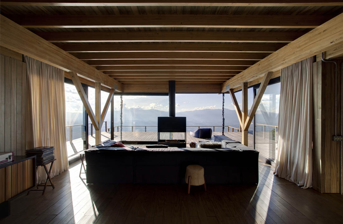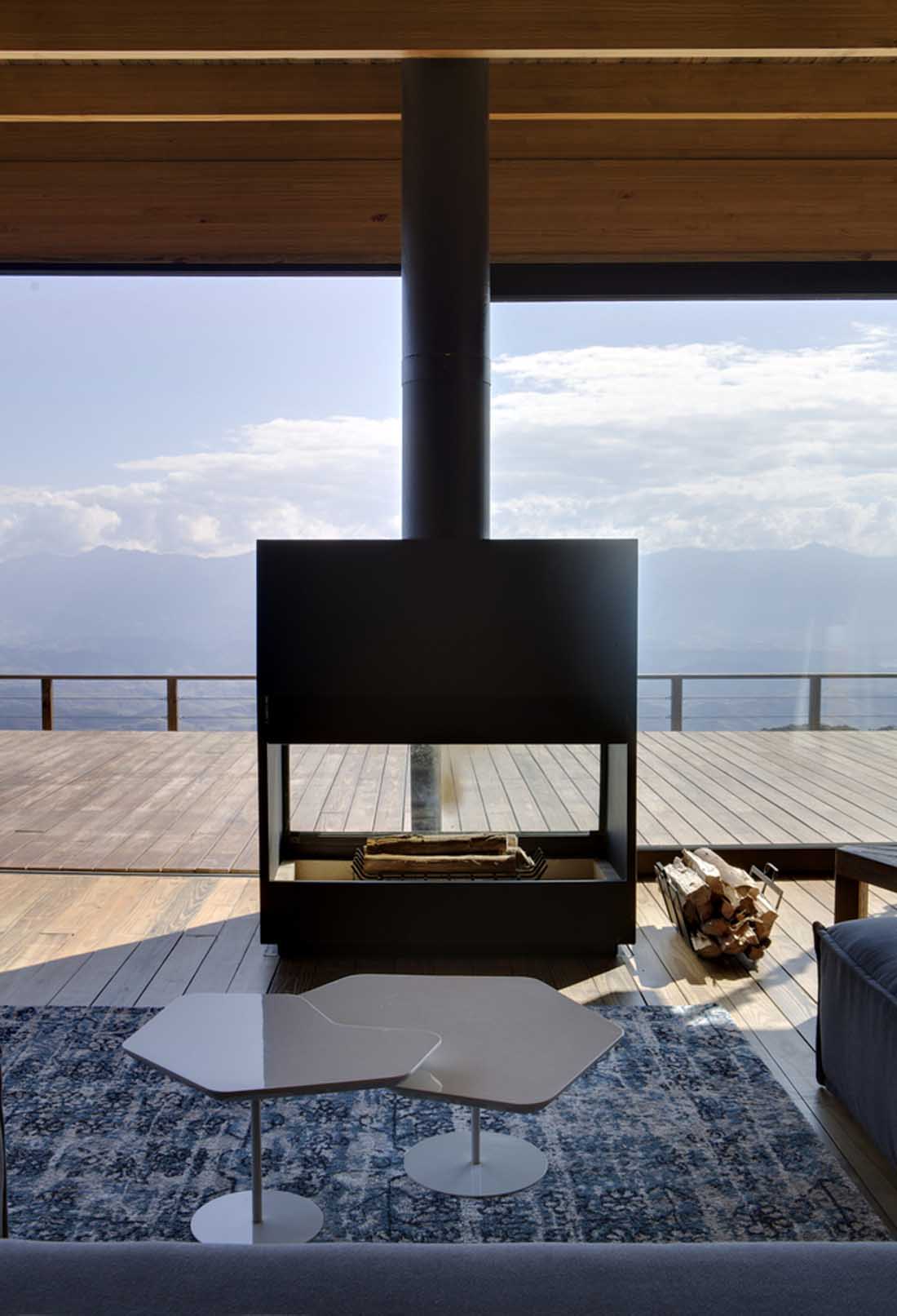 房屋的“空”和中央主体容纳了住宅的整个社会区域,应完全透明并与景观和自然融为一体。客厅,电视室和厨房的天花板高度较高,木结构裸露在外。大型玻璃面板将内部和外部分隔开来,并在景观背景中增强了周边景色的视野。