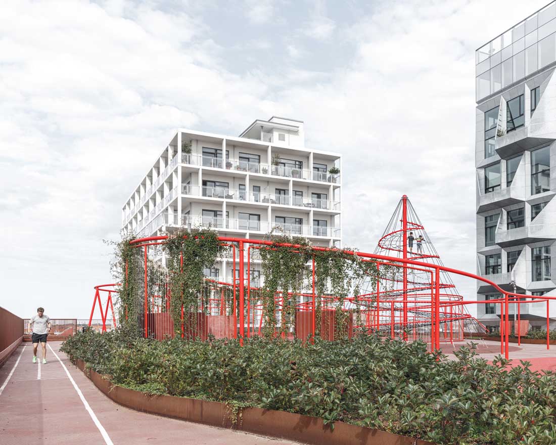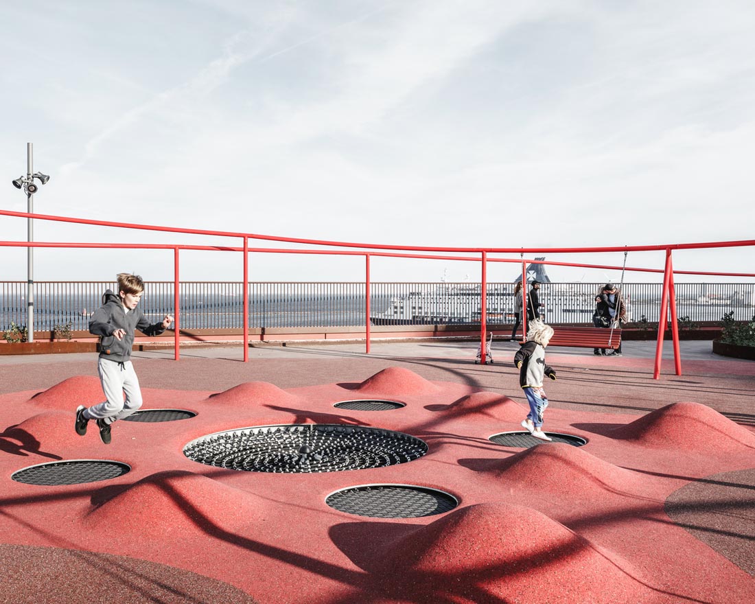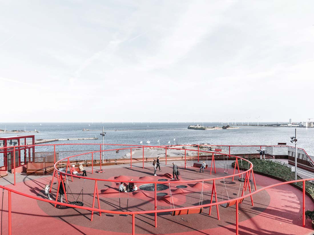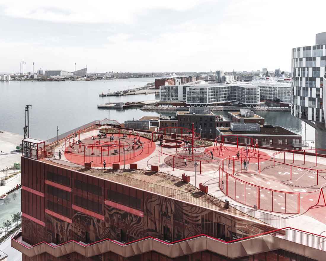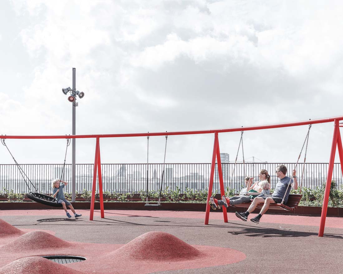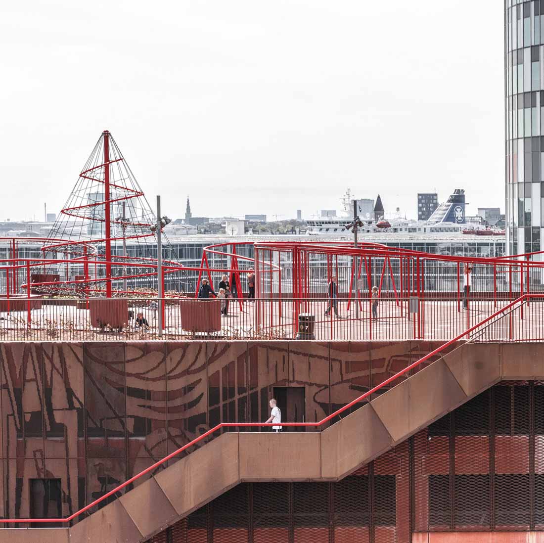 立面上的植物箱网格被两个大型公共楼梯穿过,这些楼梯具有连续的栏杆,成为屋顶上的梦幻般的游乐场。从单纯的栏杆变成了秋千,球笼,丛林体育馆等等。从街道上看,栏杆实际上牵着游客,营地邀请他们参观屋顶景观,欣赏哥本哈根海港的壮丽景色。