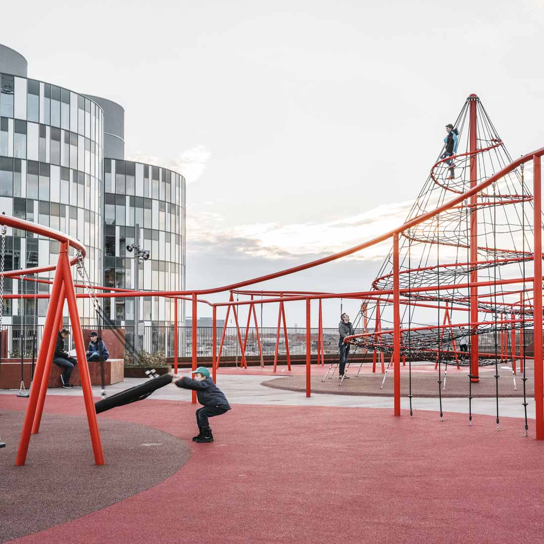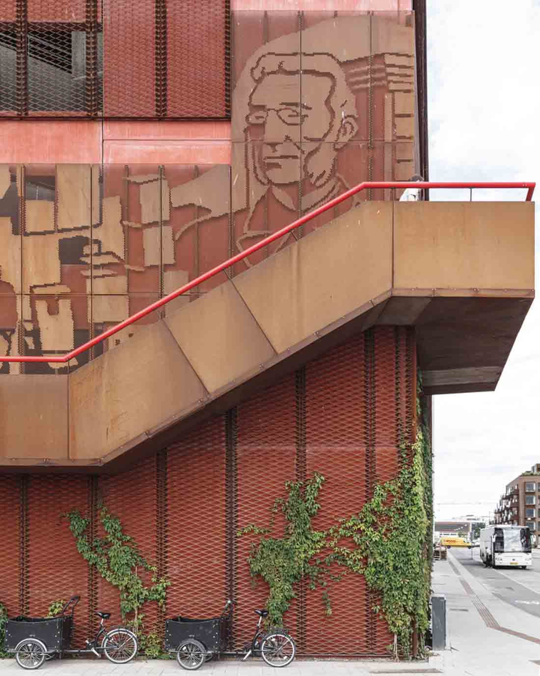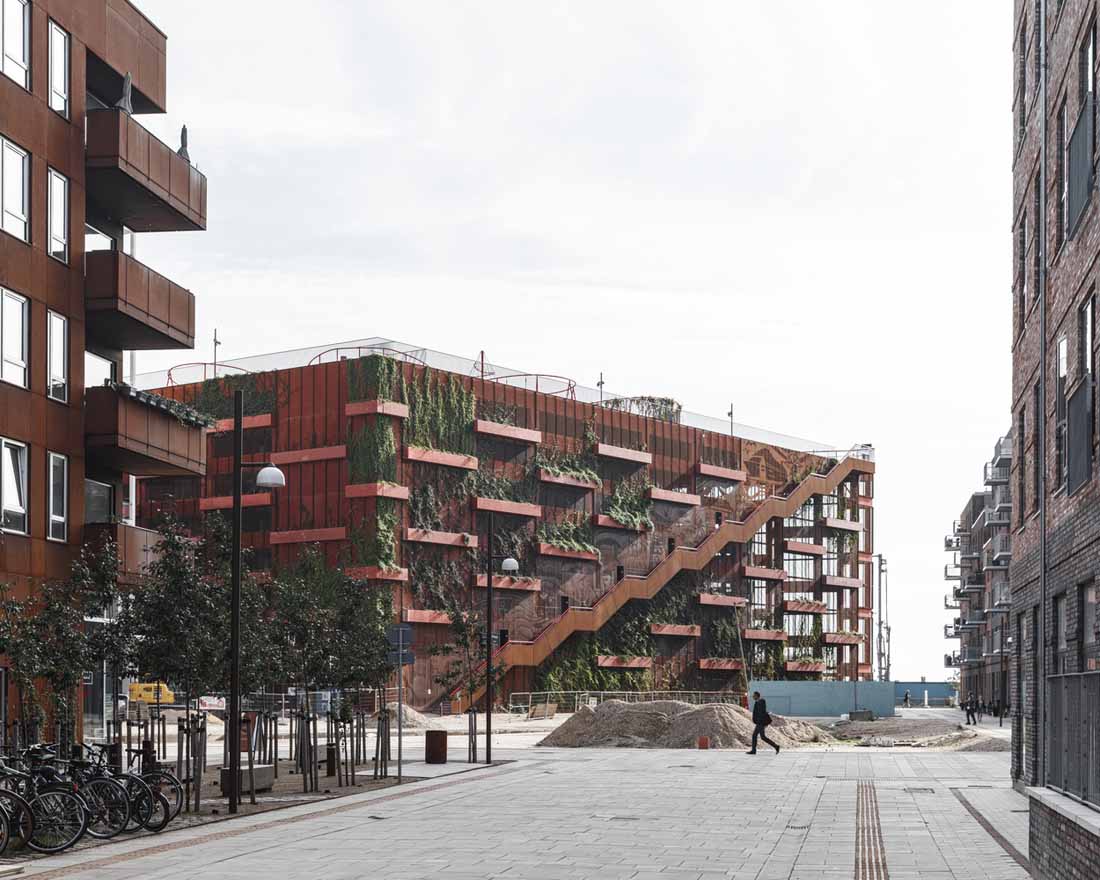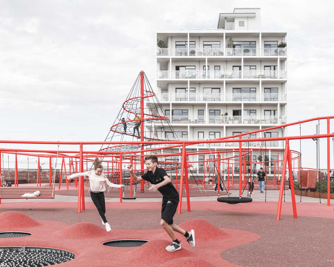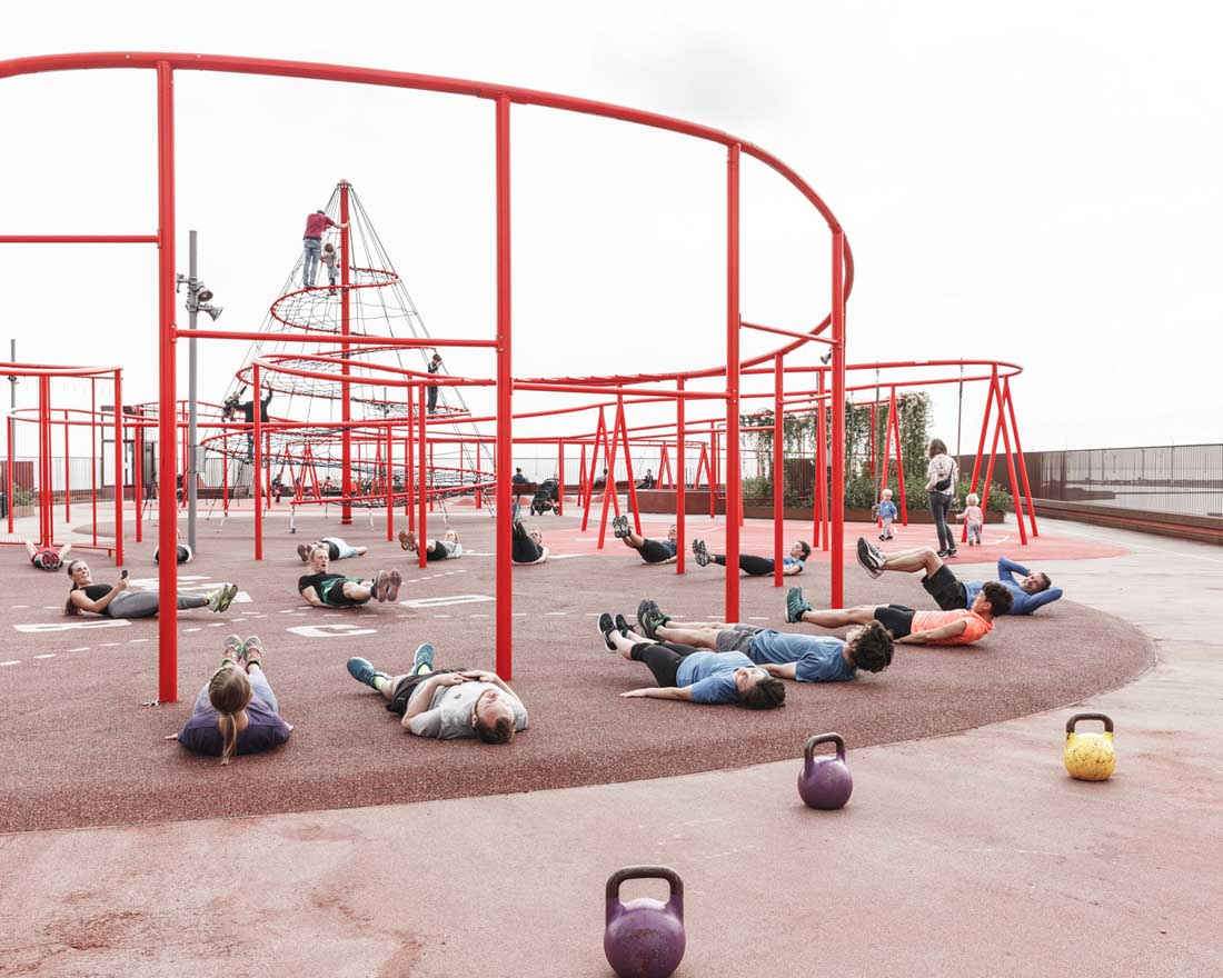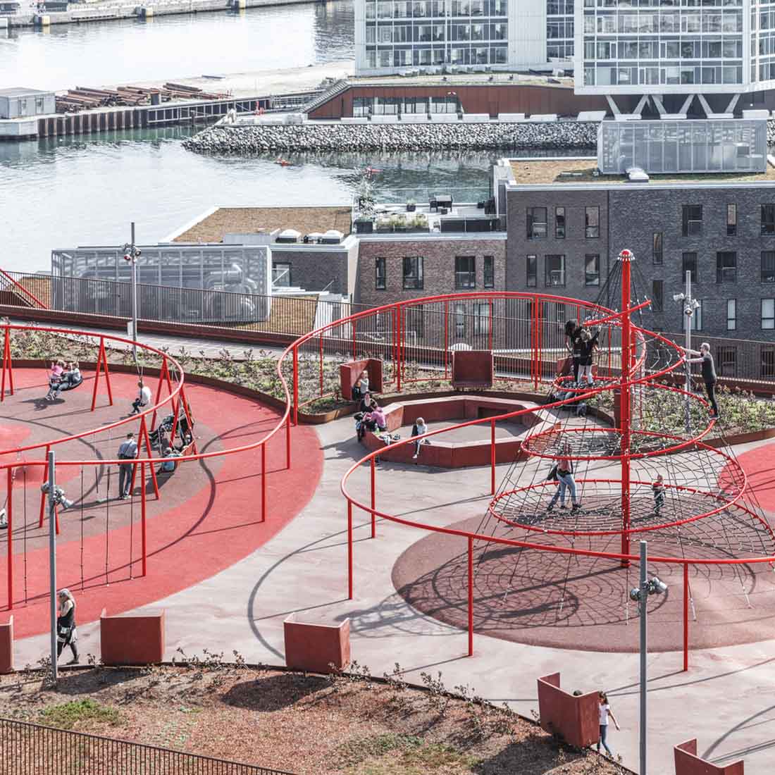立面上的植物箱网格被两个大型公共楼梯穿过,这些楼梯具有连续的栏杆,成为屋顶上的梦幻般的游乐场。从单纯的栏杆变成了秋千,球笼,丛林体育馆等等。从街道上看,栏杆实际上牵着游客,营地邀请他们参观屋顶景观,欣赏哥本哈根海港的壮丽景色。