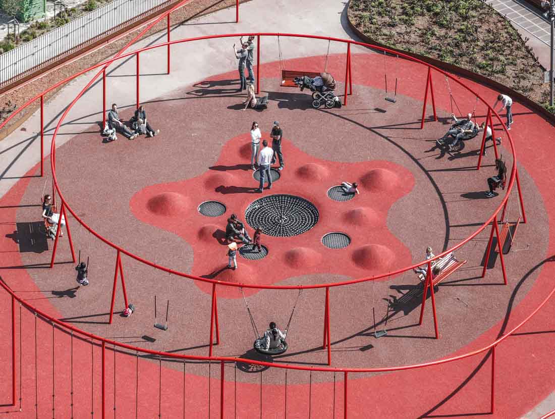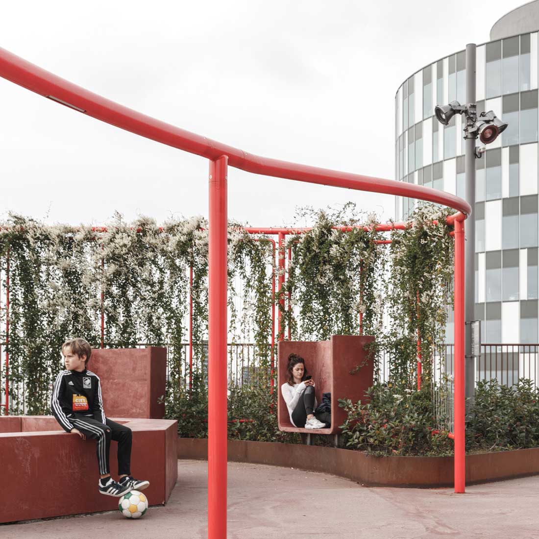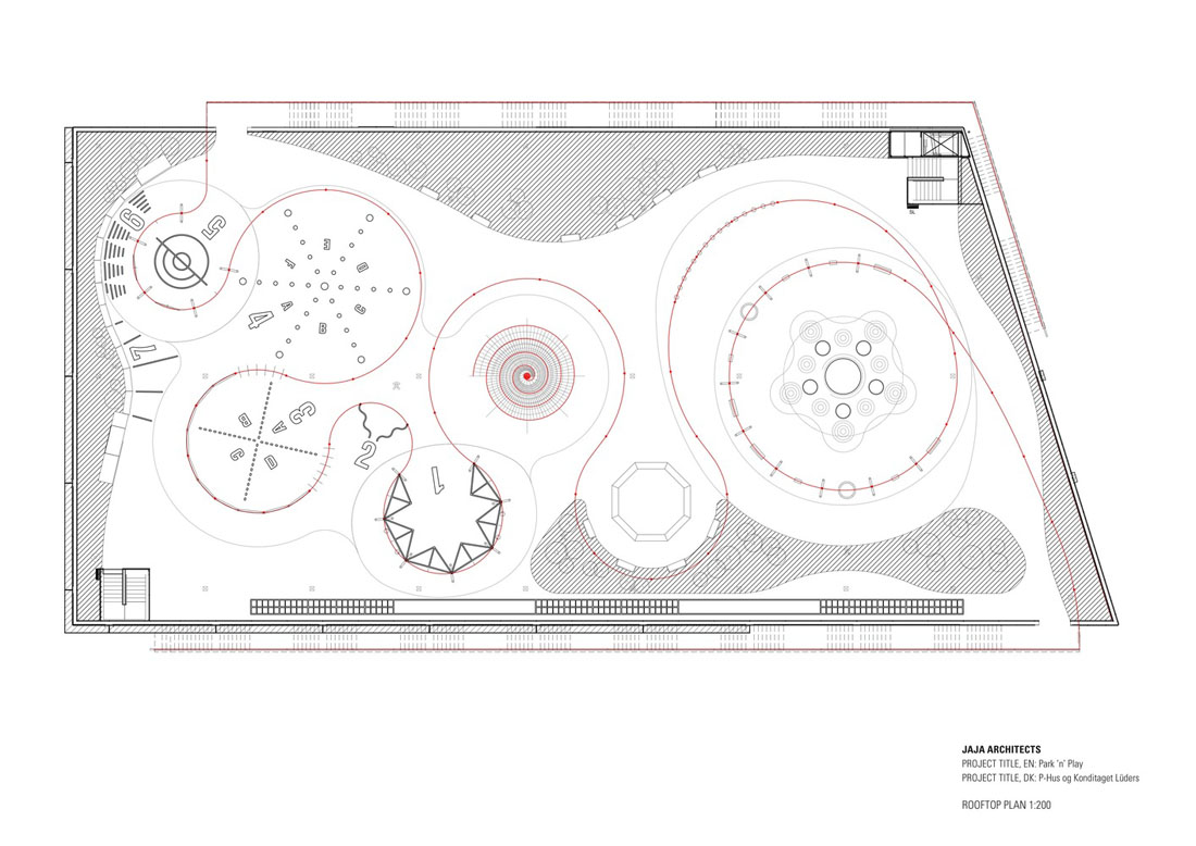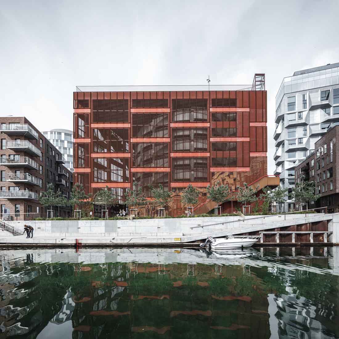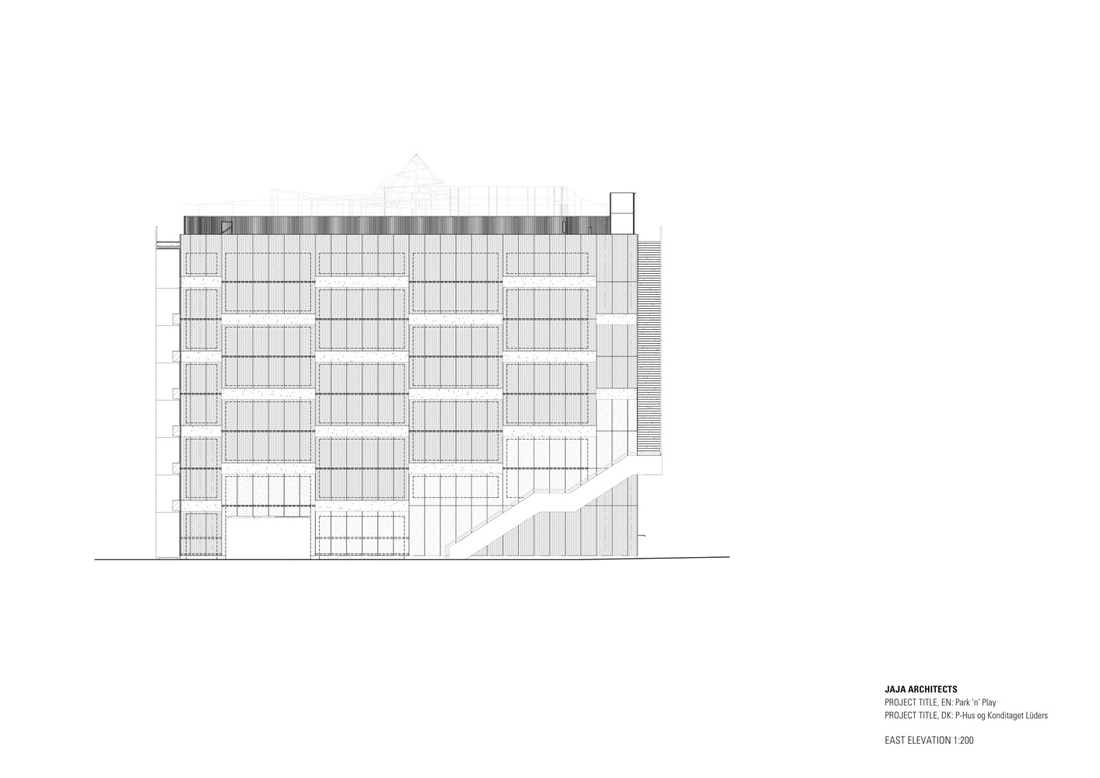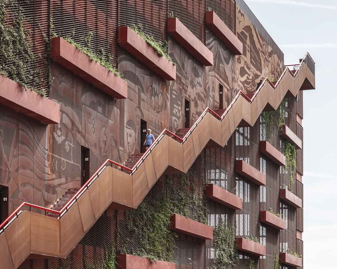立面上的植物箱网格被两个大型公共楼梯穿过,这些楼梯具有连续的栏杆,成为屋顶上的梦幻般的游乐场。从单纯的栏杆变成了秋千,球笼,丛林体育馆等等。从街道上看,栏杆实际上牵着游客,营地邀请他们参观屋顶景观,欣赏哥本哈根海港的壮丽景色。