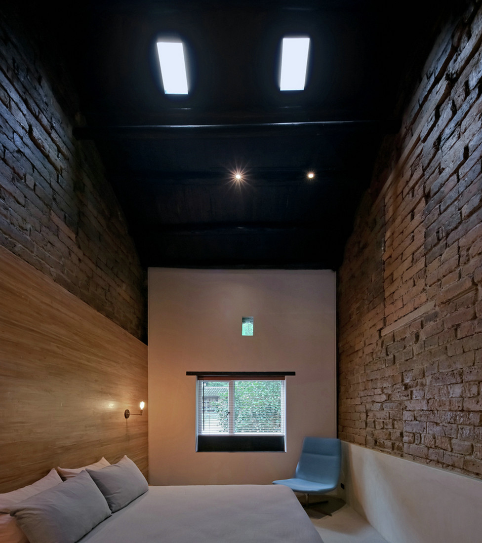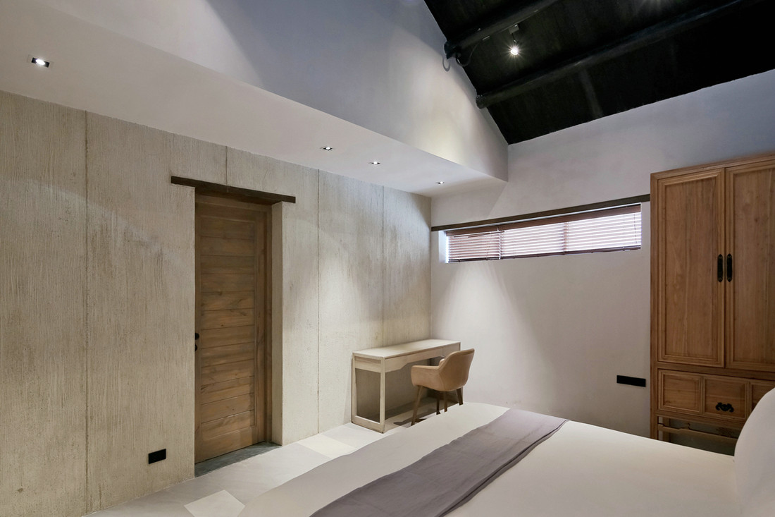 原有农宅的室内虽然久经年代的风雨而显得破旧,但却不失空间上的趣味, 典型的一栋青瓦黄土砖屋为三开间,中间为二层挑高的厅堂,两侧各有四小间房,二层为杂物储藏用。在改造中,保留了原建筑的木结构,黄土墙,坡屋面及顶上透光的“亮瓦“,在功能上一层的厅堂保留并设有吧台,沙发, 是客人小聚的社交空间, 客厅的两侧各有一间客房,厅堂中增加了通向二层两间客房的楼梯。