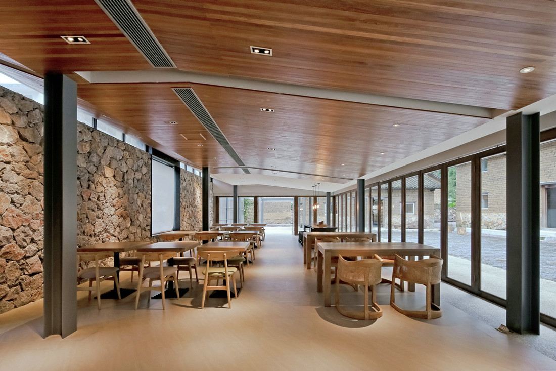 新建的餐厅则用了一种更为低调的建筑语汇,以变截面钢结构和玻璃中轴门窗系统与毛石外墙、炭化木格栅、和屋面陶土瓦形成一种材料对比,新老建筑形成的空间对话和延续感则是维系外来(酒店)与本土(农村)自然共生的基本法则