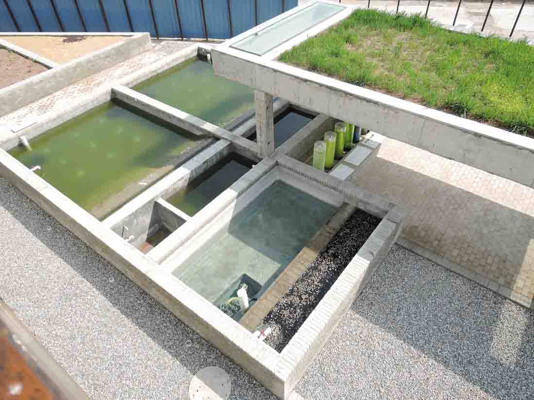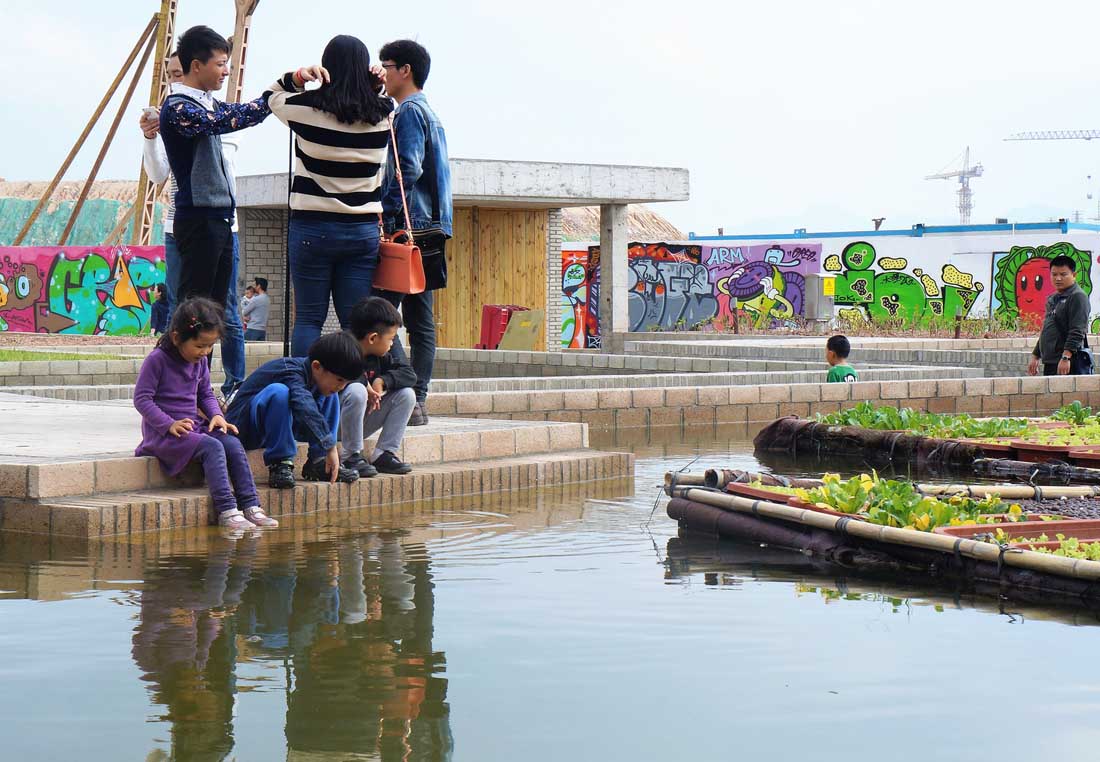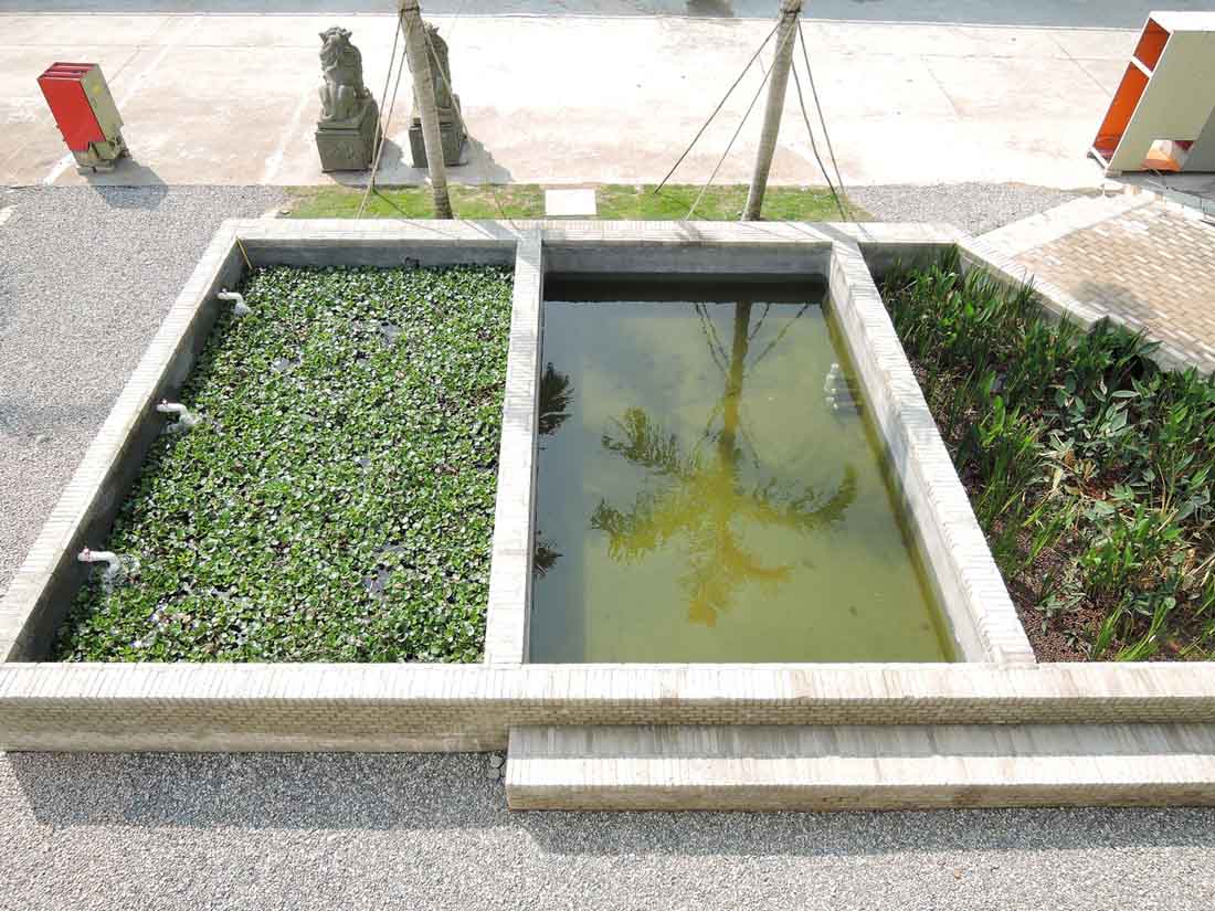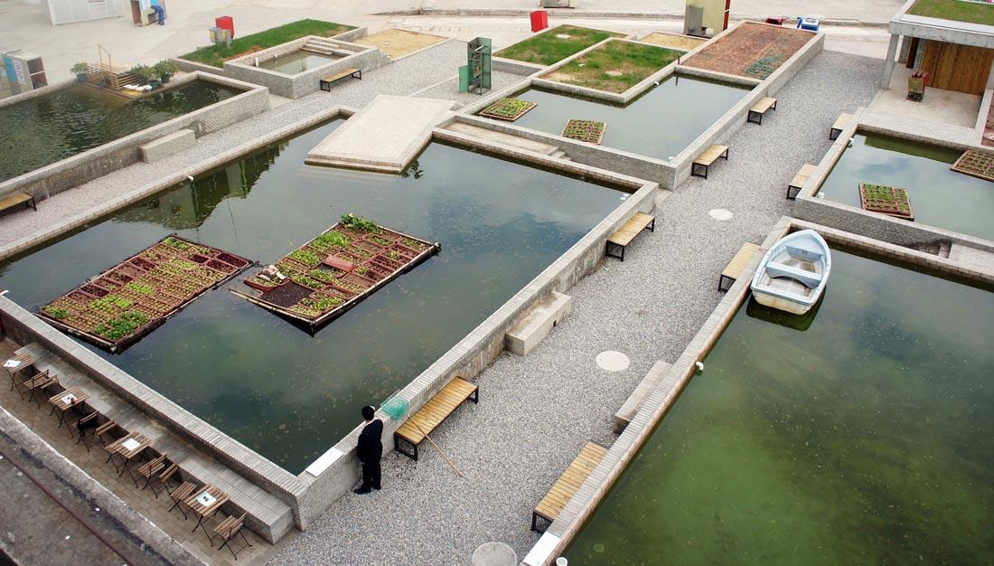 一系列相连的池塘具有多种的水体功能,创造了完整的水循环,包围整个旧宿舍楼。宿舍楼线性的体型被转化成了展览的多功能学习资源中心、圆桌空间、图书馆和一家咖啡餐厅。当代化的桑基鱼塘场地结合了低级的养耕共生方式。种植的桑树用来喂养展厅中的桑蚕;水体形成了一系列的过滤池走廊,其中有可以用来净化水质和喂鱼的水草;彩色的微型藻特意进行种植和收获,可以提升水体的自净功能,同样也可以用来喂鱼。