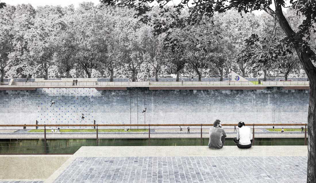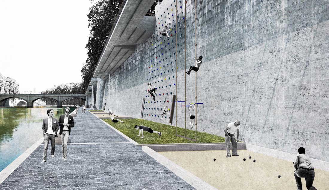 下面的河边走廊可以玩地滚球、爬墙、做引体向上、爬绳、坐在水边、散步、骑自行车、观看大型艺术展、在浮动的音乐厅上观看表演。当夜幕降临,台伯河广场变成了一个表演的舞台,你可以从上观看,也可以从下观看。投影仪在屏幕上的放映是共享的,这种共享体验也存在于整个广场。