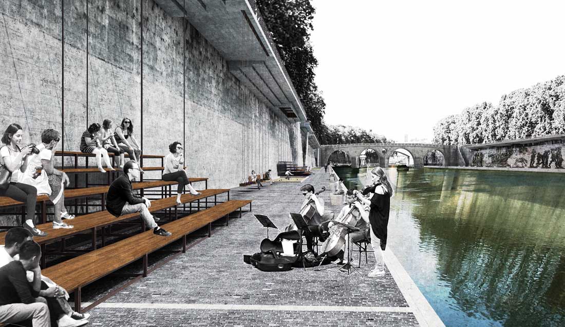 受米开朗基罗在法尔内塞宫檐口的启发,台伯河防汛墙顶部有一个栖居式的挑台,以此将城市的活力延伸至河流的区域。台伯河曾经在城市空间和活动体验上都分割了罗马,而现在成为了一个富有联系的聚集之地。