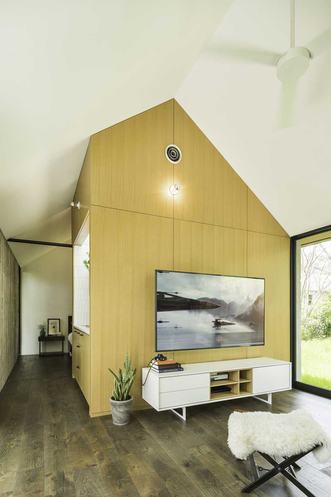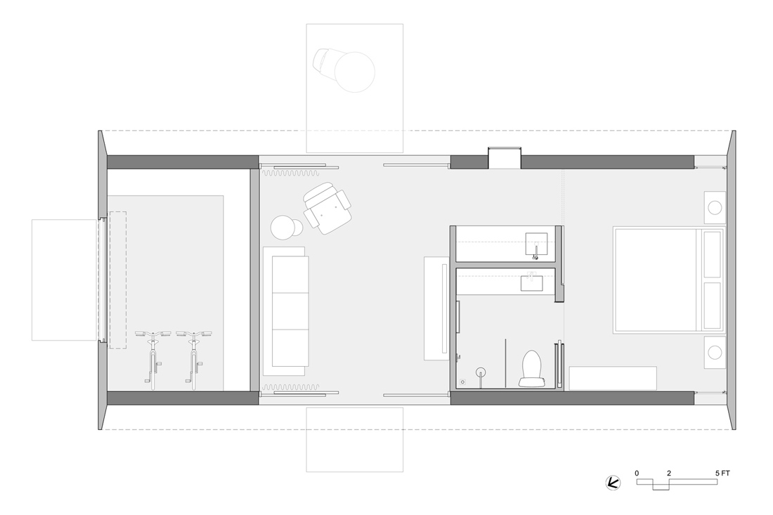 耐高温的外壳由耐用且基本的材料制成,包围着一个混凝土支架。内部空间覆盖着白橡木,并包含浴室,小厨房,媒体中心等隐私隔断。