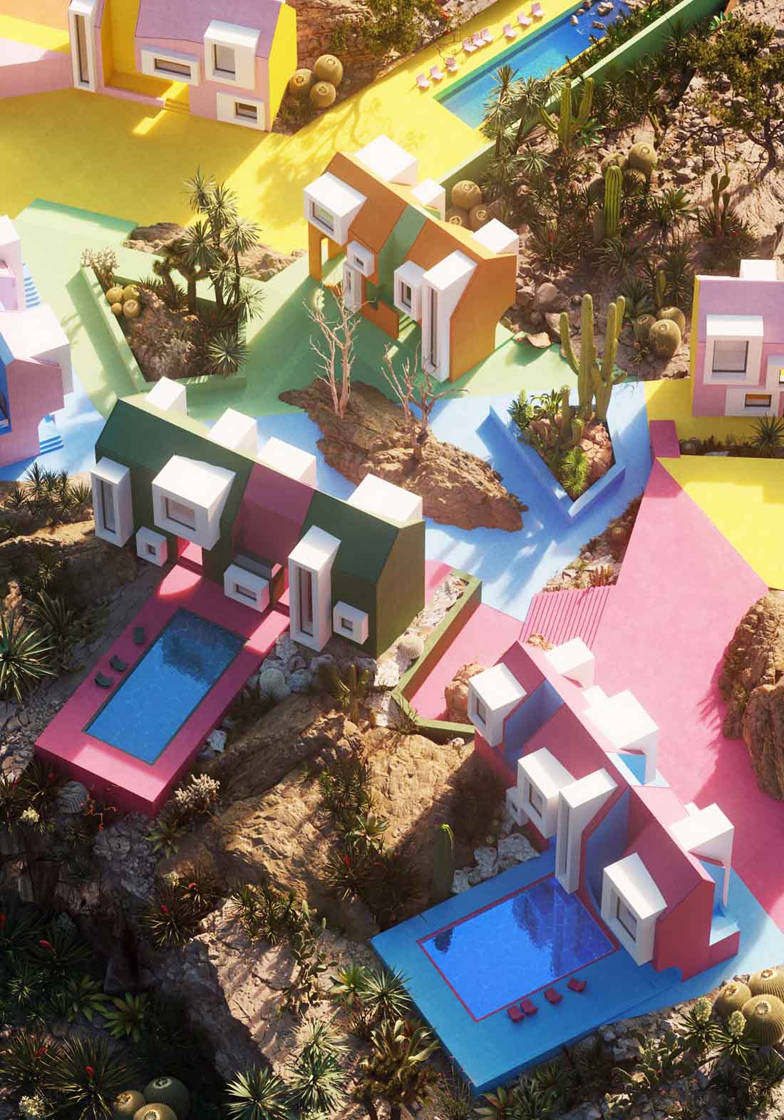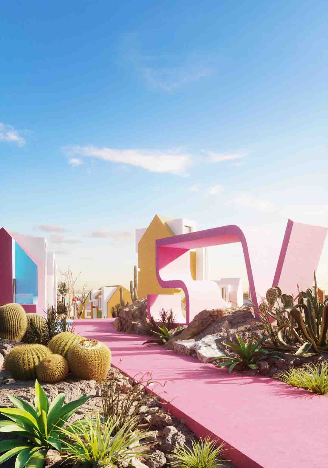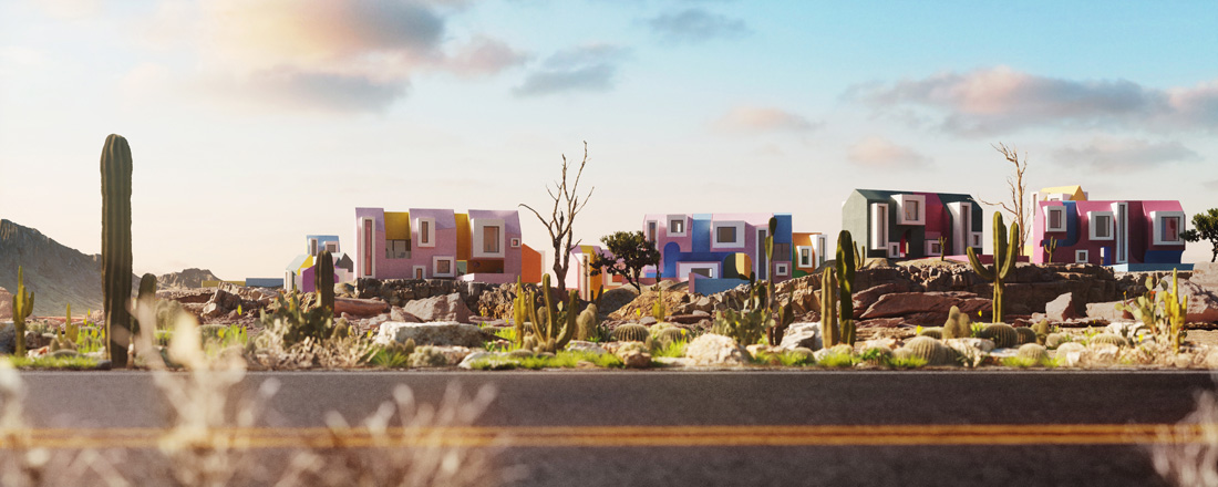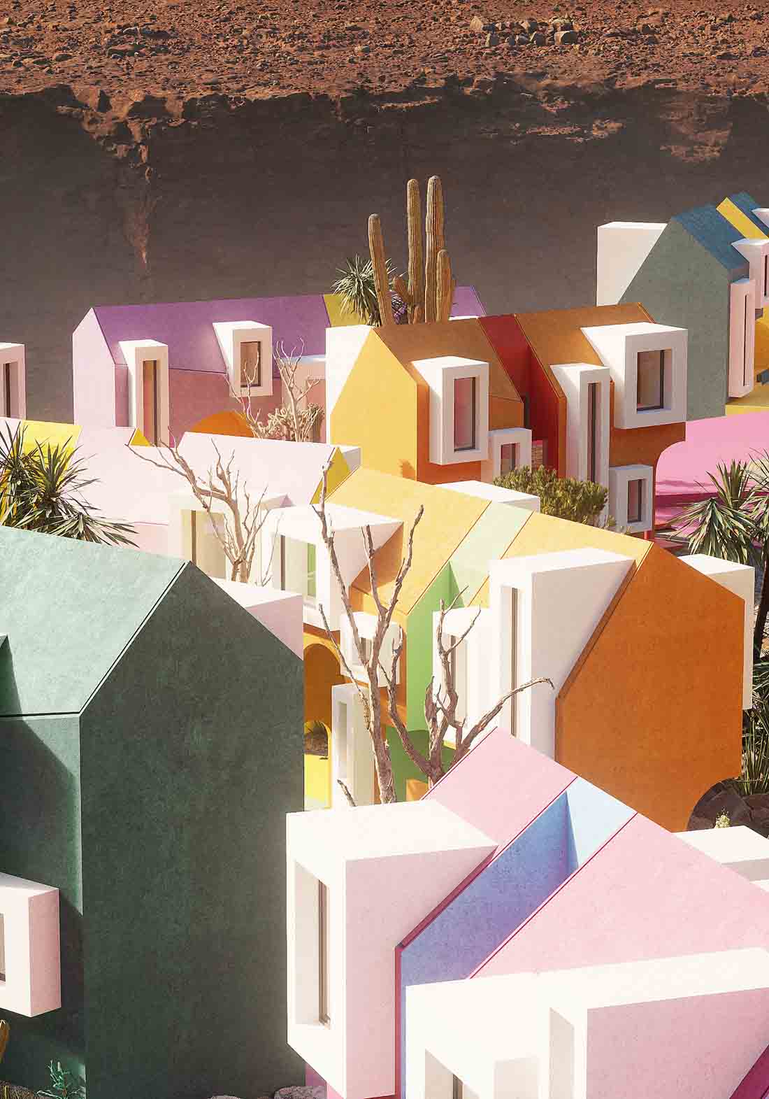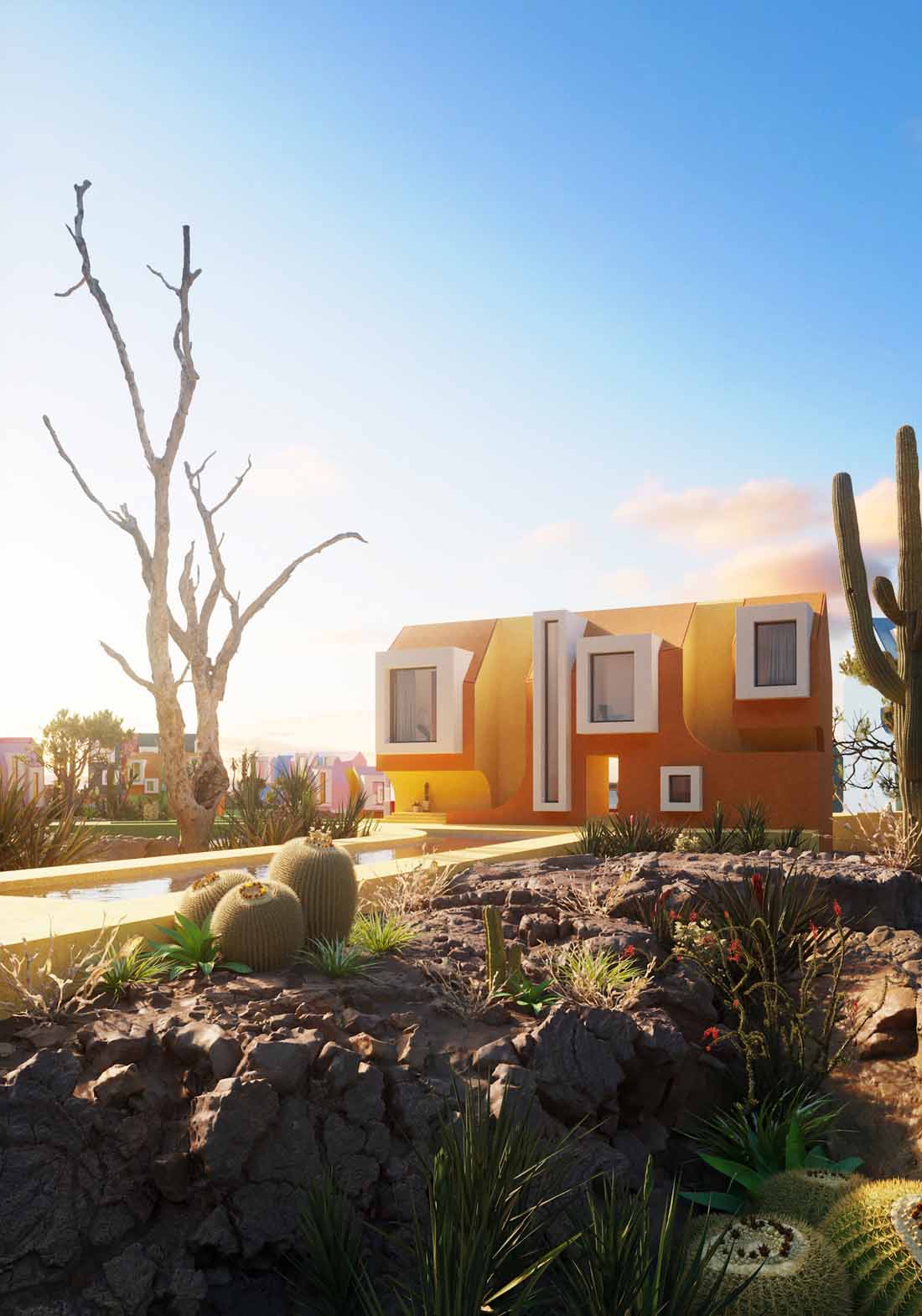 索诺拉艺术村落没有明确的系统,房子的位置也杂乱无章,每栋房子都有自己丰富多彩的道路。总的来说,房子并没有改变,只是整体尺寸改变了,有中等大小的房子,也有非常小的迷你房。在几何学方面,设计师运用了半圆形的拱门、通道、小的悬挑设计。有些房子比较高,有些比较低,所以村子里有很多小楼梯,让人感觉身处在超级马里奥的游戏里,不停的上上下下。