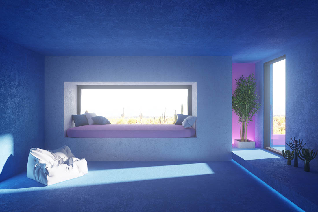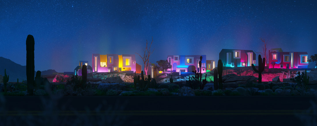 每栋房子都有与之相对应的灯光设计。到了晚上,这个地方就变成了一个超大型的灯光装置,天空被照映成不同的颜色。