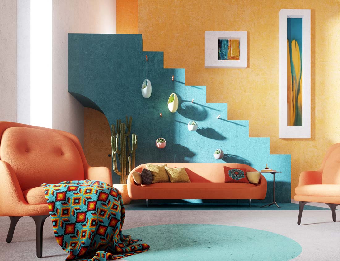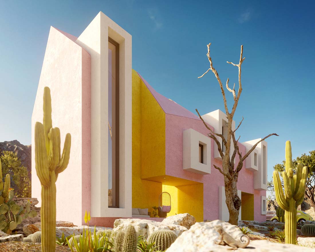 另外,住宅内部并非所有的东西都是粉色和黄色,设计师在此做了不同的颜色组合,且每个都使用了两种颜色和我们经典的白色窗框。