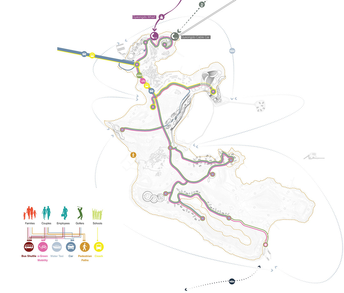 Gyeongdo岛是韩国南部半岛的一个新休闲胜地,该规划方案将自然环境置于设计的核心,旨在构建一个让文化与自然和谐共存的游览胜地。以韩国传统的花园为灵感,该方案塑造了一个生气勃勃的游览及活动场所,目的是建造一个可持续发展的休闲目的地,使人工环境和自然环境形成无缝衔接。